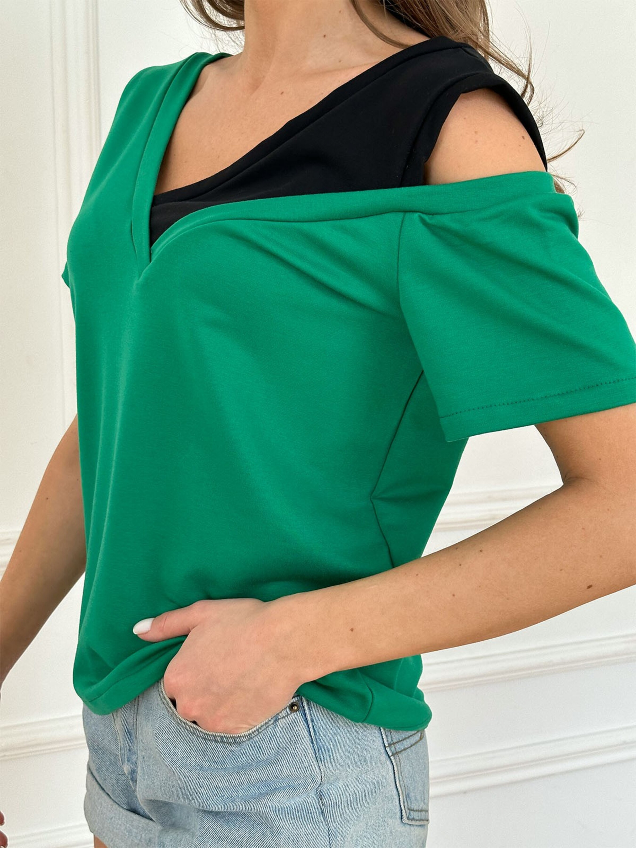 Зелена трикотажна футболка зі вставкою. Зелена повсякденна футболка прямого вільного крою виготовлена з трикотажної двонитки та чорною вставкою. Модель з короткими рукавами та V-подібною горловиною декорована принтом на рукаві. Склад: 50% бавовна, 50% поліестер. Матеріал: Подвійний. Напівобхват: Груди: S (47), M (49), L (51), XL (53), Довжина виробу - 58, Рукав - 17, Тканина: Середньої еластичності