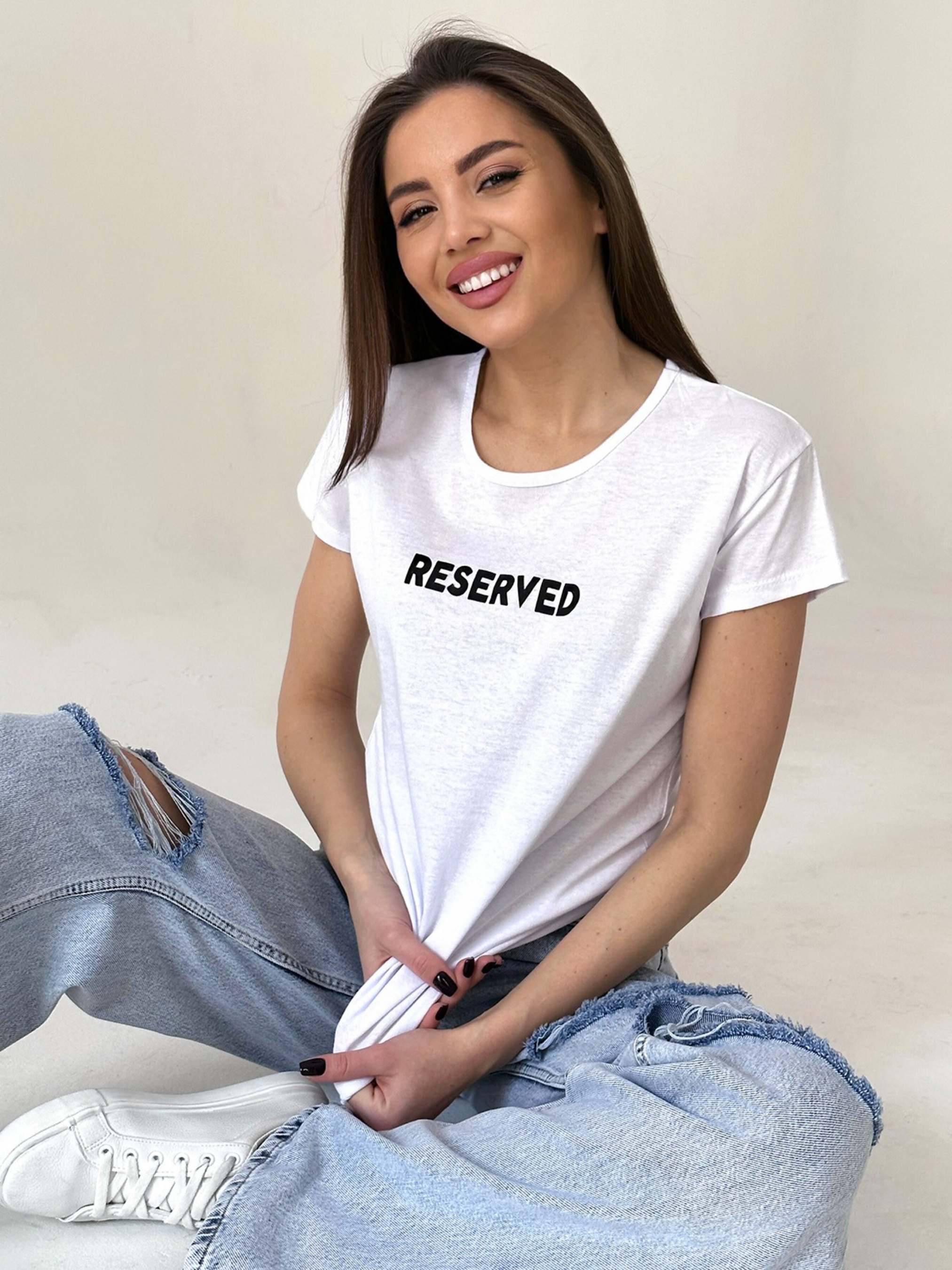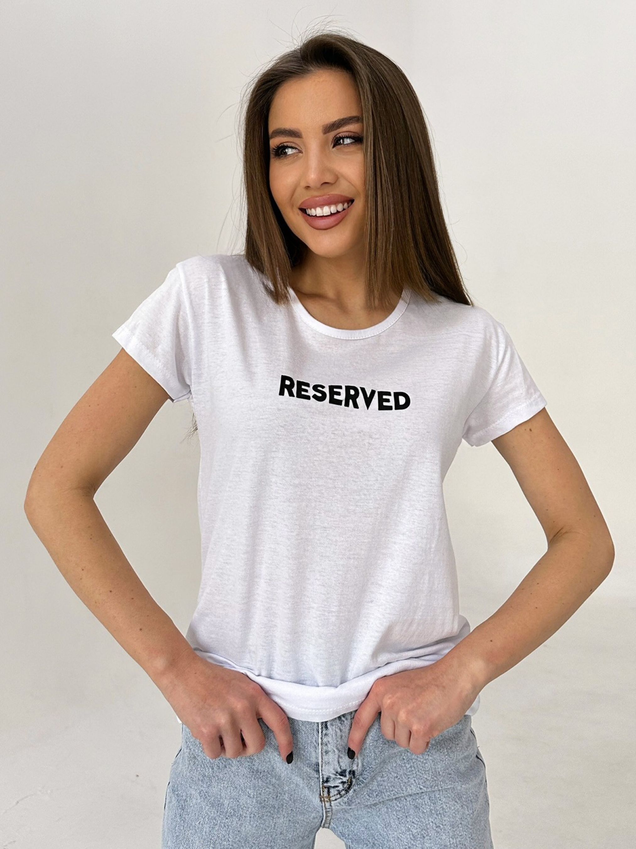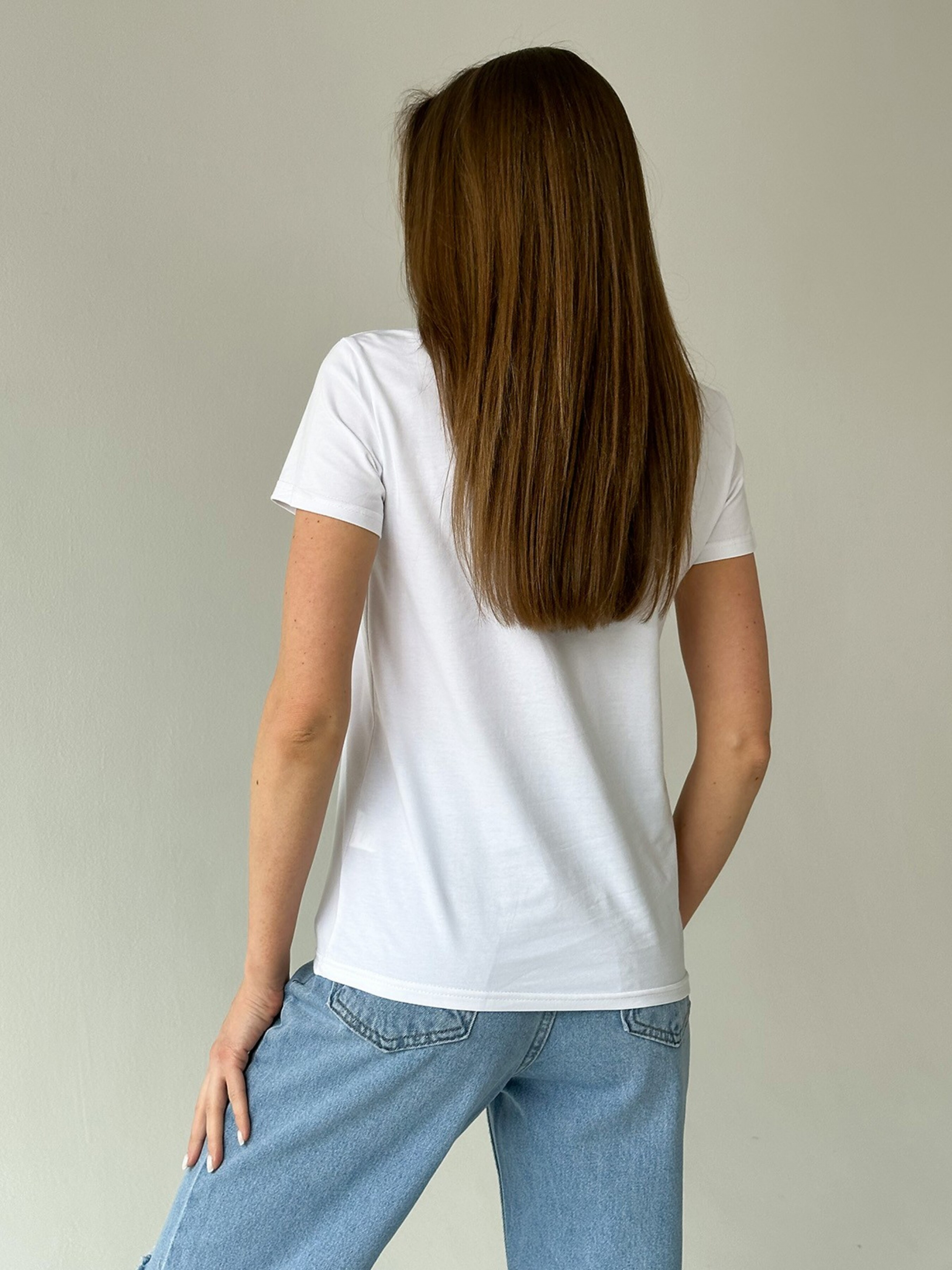 Біла трикотажна футболка з написом.