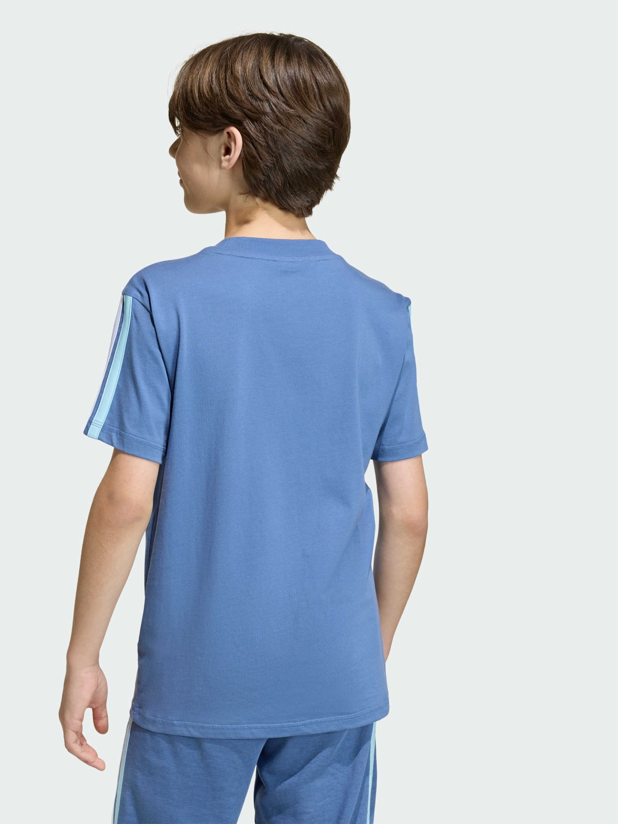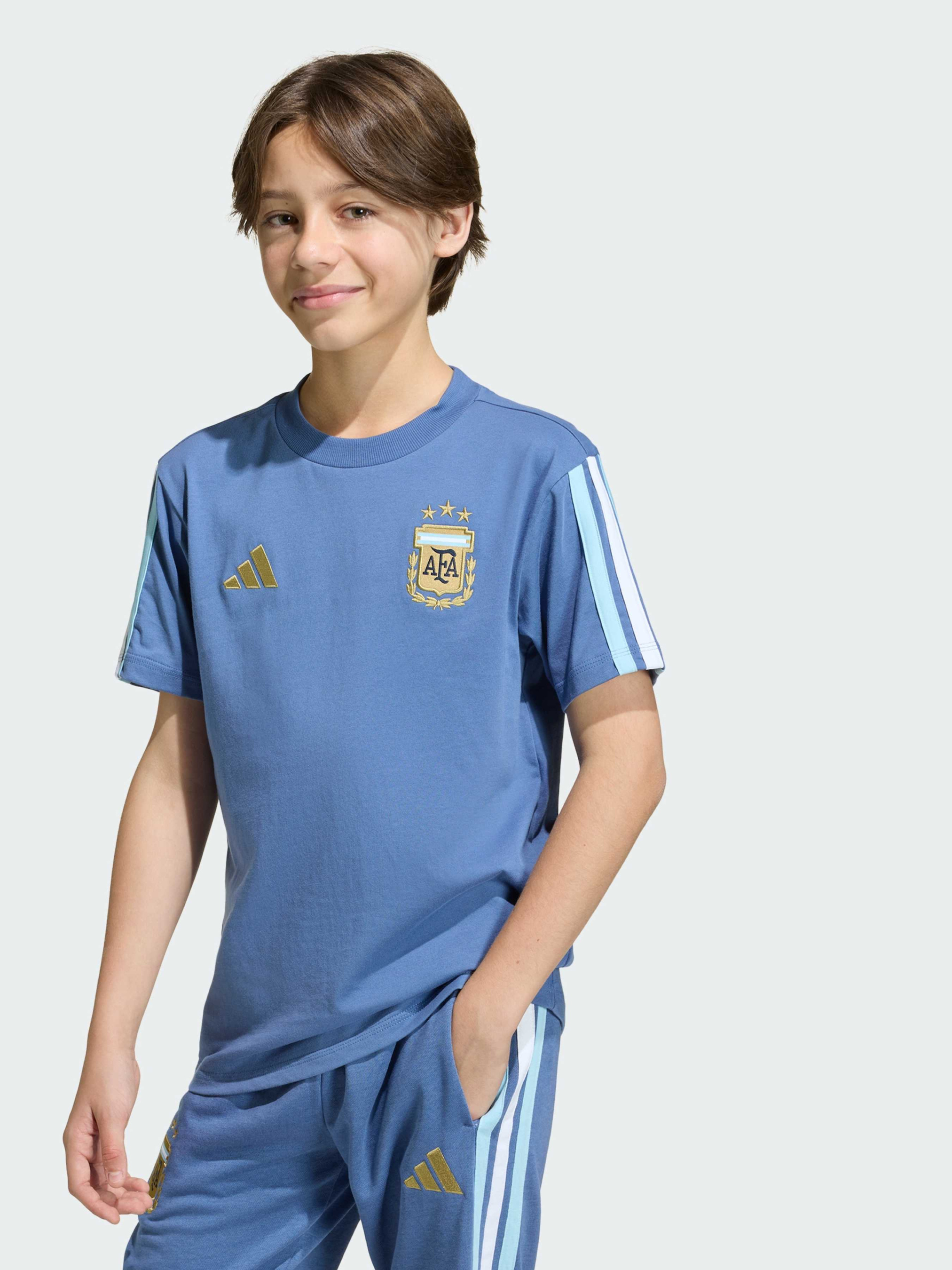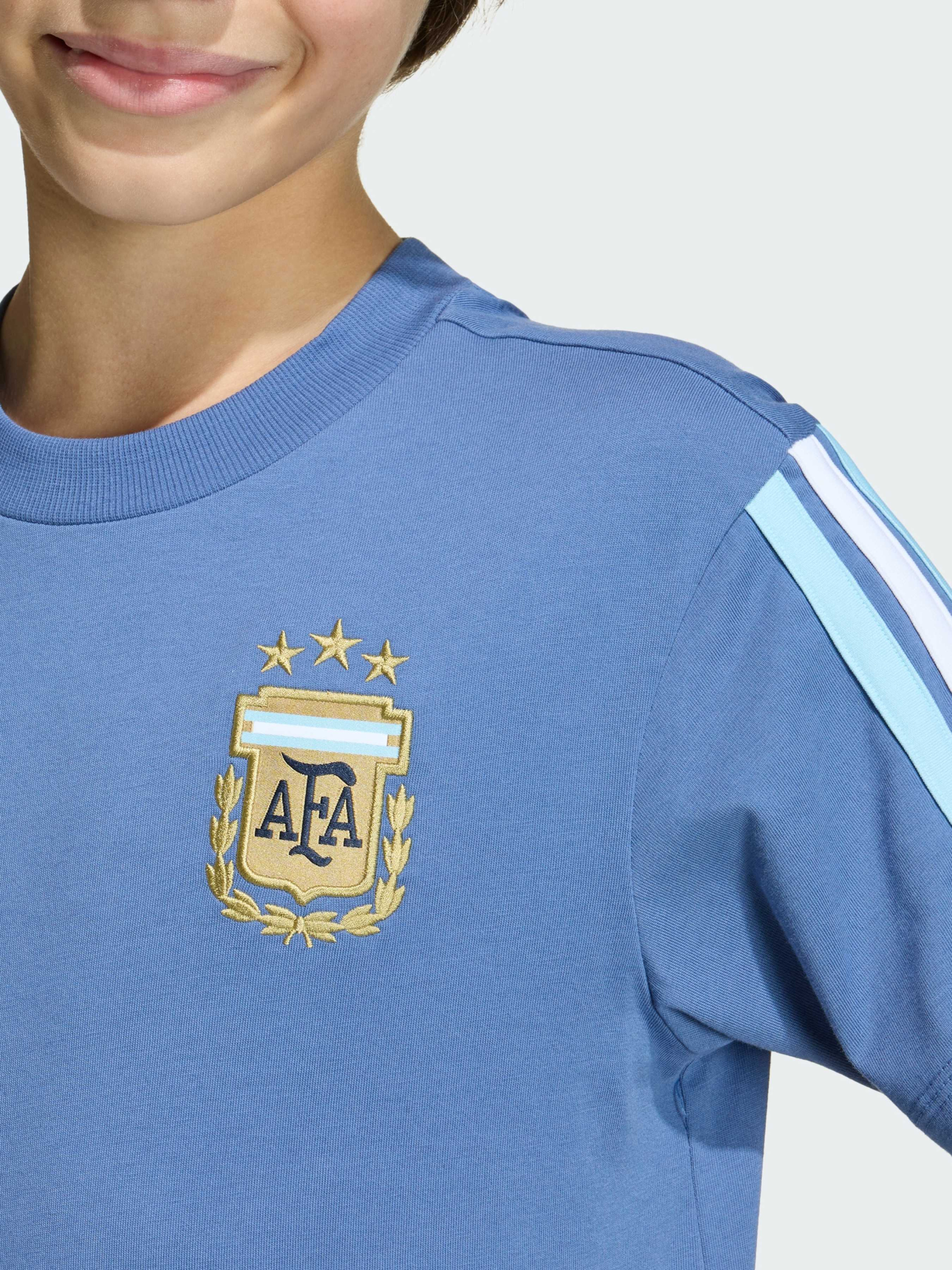 Характеристики Круглий виріз горловини Стандартний крій Тонкий трикотаж: 100% бавовна Логотип Performance Опис Футболка Argentina DNA поєднує в собі повсякденний футбольний стиль і комфорт для активних дітей. М'який і дихаючий трикотаж забезпечує свободу рухів і приємні відчуття протягом дня. Стандартний крій і круглий виріз роблять посадку зручною і універсальною. Фірмові три смужки, логотип adidas і герб збірної Аргентини з трьома зірками чемпіонів світу підкреслюють гордість за команду і додають спортивного характеру в повсякденний образ.