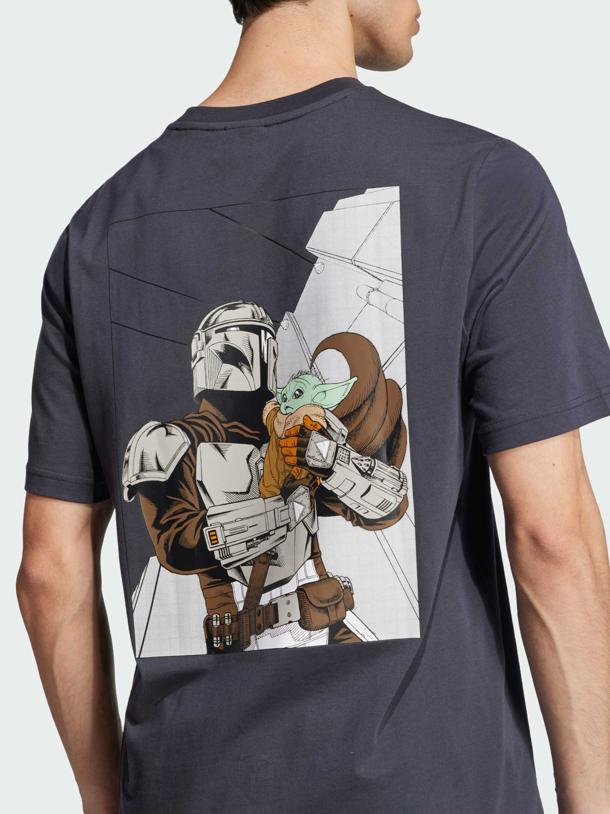 Характеристики 100% бавовна Графіка The Mandalorian™ на спині © і ™ Lucasfilm Ltd. Всі права захищені Рифлений круглий виріз горловини Стандартний крій Опис Стань частиною епічної історії Star Wars™ у цій футболці adidas. У м'якій бавовняній тканині тобі буде комфортно, коли ти досліджуєш космічні простори або відпочиваєш удома. Графіка на спині зображує Мандалорця™ та улюбленого персонажа Грогу, готових до нових пригод. Йде розмір в розмір. Ми радимо замовити цю модель в твоєму звичайному розмірі.