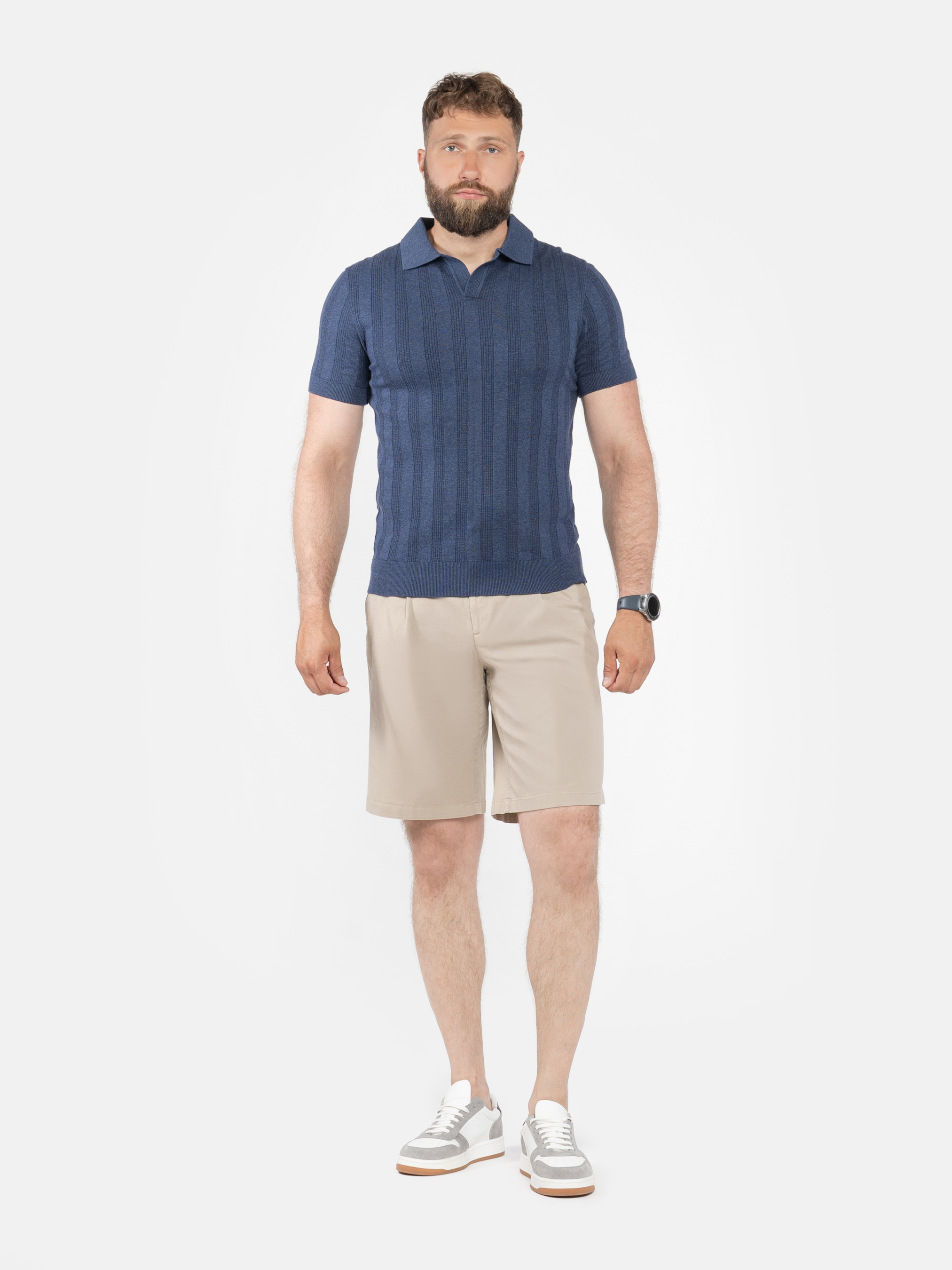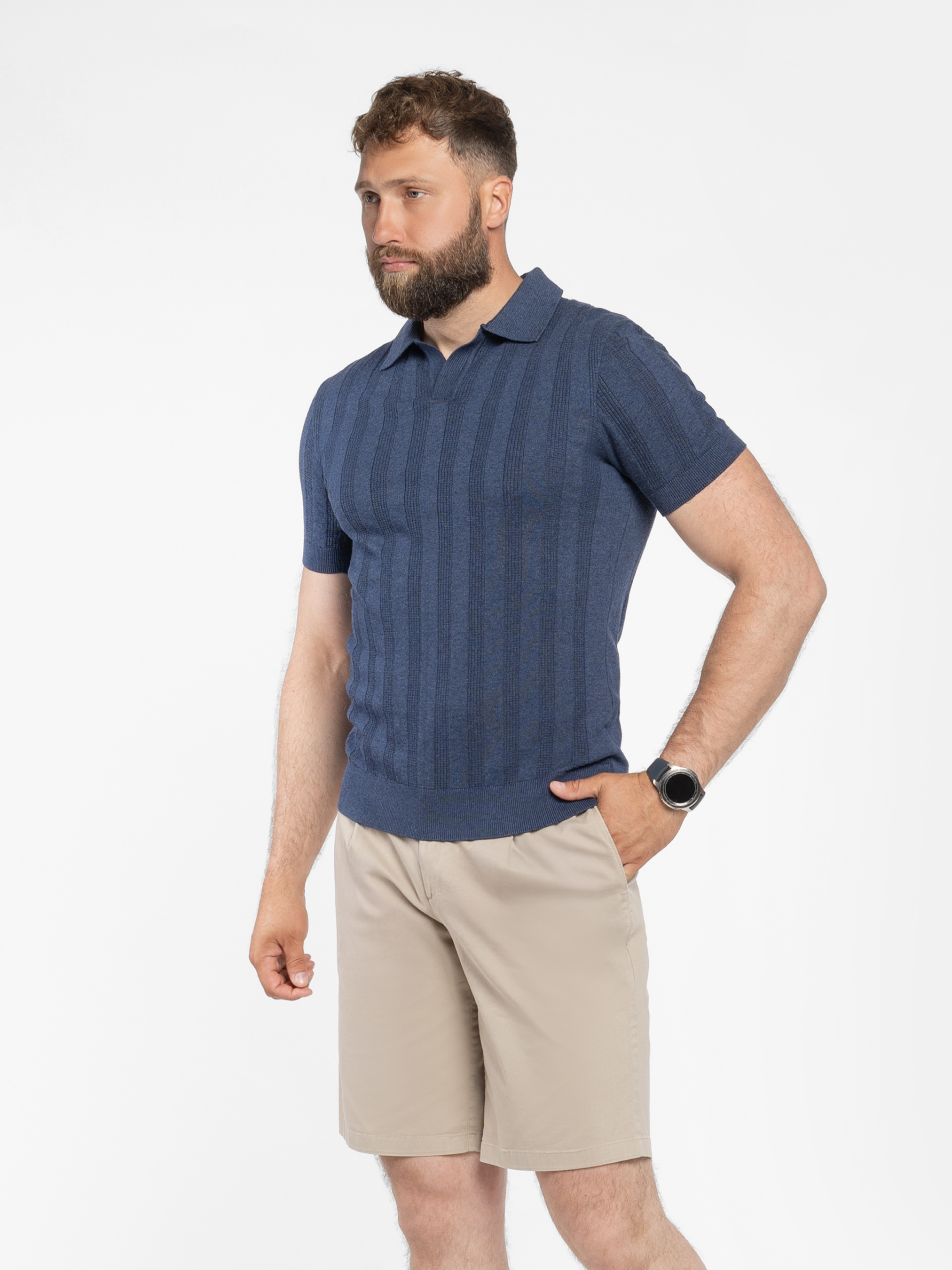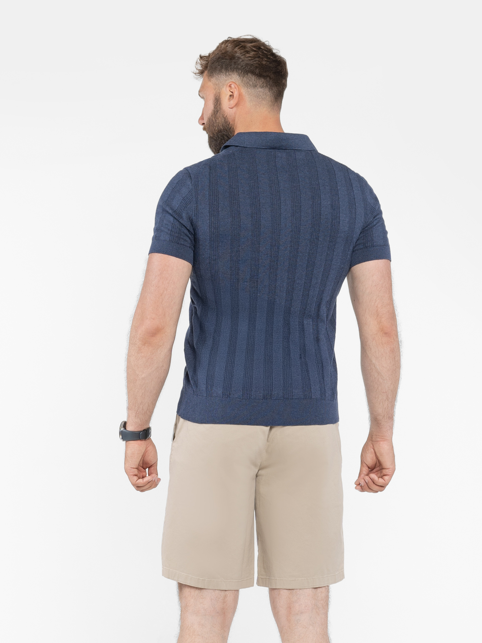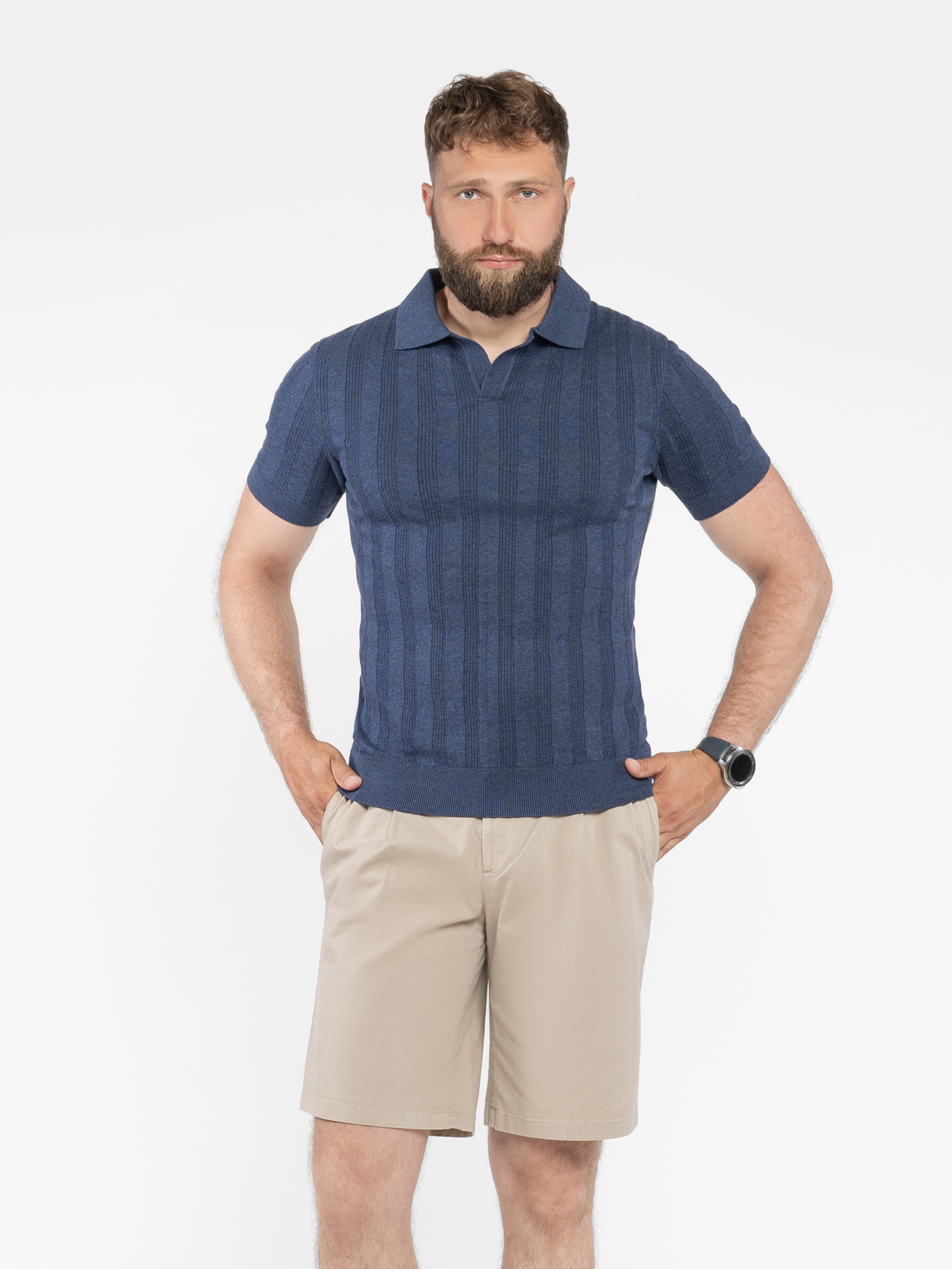 Чоловіче поло Arber темно-синього кольору у текстурну смужку, пов’язане з тонкої пряжі 100% високоякісної бавовни. Легка в’язка з натуральної бавовни приємна на дотик і комфортна для шкіри. Завдяки тонкій текстурі, поло добре пропускає повітря. Сучасний крій та елегантний дизайн роблять цю модель універсальною, легко поєднується з брюками або джинсами, створюючи стильний і невимушений образ. Модель на фото: розмір 48, зріст 188 см, параметри: 97/86/96.