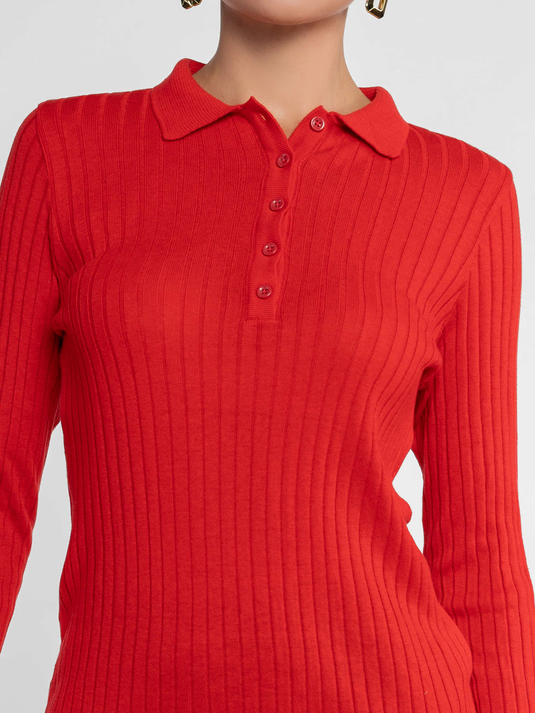 Жіноче поло Arber червоного кольору в рубчик, пов'язане з додаванням натуральної бавовни, м’який трикотаж ніжно облягає фігуру і не сковує рухів. Застібка на п’ять ґудзиків та довгий рукав, створюють лаконічний крій та роблять модель універсальною для щоденних casual-луків або layering-комбінацій. Модель на фото у розмірі 42. Зріст: 178 см. Параметри: 89/60/90
