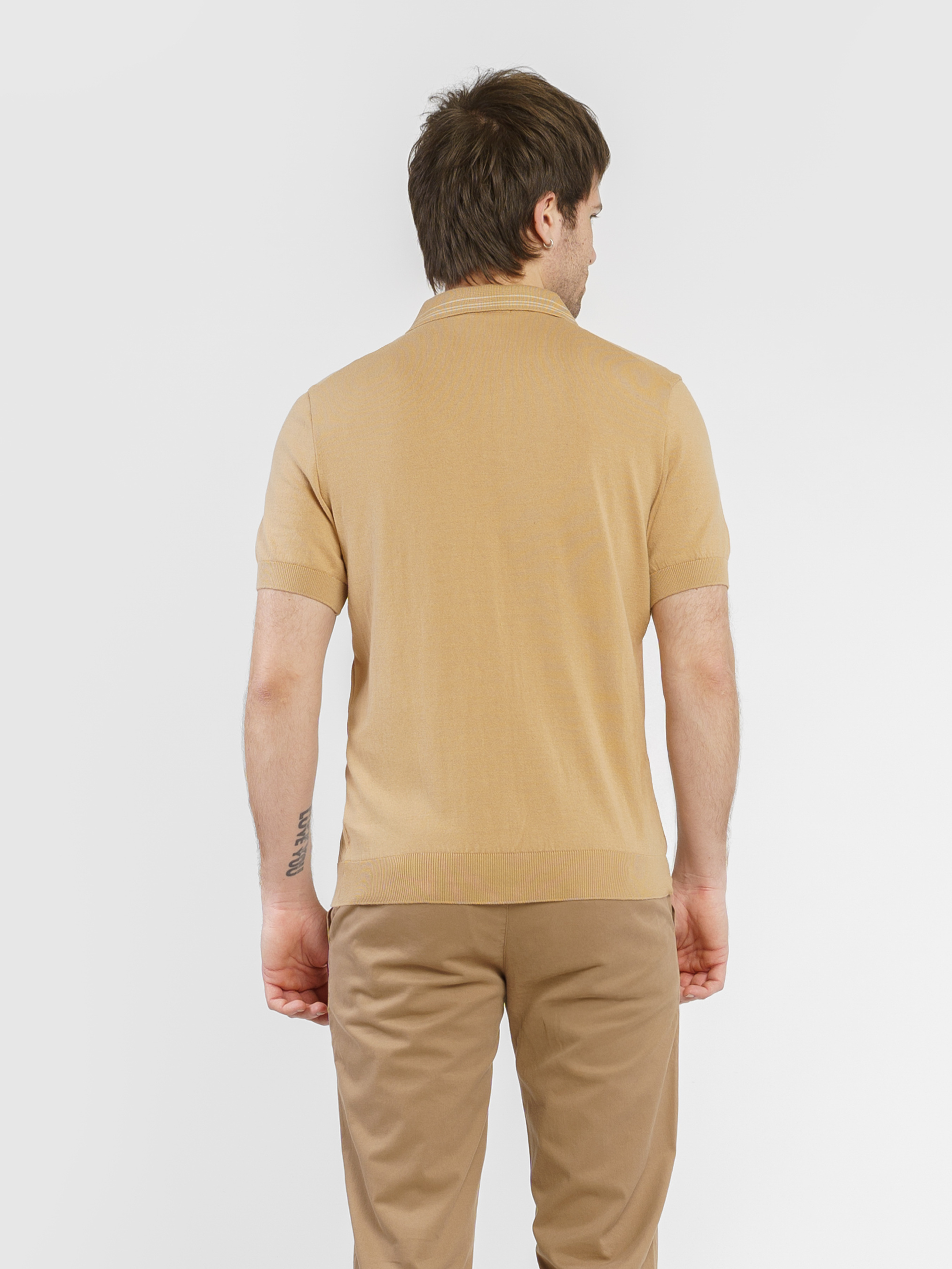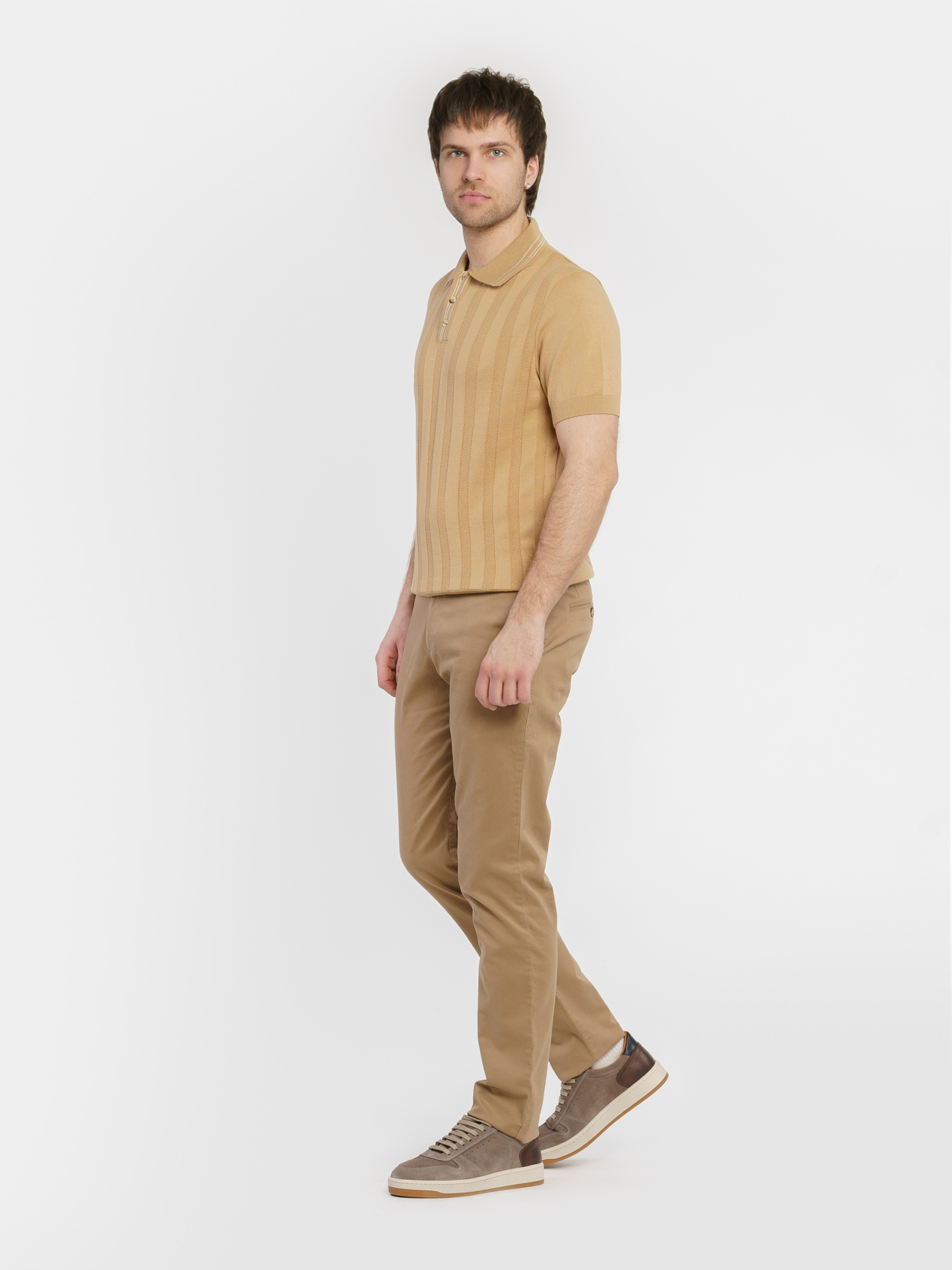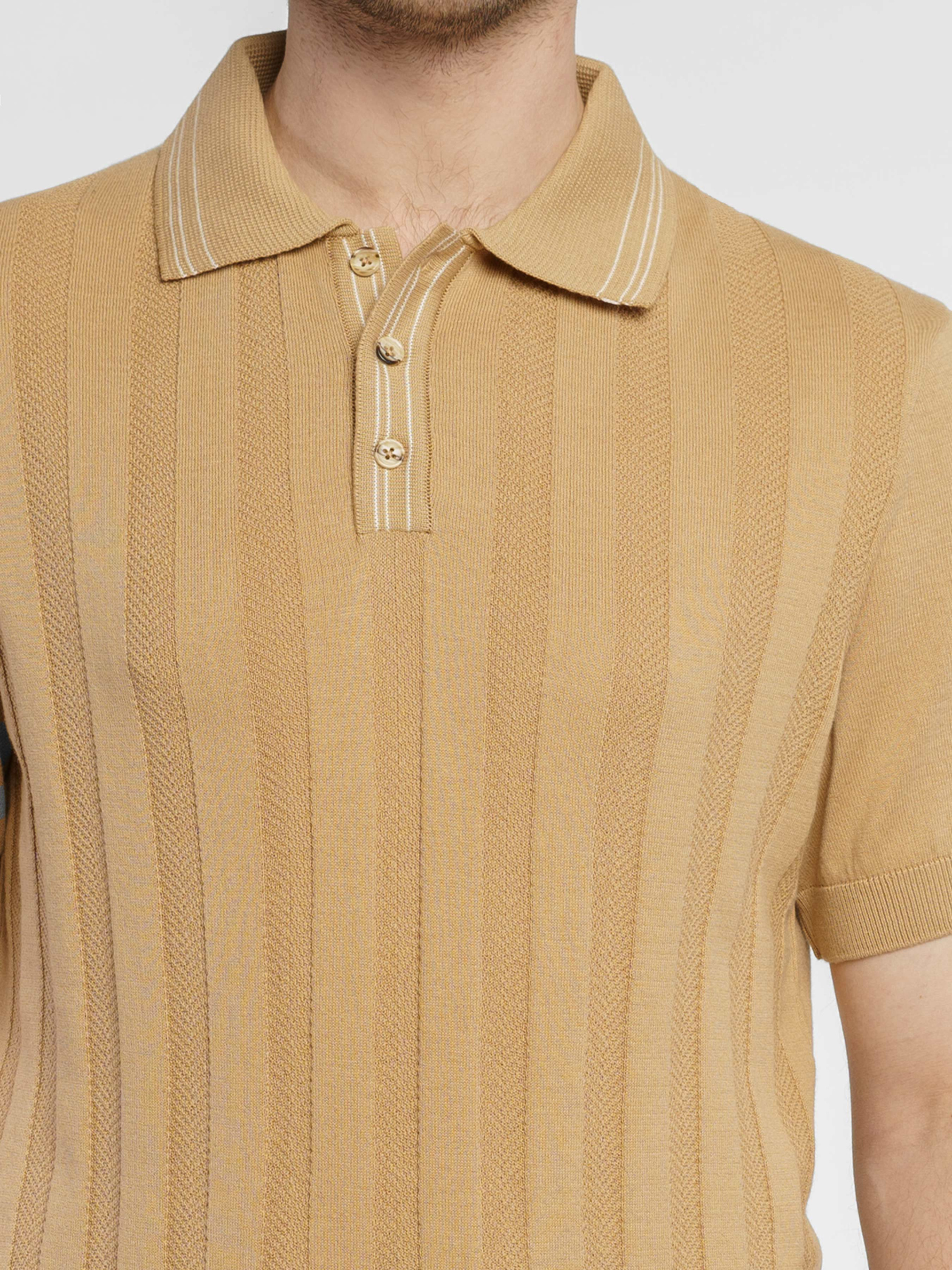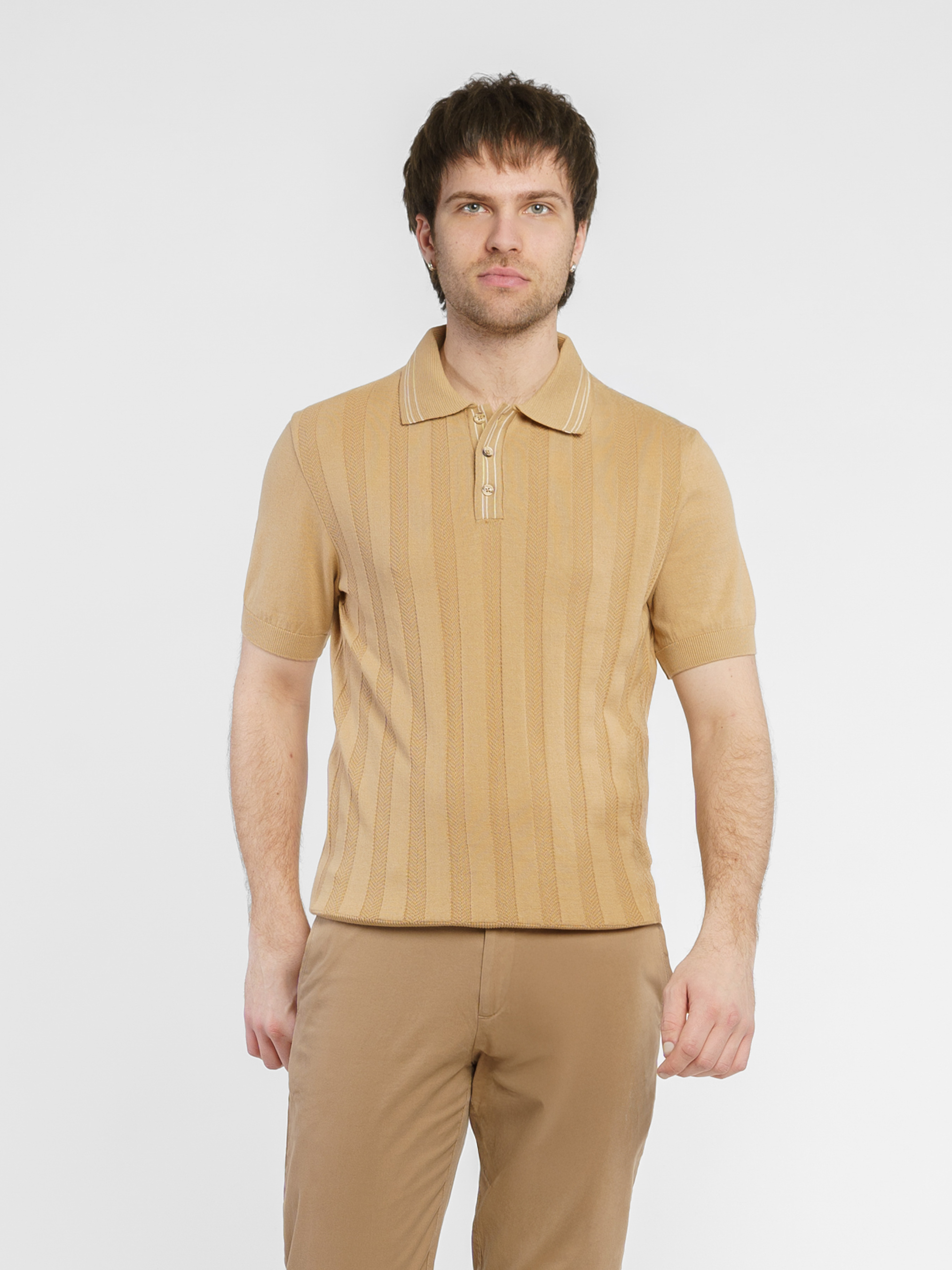 Чоловіче поло Arber бежевого кольору у текстурну смужку, створене з найтоншої пряжі високоякісної бавовни. Натуральна тканина забезпечує відчуття легкості та виняткової м’якості, приємної до тіла. Завдяки своїй тонкій текстурі поло відмінно пропускає повітря, гарантуючи комфорт протягом усього дня. Сучасний крій та елегантний дизайн роблять цю модель універсальною — вона легко поєднується з брюками або джинсами, створюючи стильний і невимушений образ. Модель на фото у розмірі 48. Зріст: 188 см. Параметри: 97/78/96.