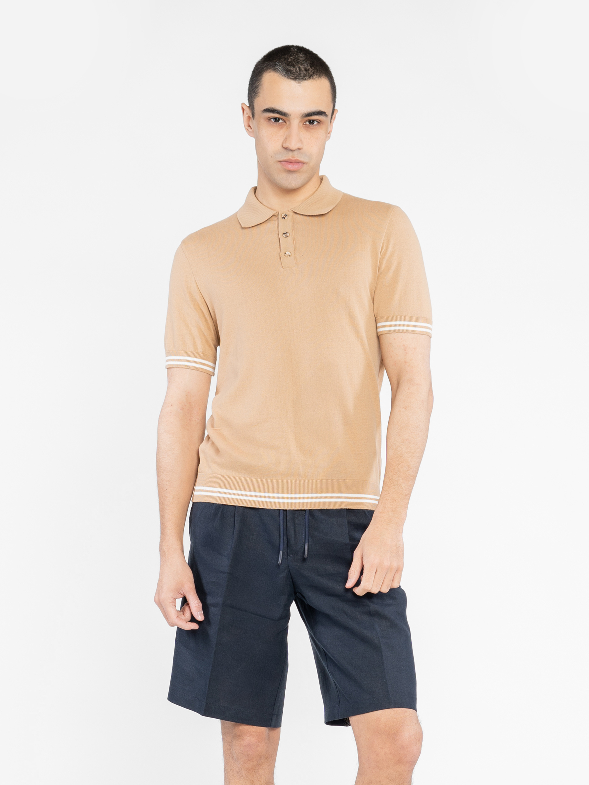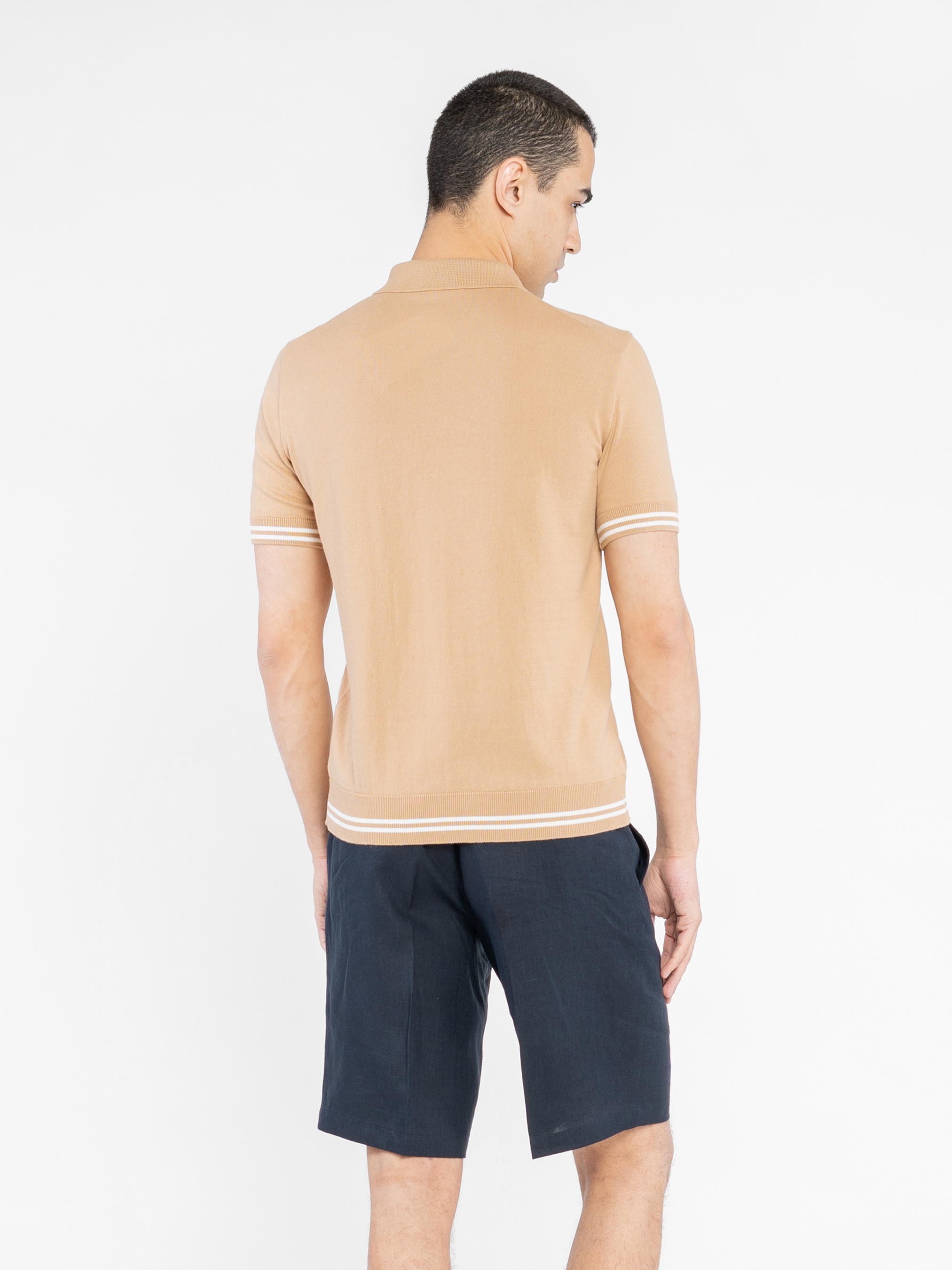 Чоловіче поло Arber бежевого кольору, створене з найтоншої пряжі високоякісної бавовни. Натуральна тканина забезпечує відчуття легкості та виняткової м’якості, приємної до тіла. Завдяки своїй тонкій текстурі поло відмінно пропускає повітря, гарантуючи комфорт протягом усього дня. Сучасний крій підкреслює елегантність моделі, а манжети з контрастною білою смужкою додають стильного акценту. Це поло легко поєднується як з брюками, так і з джинсами, створюючи невимушений і вишуканий образ. Модель на фото у розмірі 48. Зріст: 188 см. Параметри: 97/78/96.
