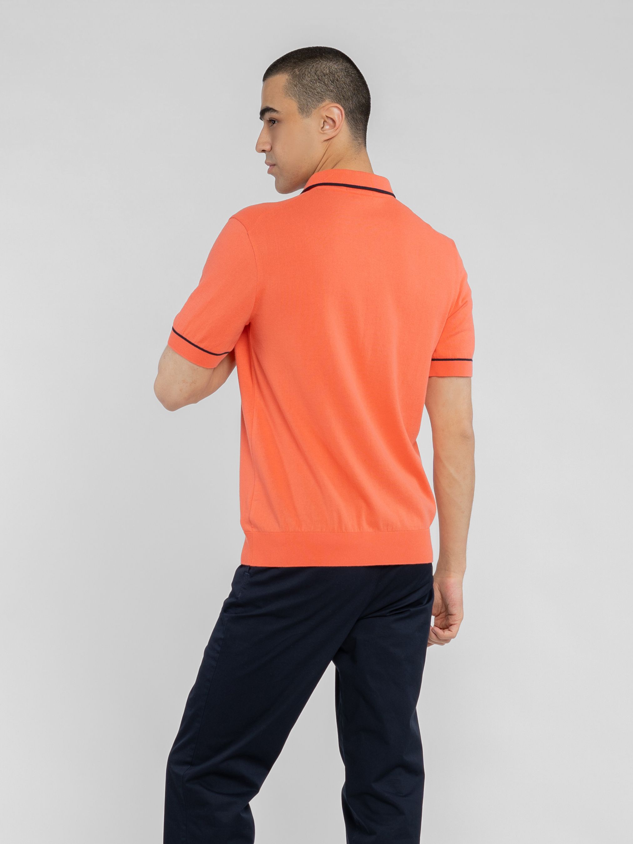 Чоловіче поло Arber коралового кольору, пов’язане з найтоншої пряжі високоякісної бавовни. Натуральні волокна забезпечують відчуття легкості та виняткової м’якості, приємної до тіла. Завдяки своїй тонкій текстурі поло відмінно пропускає повітря, гарантуючи комфорт протягом усього дня. Сучасний крій підкреслює елегантність моделі, а манжети з контрастною чорною смужкою додають стильного акценту. Це поло легко поєднується як з брюками, так і з джинсами, створюючи невимушений і вишуканий образ. Модель на фото у розмірі 48. Зріст: 188 см. Параметри: 97/78/96.