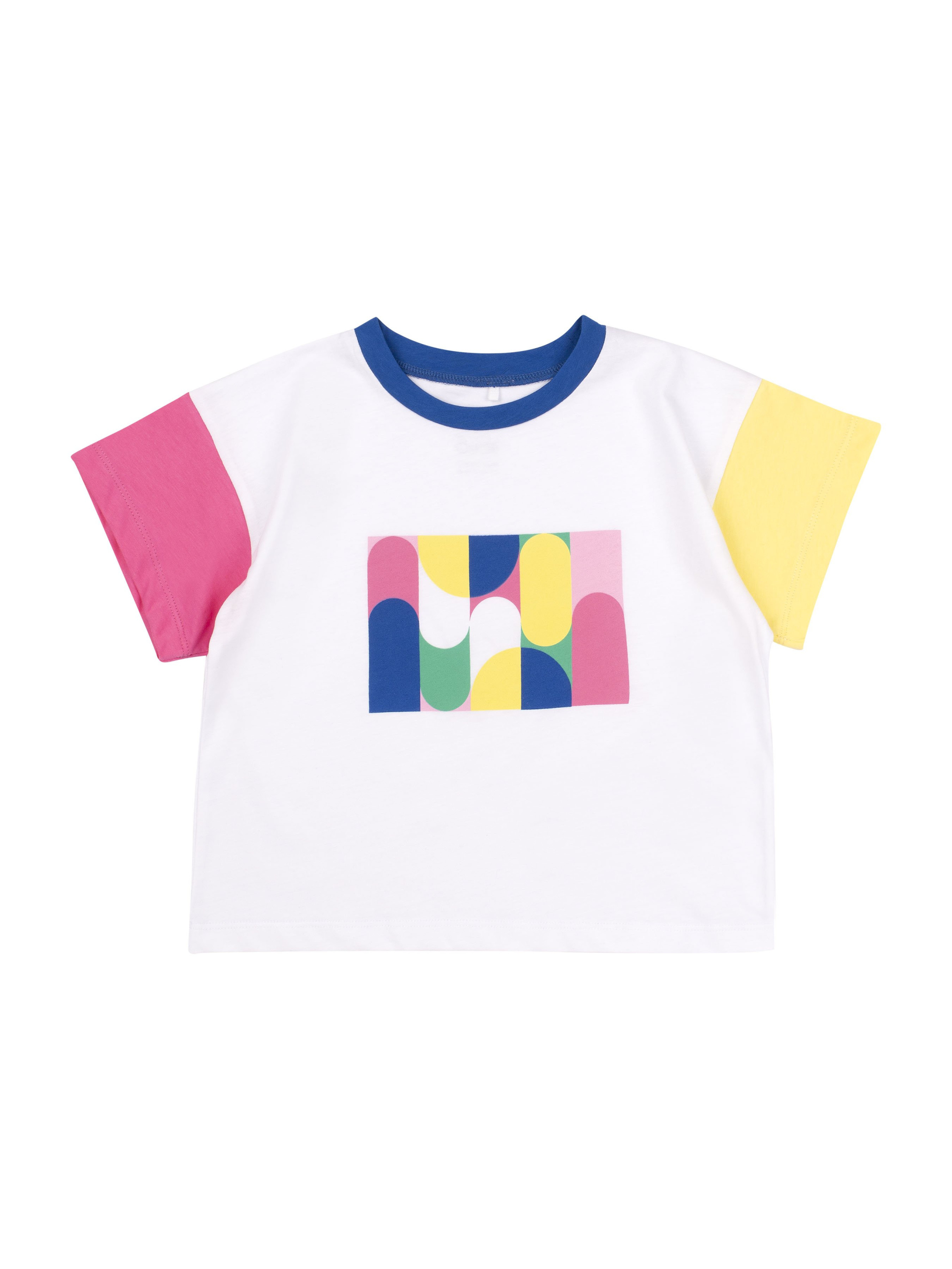 Футболка прямого силуету, з різнокольоровими рукавами. Рукав вшивний, короткий. Перед оздоблений друком. Горловина оброблена кантом.