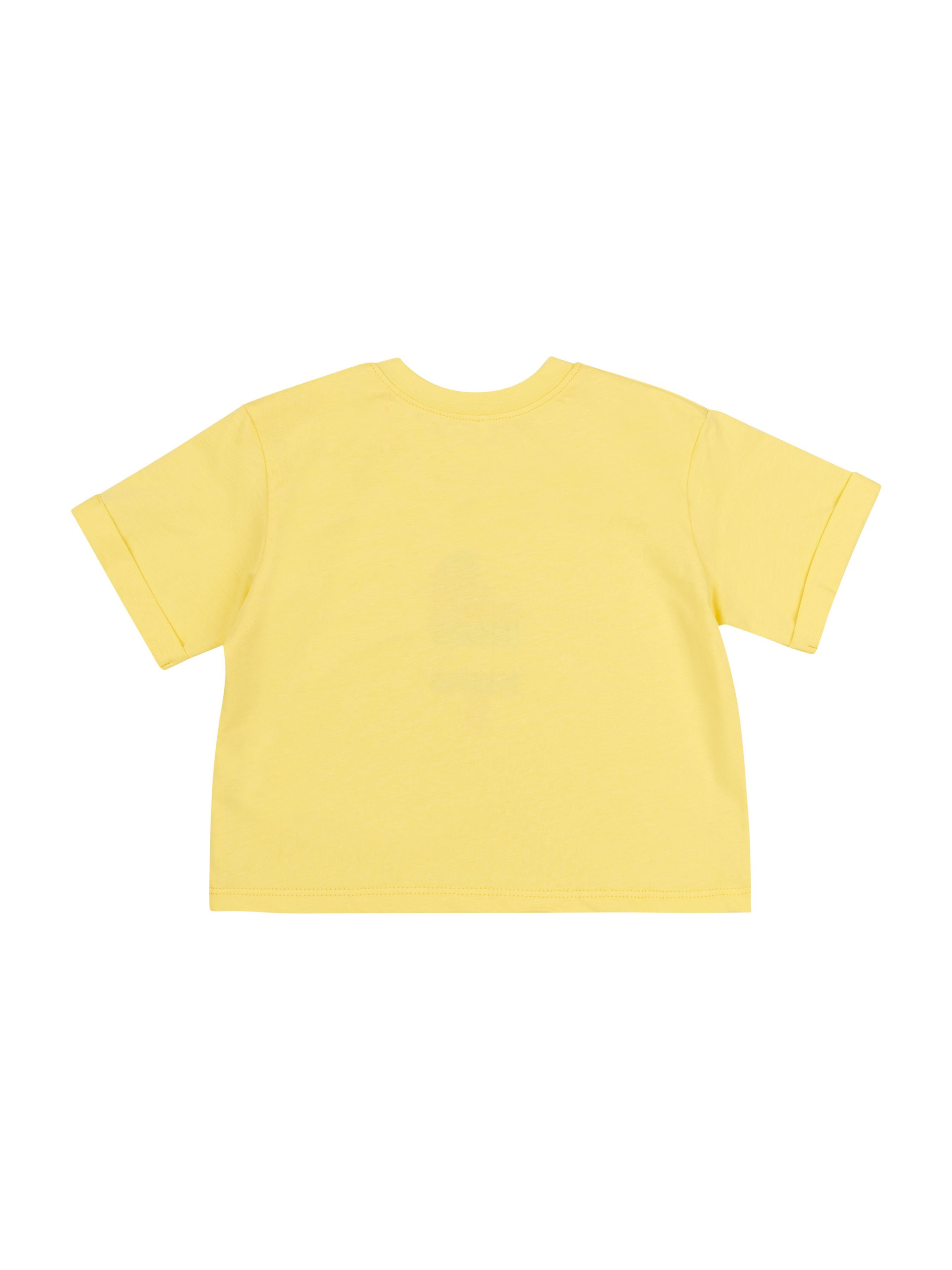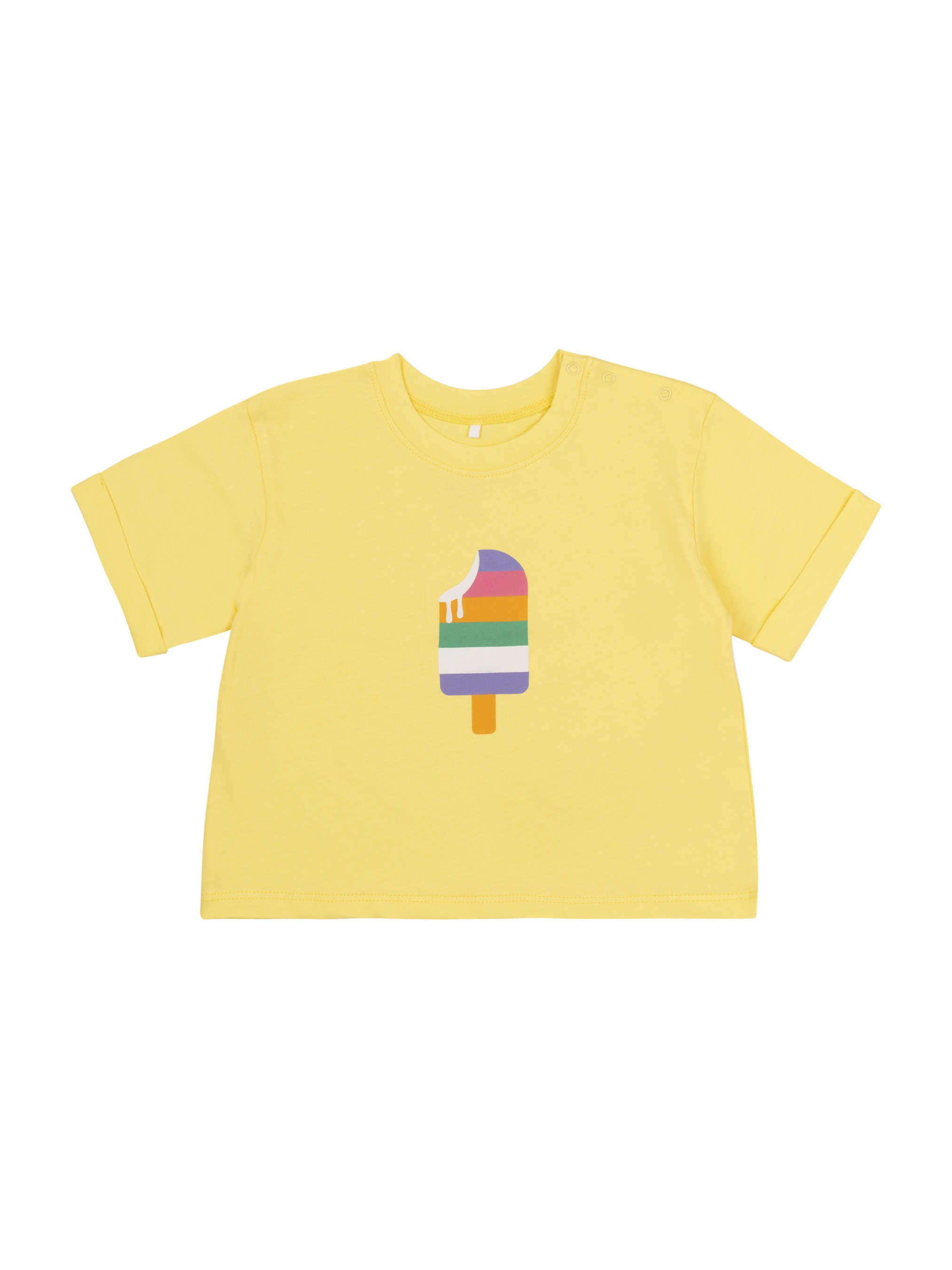 Футболка прямого силуету. Тканина однотонна. Рукав вшивний, короткий, з манжетом. Перед оздоблений друком. На лівому плечі застібка на кнопки. Горловина оброблена кантом.