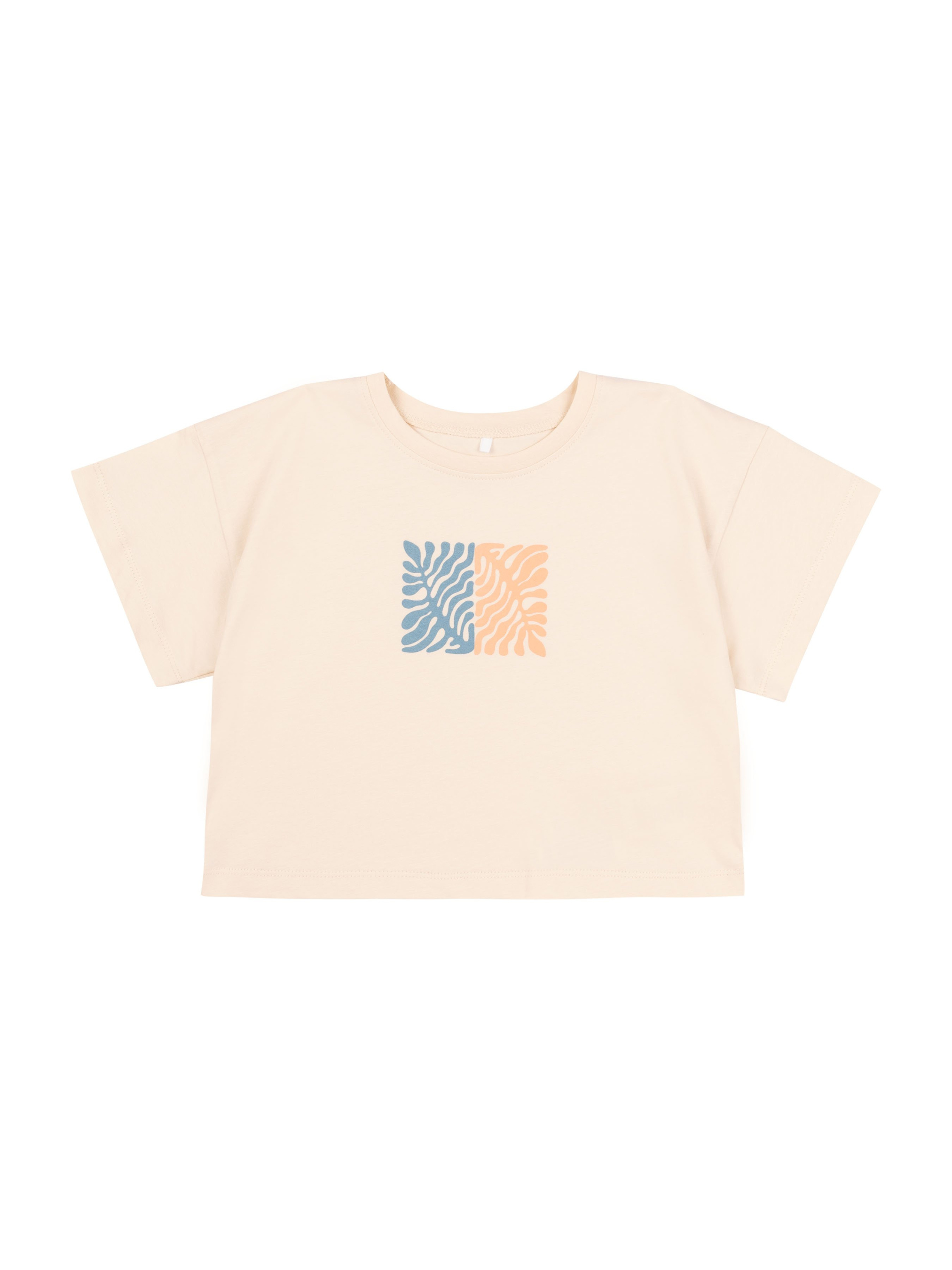 Футболка прямого силуету. Тканина однотонна. Рукав вшивний, короткий. Перед оздоблений друком. Горловина оброблена кантом.