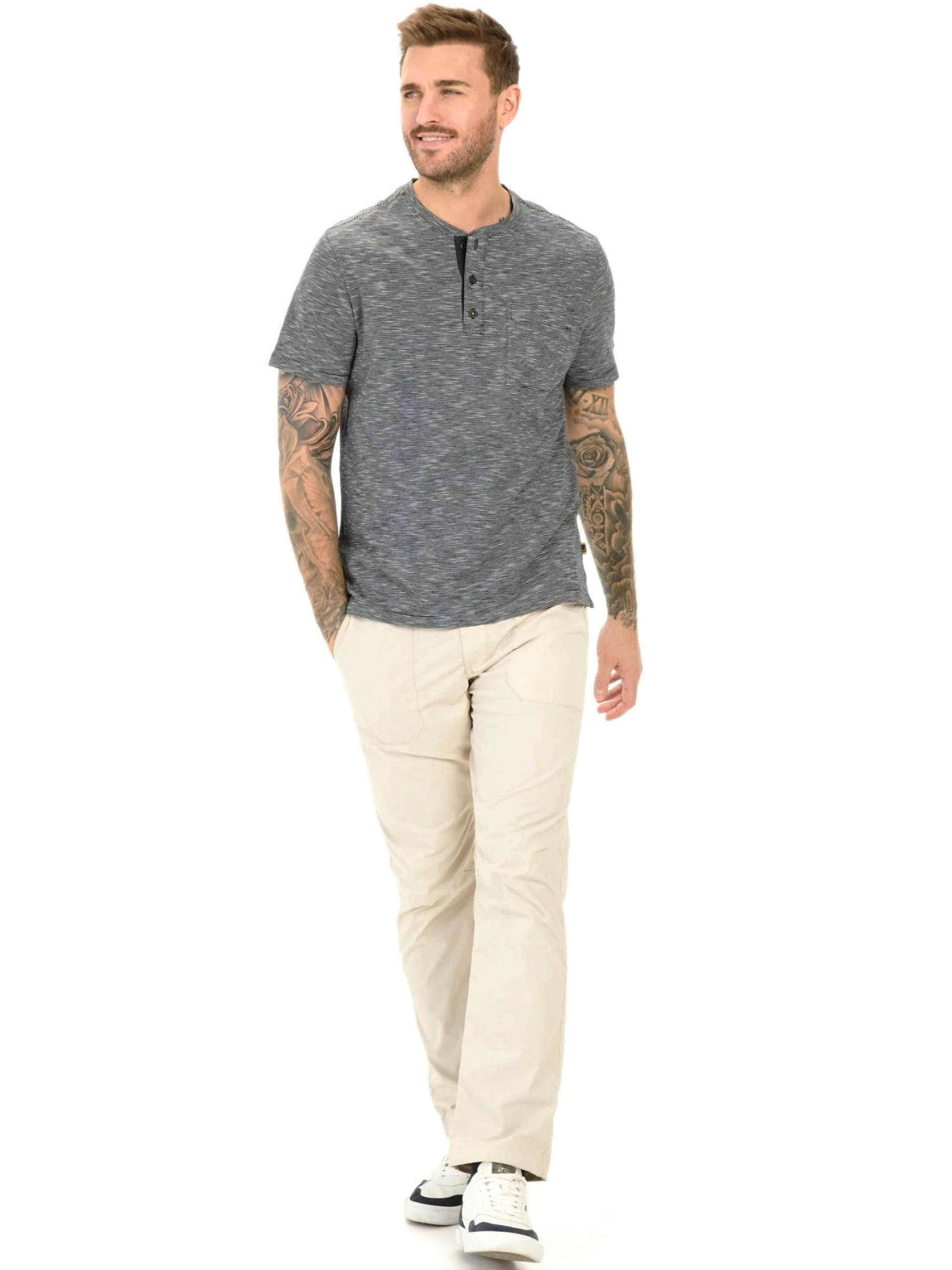 Футболка Henley 1/2 Arm – це поєднання комфорту, практичності та стильного дизайну, створене для повсякденного використання. Виготовлена з чистої бавовни, вона має м’яку, повітропроникну текстуру, що забезпечує приємні тактильні відчуття та комфорт протягом усього дня. Класичний круглий виріз із застібкою на ґудзиках додає моделі характерного вигляду. Нагрудна кишеня не тільки додає стильного штриха, а й забезпечує додаткову функціональність, дозволяючи зберігати дрібниці під рукою. Завдяки бічним розрізам футболка дарує ще більше свободи рухів, що робить її ідеальним вибором для активного способу життя. Дизайн доповнює фірмовий логотип camel active, який підкреслює якість і увагу до деталей. Завдяки класичному прямому крою, ця футболка чудово поєднується з джинсами, шортами чи чіносами, створюючи як розслаблений, так і більш елегантний образ. Незамінний елемент гардероба для чоловіків, які цінують стиль, якість і комфорт у кожній деталі.