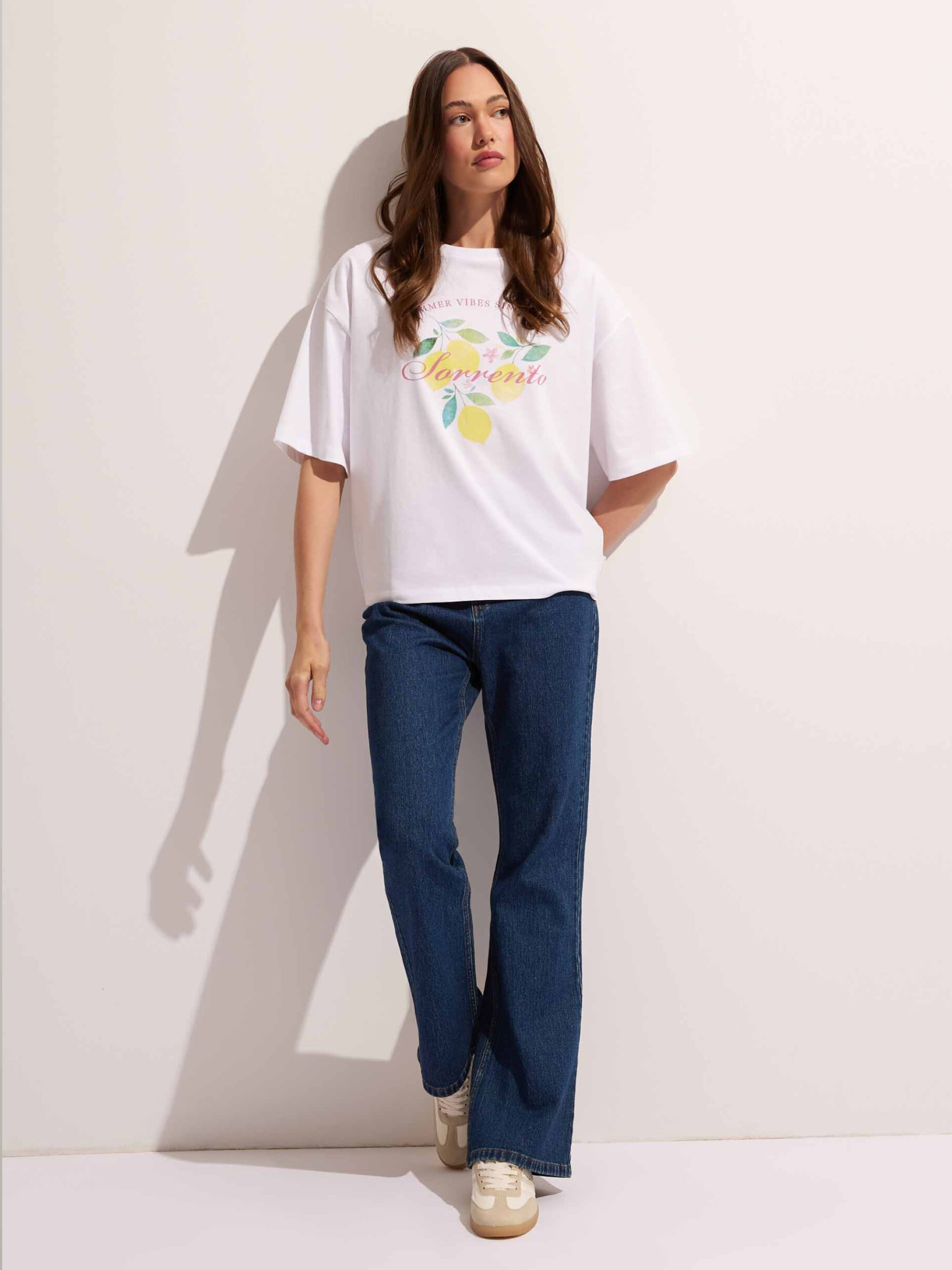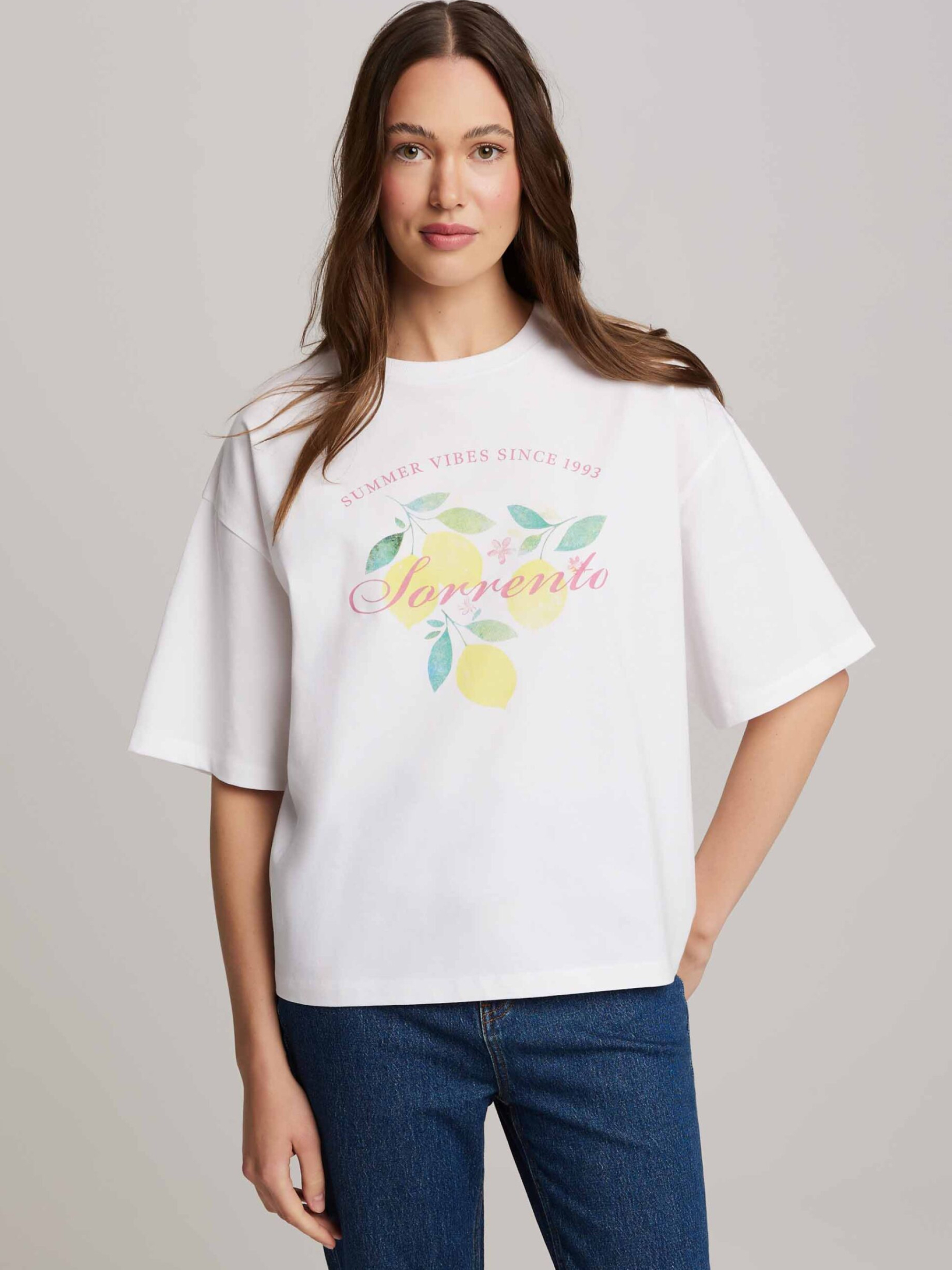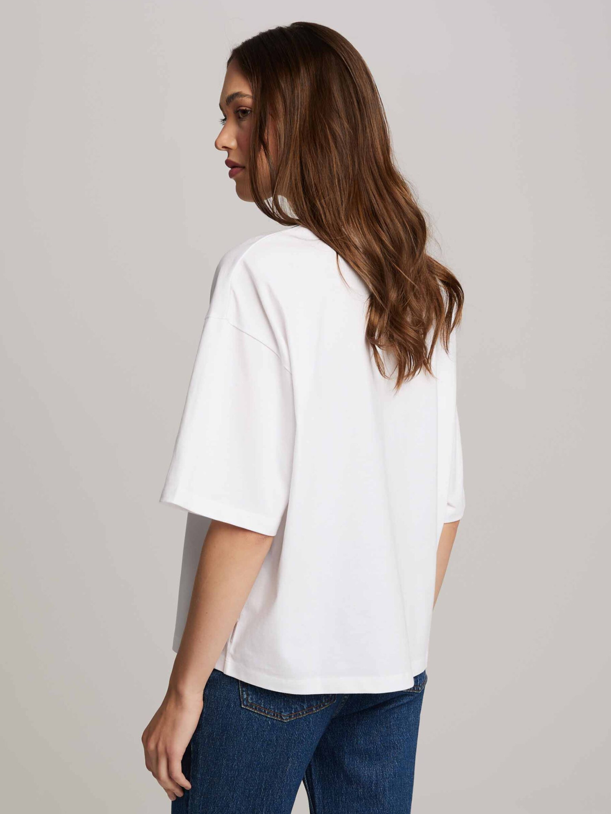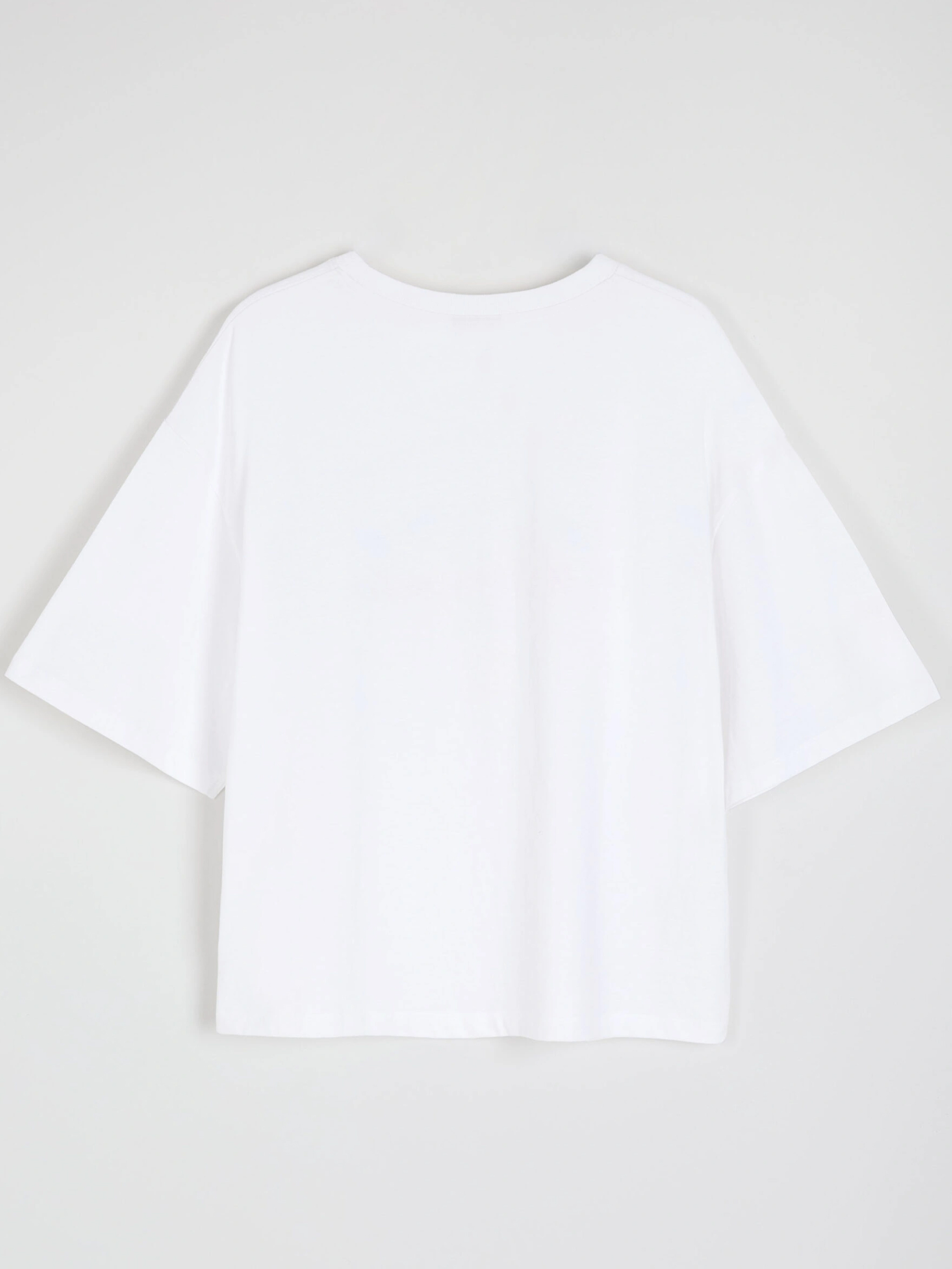 NILCO A Жіноча бавовняна футболка з принтом спереду: - вільного крою, - виготовлена з бавовняного трикотажу, - з принтом спереду, - з короткими спущеними рукавами, - доступна в білому кольорі. Cклад: 100% бавовна Сезон: Весна/Літо Догляд: - прання при максимум 30 °С - делікатні речі - не відбілювати - не сушити в сушильній машині - прасувати максимум при темп. 110 °С - не хімчистка РОЗМІР: XS S М L XL Довжина спинки: 58 60 62 64 66 Ширина знизу: 53 55 57 59 61 Ширина під пахвами: 50 52 54 56 58 Довжина рукава: 36 37,5 39 40,5 42