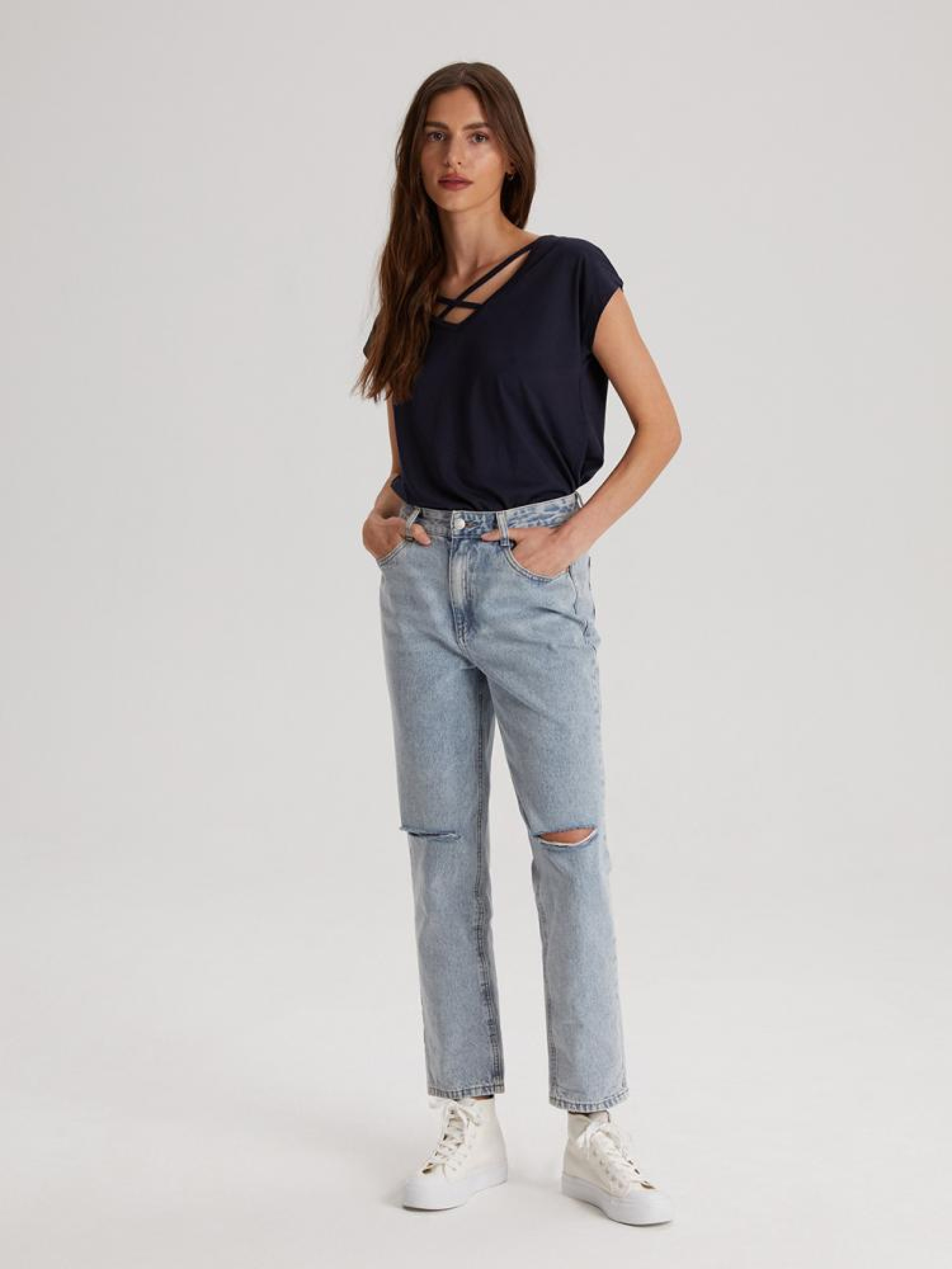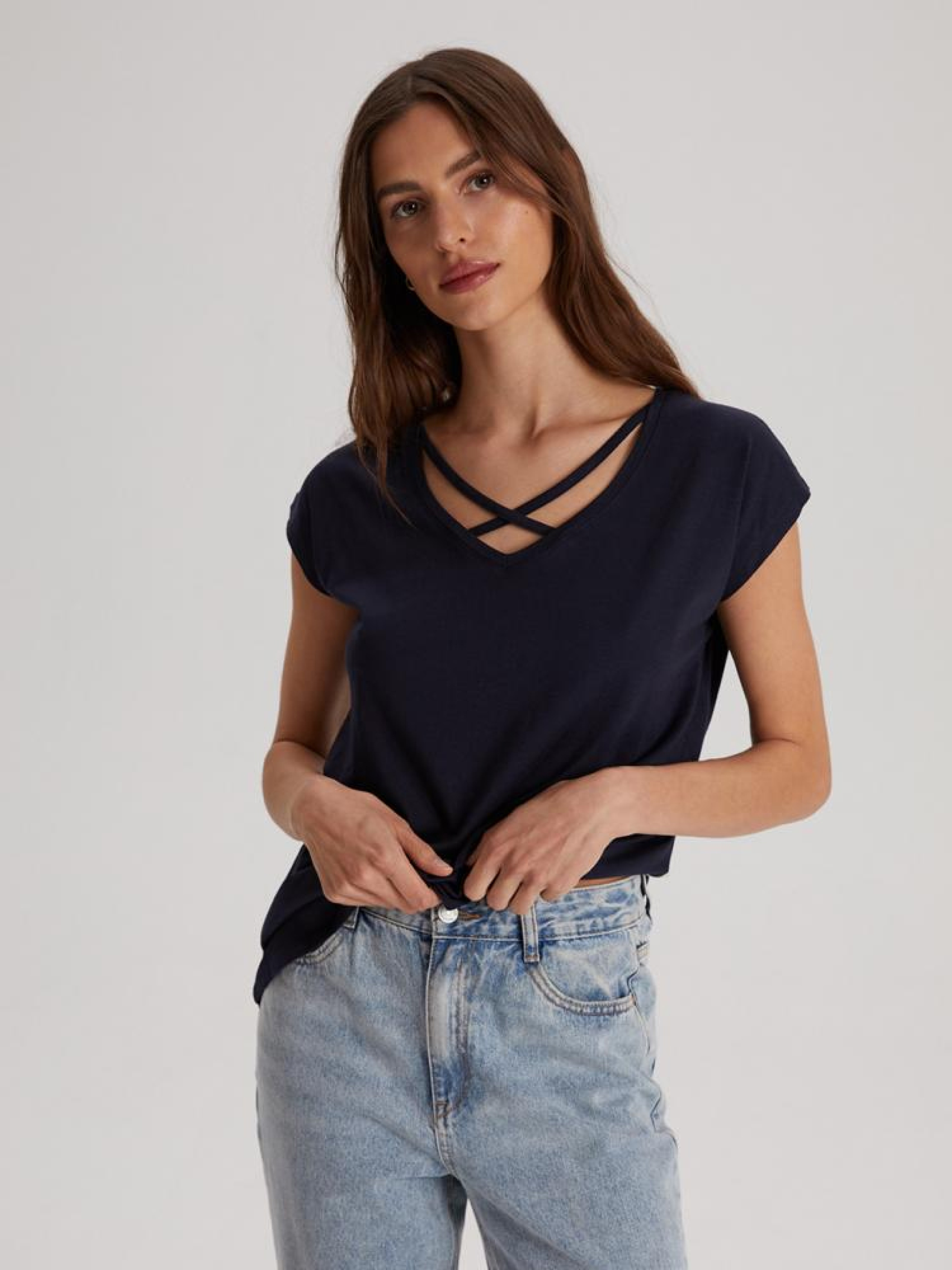 Футболка MUSSY 10042154 Трикотажна футболка з декоративним V-подібним вирізом: - вільний крій, - виготовлена з трикотажу з бавовною, - з короткими рукавами, - з V-подібним вирізом, - з декоративними перехрещеними стрічками на вирізі Сезон: Весна/Літо Склад: 50% бавовна 50% модал Догляд: - прання при максимум 30 °С - делікатні речі - не відбілювати - не сушити в сушильній машині - прасувати максимум при темп. 110 °С - не хімчистка Розмір на моделі - S Зріст моделі - 176 см РОЗМІР: XS, S, М, L. XL, ДОВЖИНА ПО СПИНІ: 59,00 см, 61,00 см, 63,00 см, 65,00 см, 67,00 см, ШИРИНА НИЗУ: 49,50 см, 51,50 см, 53,50 см, 55,50 см, 57,50 см, Ширина під пахвами: 50,00 см, 52,00 см, 54,00 см, 56,00 см, 58,00 см,