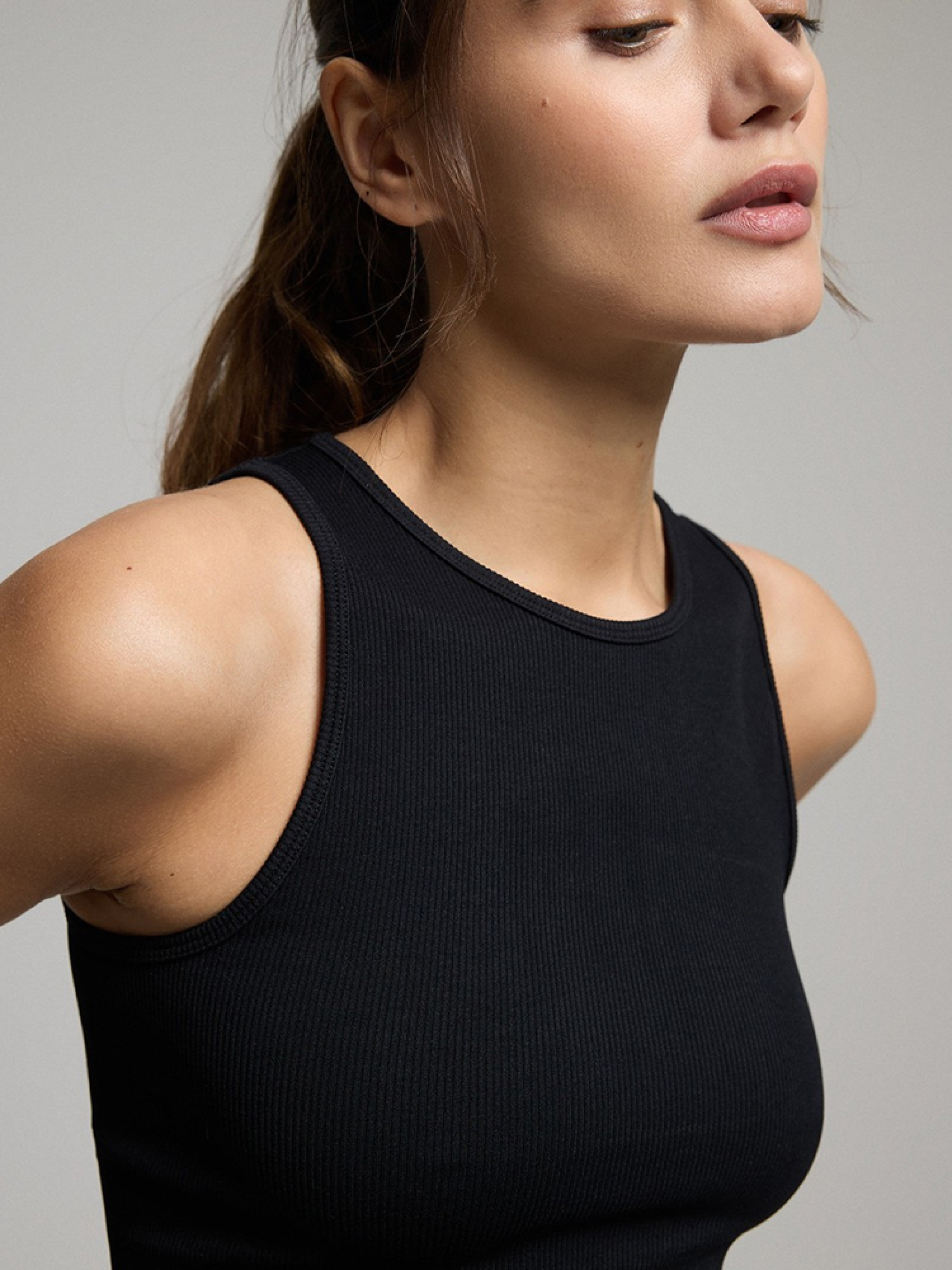 NEFRE Жіночий топ з трикотажу в рубчик - приталений крій, - короткий крій, - круглий виріз, - широкі бретелі, - в наявності чорний колір. Сезон: Весна/Літо Склад 92% поліамід 8% еластан Догляд: - прання при максимум 30 °С - не відбілювати - не сушити в сушильній машині - прасувати максимум при темп. 110 °С - не проводити хімчистку Розмір на моделі - S Зріст моделі - 180 см РОЗМІР: XS, S, М, L. XL, ЗАГАЛЬНА ДОВЖИНА СПИНИ: 39, 41, 43, 45, 47, ШИРИНА НИЗУ: 31, 33, 35, 37, 39, Ширина в грудях: 31, 33, 35, 37, 39,