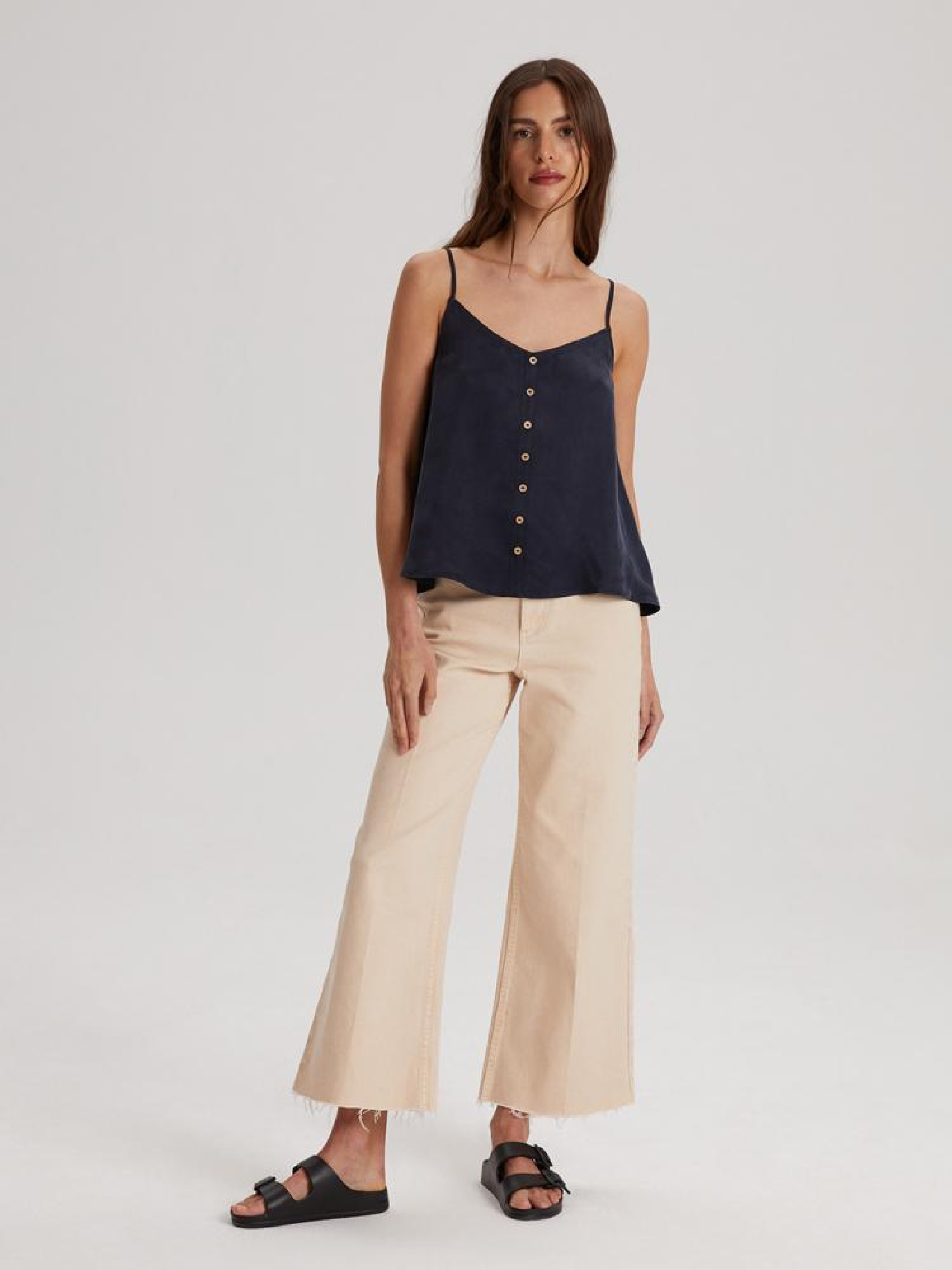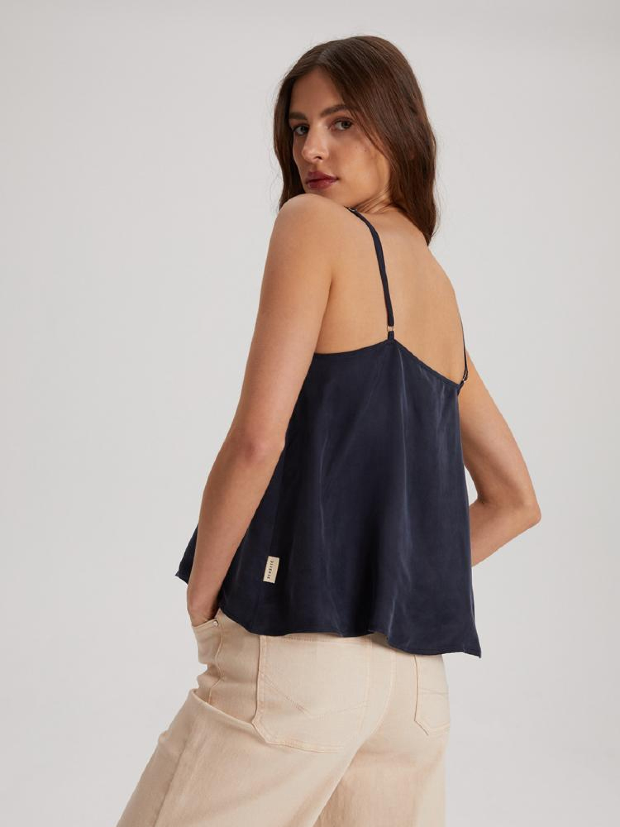 Топ MARINA T4 10041938 Тканинний топ з декоративними ґудзиками спереду: - вільний крій, - виготовлений з мідного волокна та віскози, - з декоративними ґудзиками спереду, - на тонких лямках, - доступний у темно-синьому кольорі. Склад: 60% мідне волокно 40% віскоза Сезон: Весна/Літо Догляд: - прання при максимум 30 °С - не відбілювати - не сушити в сушильній машині - прасувати максимум при темп. 110 °С - не проводити хімчистку Розмір на моделі - S Зріст моделі - 176 см РОЗМІР: XS, S, М, L. XL, ЗАГАЛЬНА ДОВЖИНА СПИНИ: 34,00 см, 36,00 см, 38,00 см, 40,00 см, 42,00 см, ШИРИНА НИЗУ: 64,00 см, 66,00 см, 68,00 см, 70,00 см, 72,00 см, ШИРИНА ГРУДЕЙ: 41,00 см, 43,00 см, 45,00 см, 47,00 см, 49,00 см,