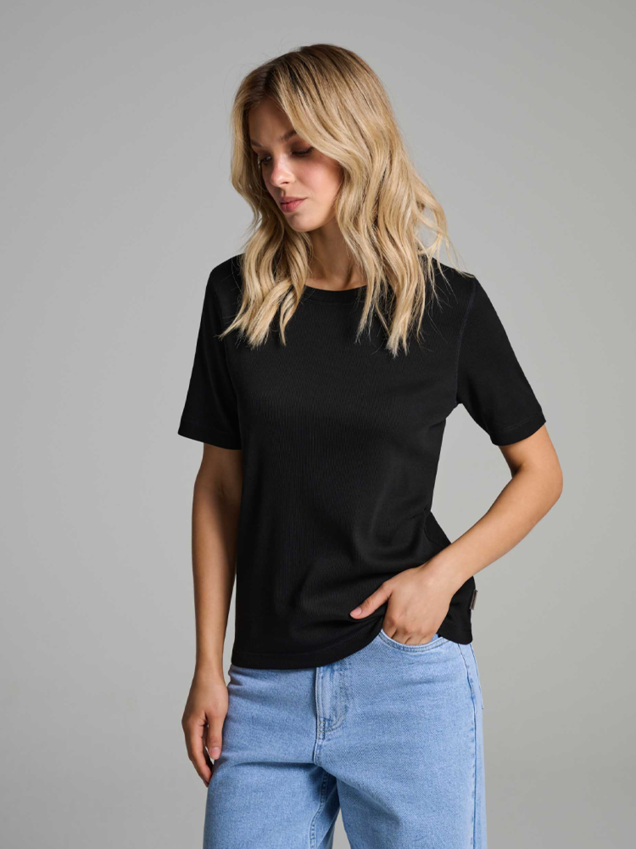 ALAWENMA Футболка зі структурованого бавовняного трикотажу - приталений крій, - бавовна з домішкою еластану, - круглий виріз, - декоративна строчка, - короткі рукави. Сезон: Весна/Літо Склад: 95% бавовна 5% еластан Догляд: - прання при максимум 30 °С - делікатні речі - не відбілювати - не сушити в сушильній машині - прасувати максимум при темп. 110 °С - не проводити хімчистку РОЗМІР: XS, S, М, L. XL, Довжина по спинці: 56, 58, 60, 62, 64, ШИРИНА НИЗУ: 43, 45, 47, 49, 51, Ширина під пахвами: 42, 44, 46, 48, 50, Довжина рукава: 21.5, 22.5, 23.5, 24.5, 25.5,
