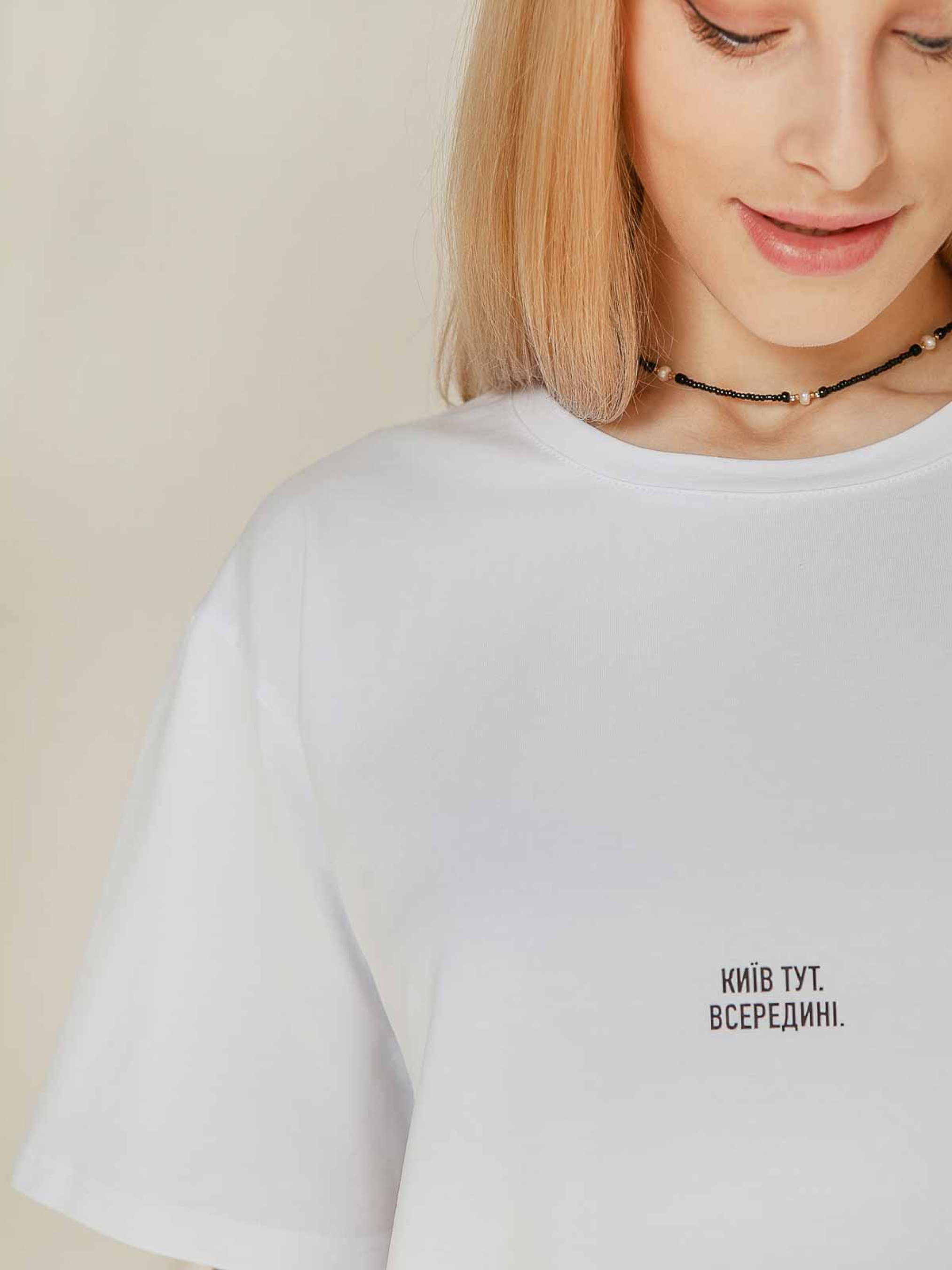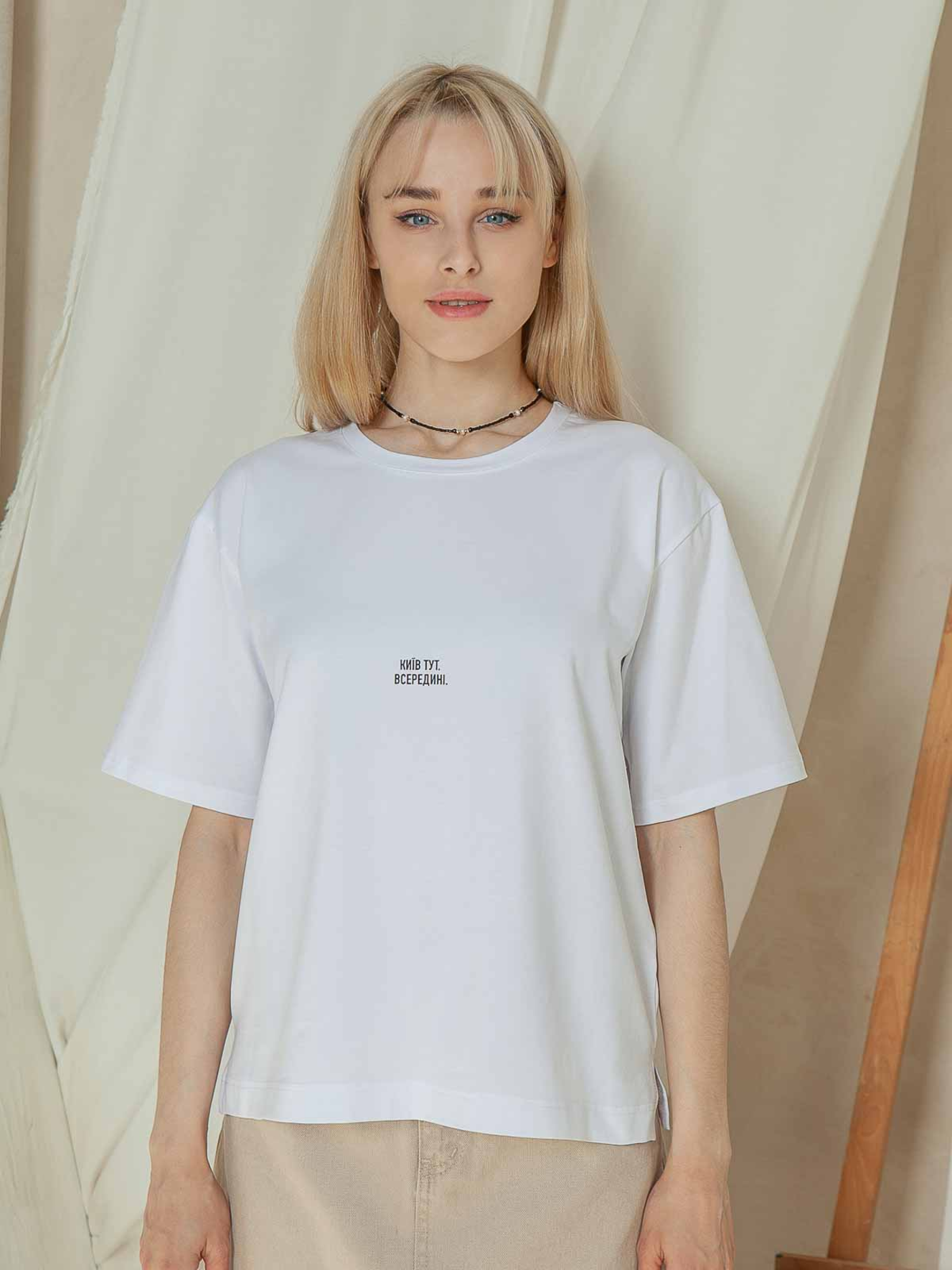 Футболка жіноча - те, без чого зараз важко уявити свій гардероб. Це відмінний вибір для повсякденного чи ошатного образу, адже вона поєднується майже з усім. Завдяки зручному крою, футболку комфортно носити. Вона чудово виглядає на дівчатах з будь-якою фігурою. На футболку нанесений авторський принт «Київ тут. Всередині», виконаний термоплівкою. Деталі та крій: - крій вільний - спущена лінія плеча - авторський принт «Київ тут. Всередині» Як доглядати: - можна прати у машині у стандартному режимі (температура – до 40°C) - не відбілюйте - не використовуйте штучне сушіння - краще сушити, попередньо розвісивши - не використовуйте хімчистку Матеріал: трикотажне полотно кулірна гладь Сезон: всесезонне Склад: 95% бавовна 5% еластан Зріст моделі: 172 Параметри моделі: 83-62-90 Розмір виробу на моделі: S/M Заміри виробу Ширина по грудях XS/S (40-42) - 49см, S/M (42-44) - 53см, M/L (44-46) - 57см, XL/XXL (48-50) - 61см; Довжина рукава + ширина плеча XS/S (40-42) - 33,5см, S/M (42-44) - 36см, M/L (44-46) - 38,5см, XL/XXL (48-50) - 41см; Довжина по переду XS/S (40-42) - 61,5см, S/M (42-44) - 62,5см, M/L (44-46) - 63,5см, XL/XXL (48-50) - 64,5см.