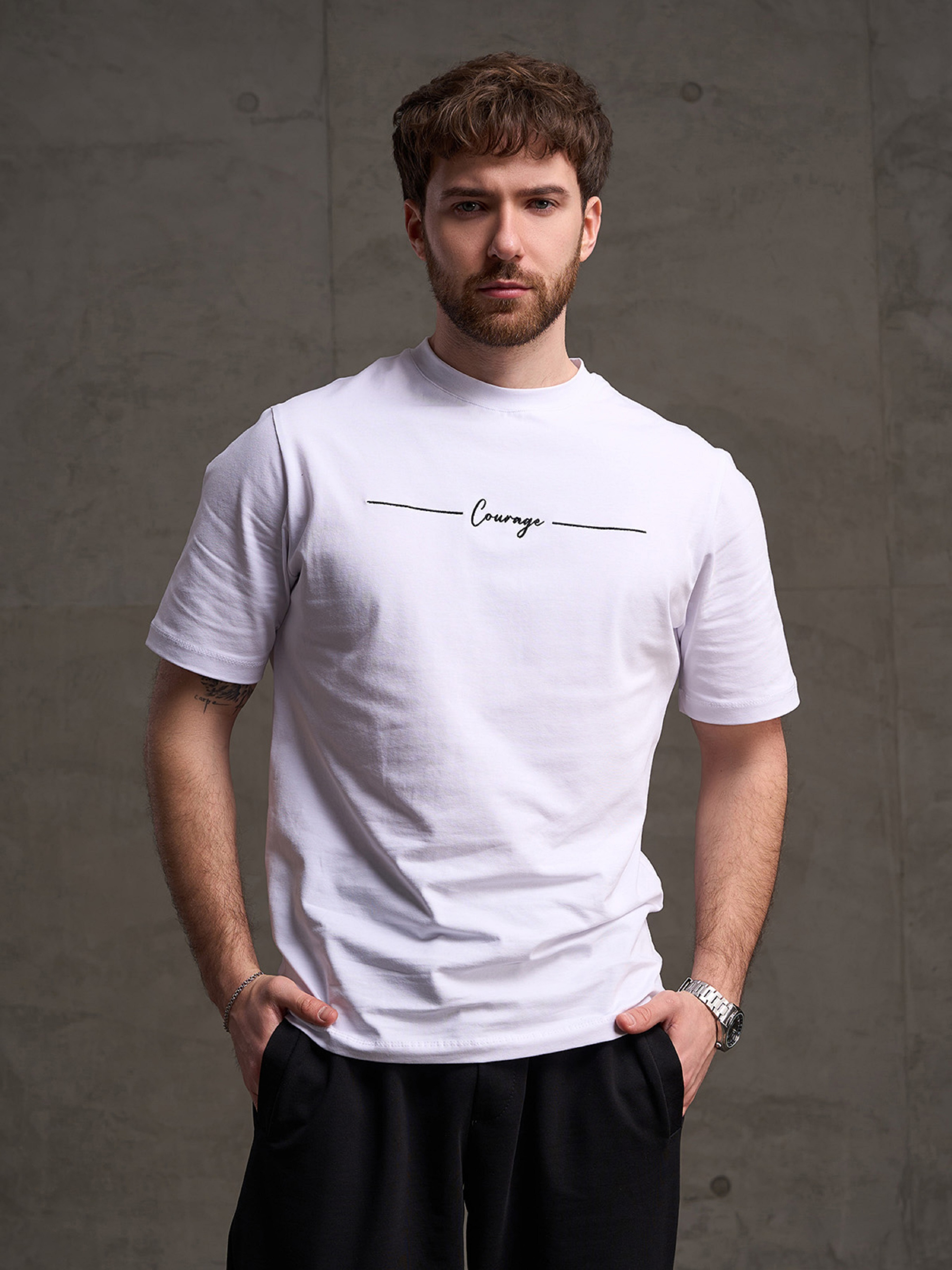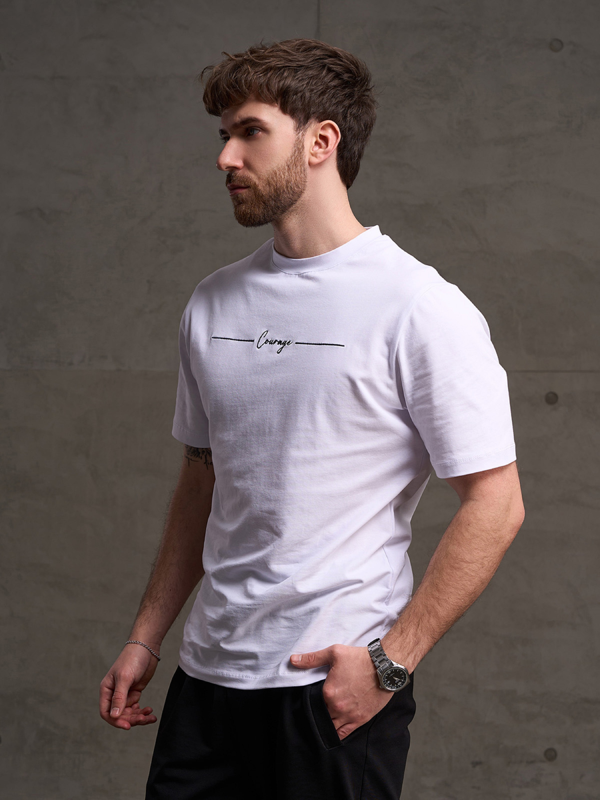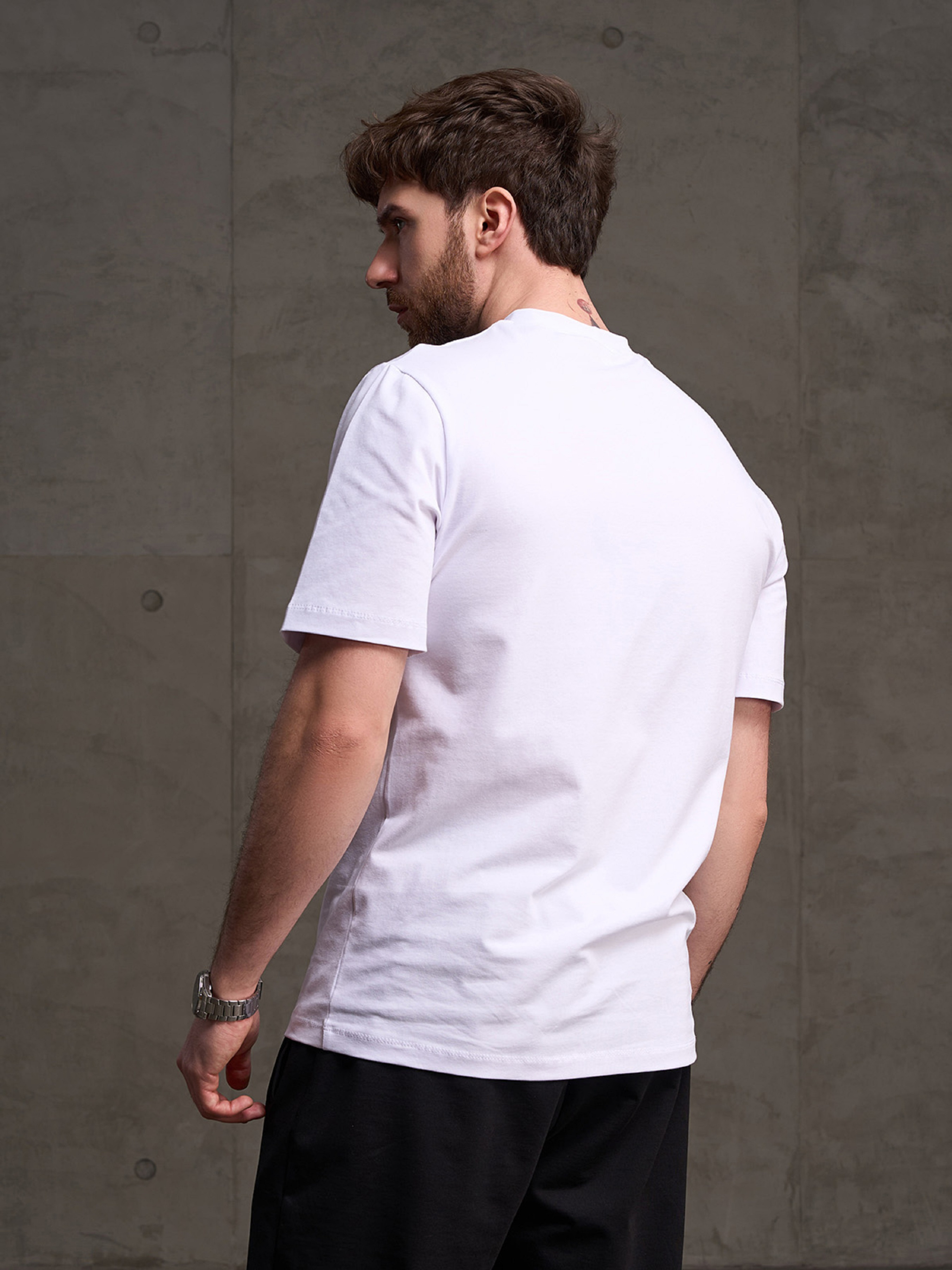 Біла базова футболка з бавовняного трикотажу з написом. Модель прямого традиційного крою з короткими рукавами та манжеткою на О-подібній горловині. Напівобхват: Груди: S (46), M (48), L (50), XL (52), XXL (54), 3XL (56), Довжина виробу - 70, Рукав - 26, Тканина: Високої еластичності