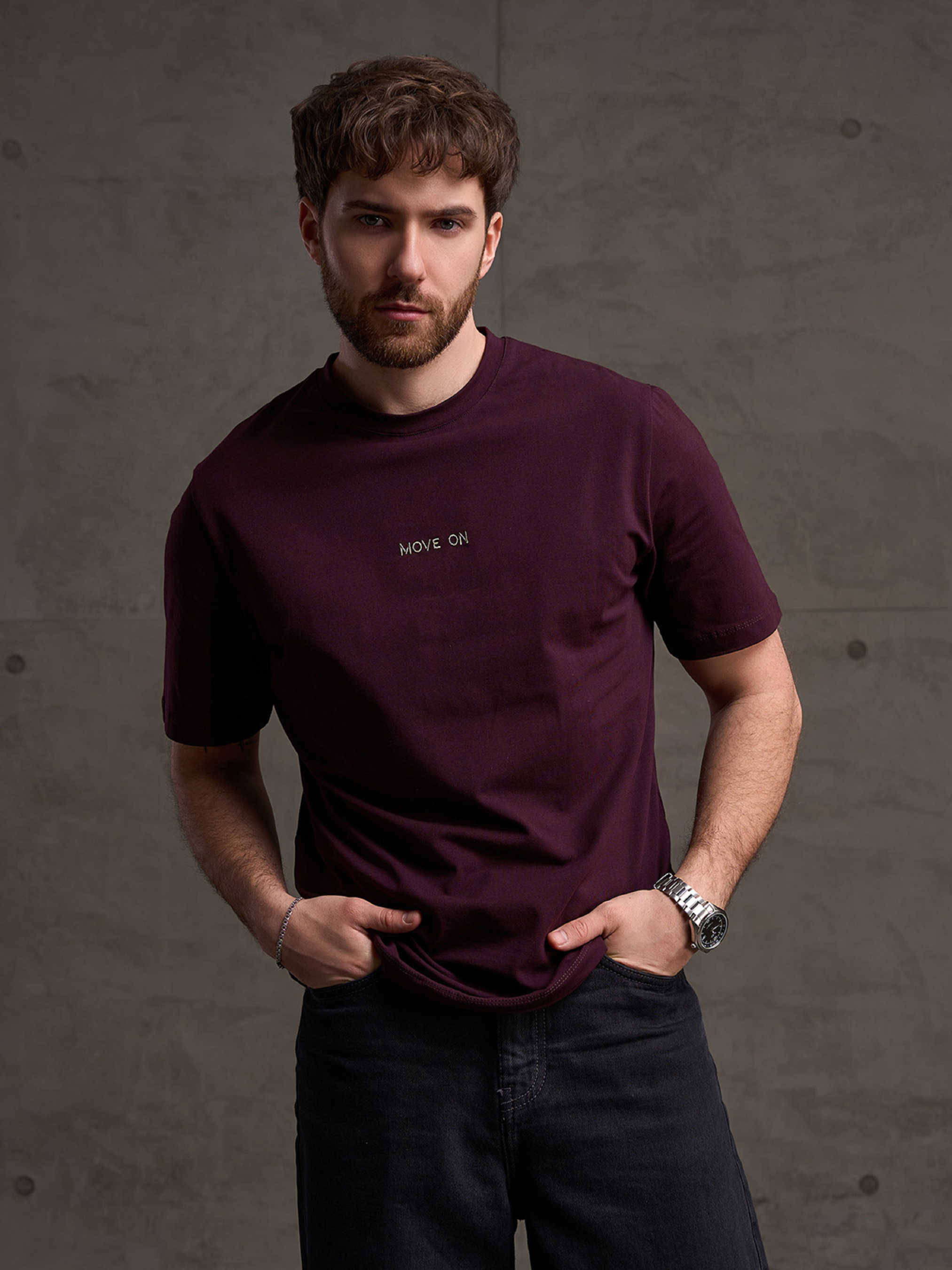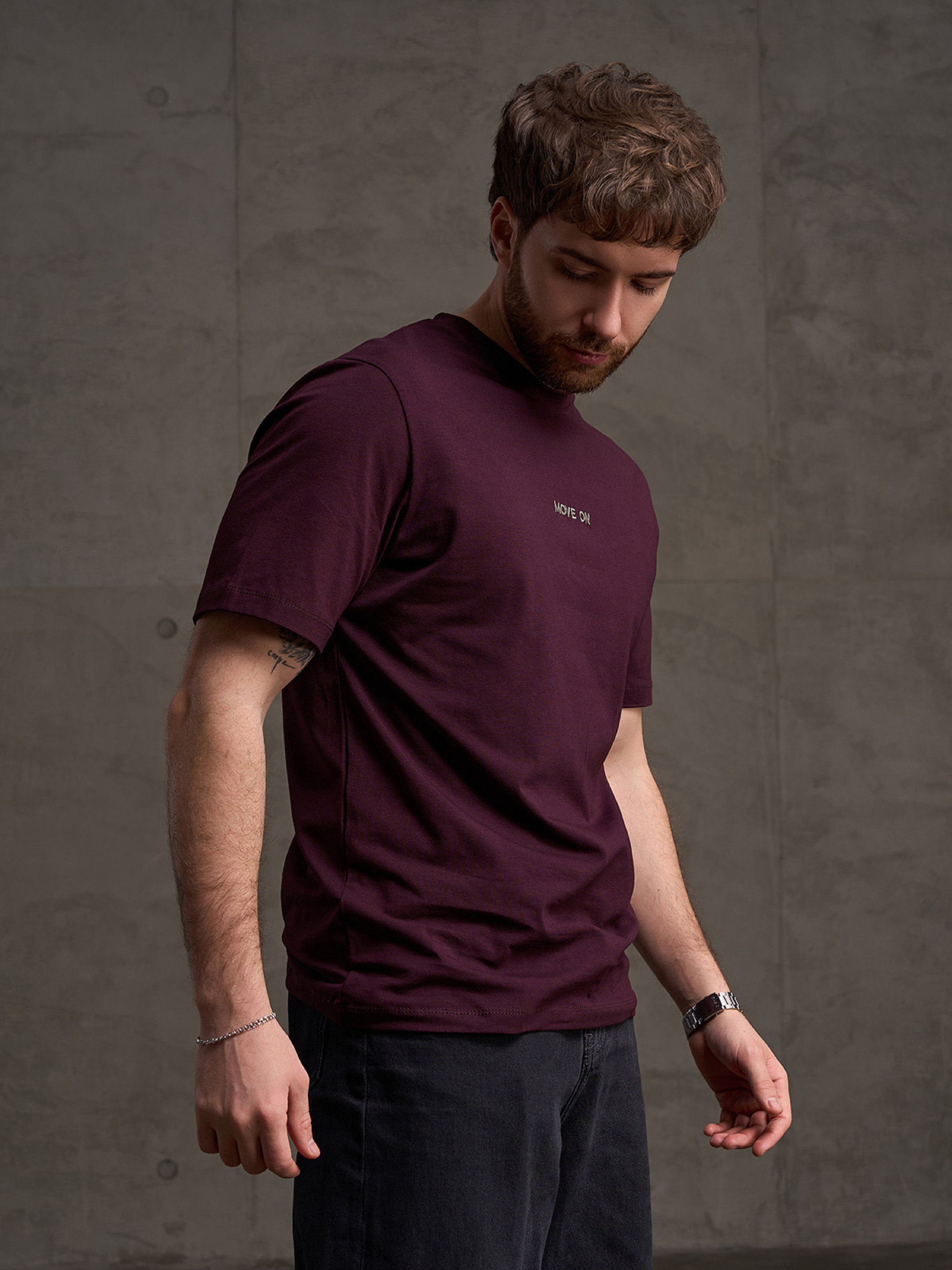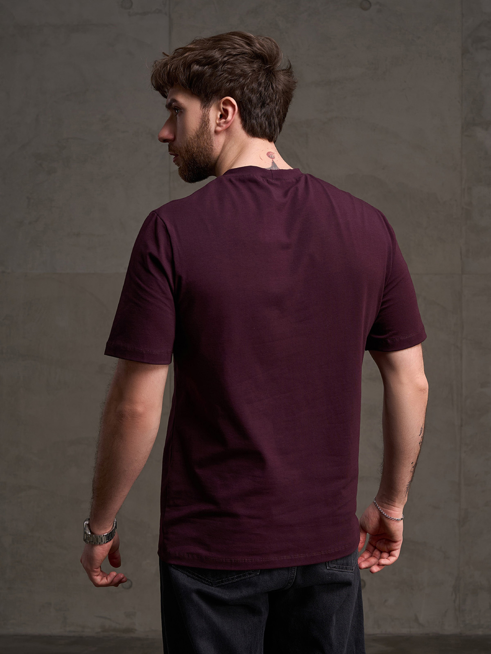 Темно-бордова легка футболка з короткими рукавами та манжеткою на горловині, виконана з бавовняного трикотажу. Модель з короткими рукавами та невеликим написом. Напівобхват: Груди: S (46), M (48), L (50), XL (52), XXL (54), 3XL (56), Довжина виробу - 70, Рукав - 26, Тканина: Високої еластичності