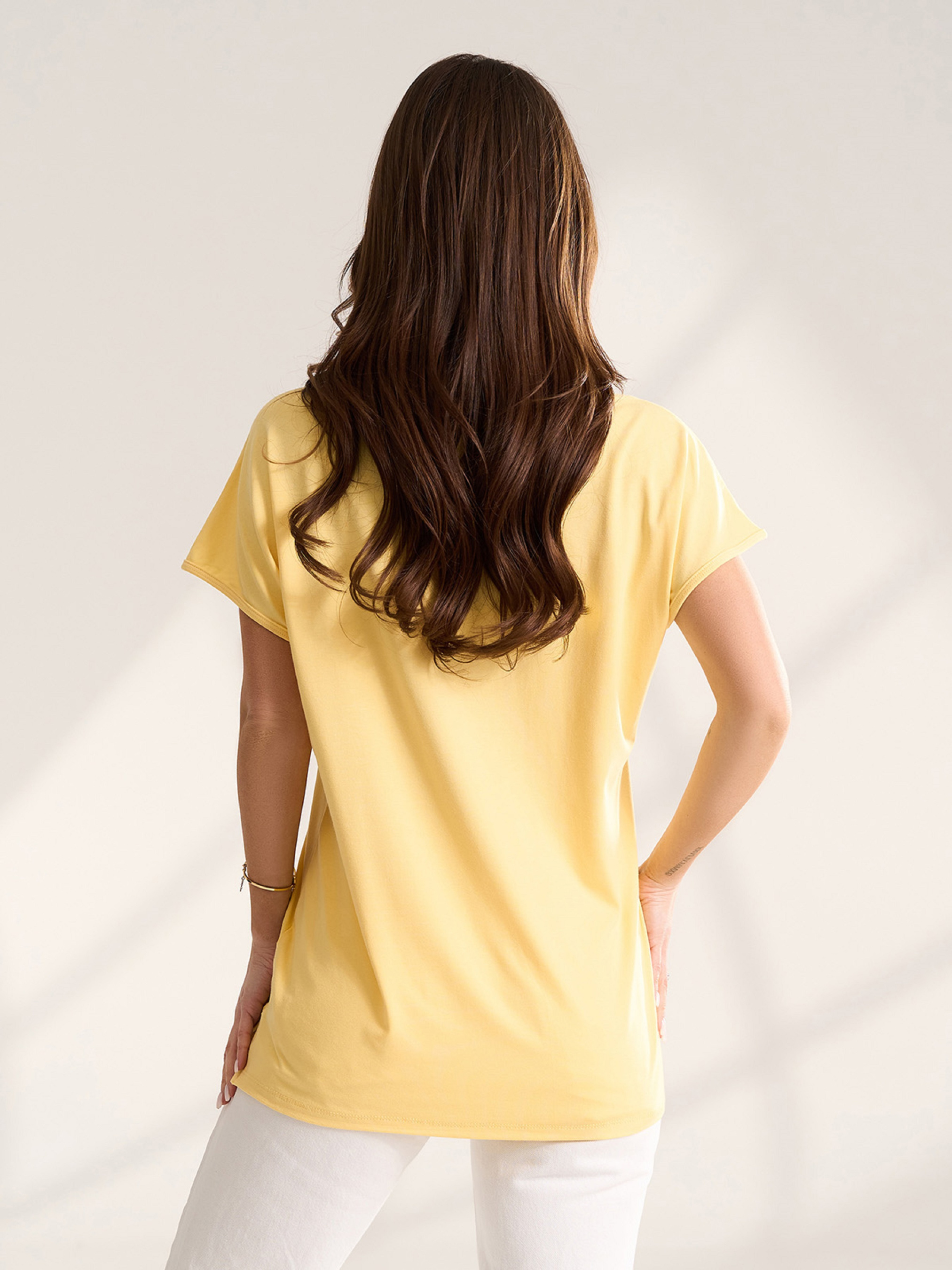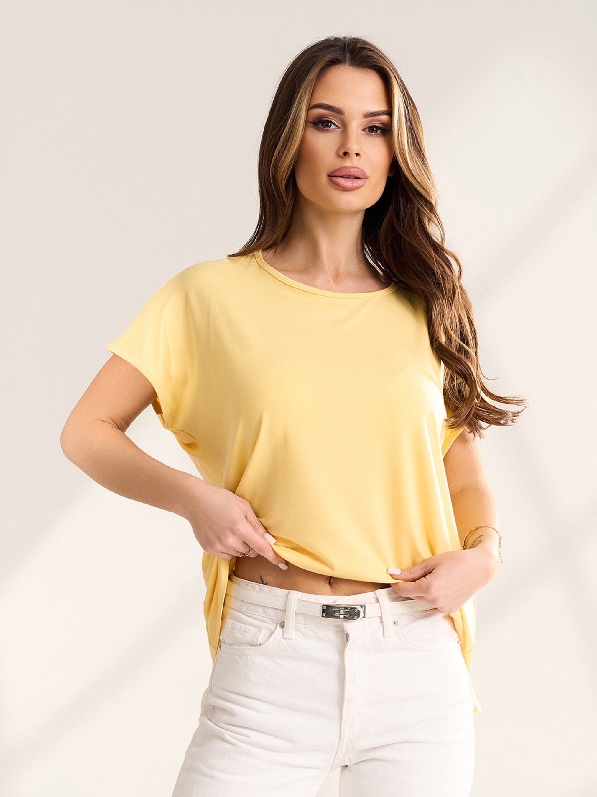 Жовта футболка оверсайз фасону кімоно з короткими рукавами і бічним розрізом. Модель виконана з віскозного трикотажу із напівкруглою горловиною. Напівобхват: Груди: S (51), M (53), L (55), XL (57), XXL (59), 3XL (61), Довжина виробу - 64, Рукав - 8, Тканина: Високої еластичності
