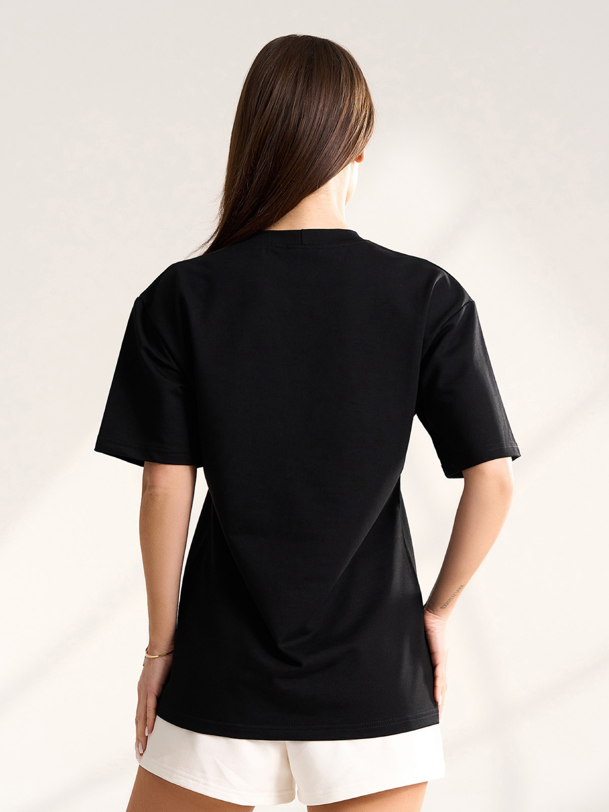 Класична чорна футболка з рукавами до ліктів, виконана з однотонного двонитного трикотажу пен'є. Модель вільного крою із напівкруглою закритою горловиною. Напівобхват: Груди: S (49), M (51), L (53), XL (55), Довжина виробу - 63, Рукав - 22, Тканина: Средньої еластичності