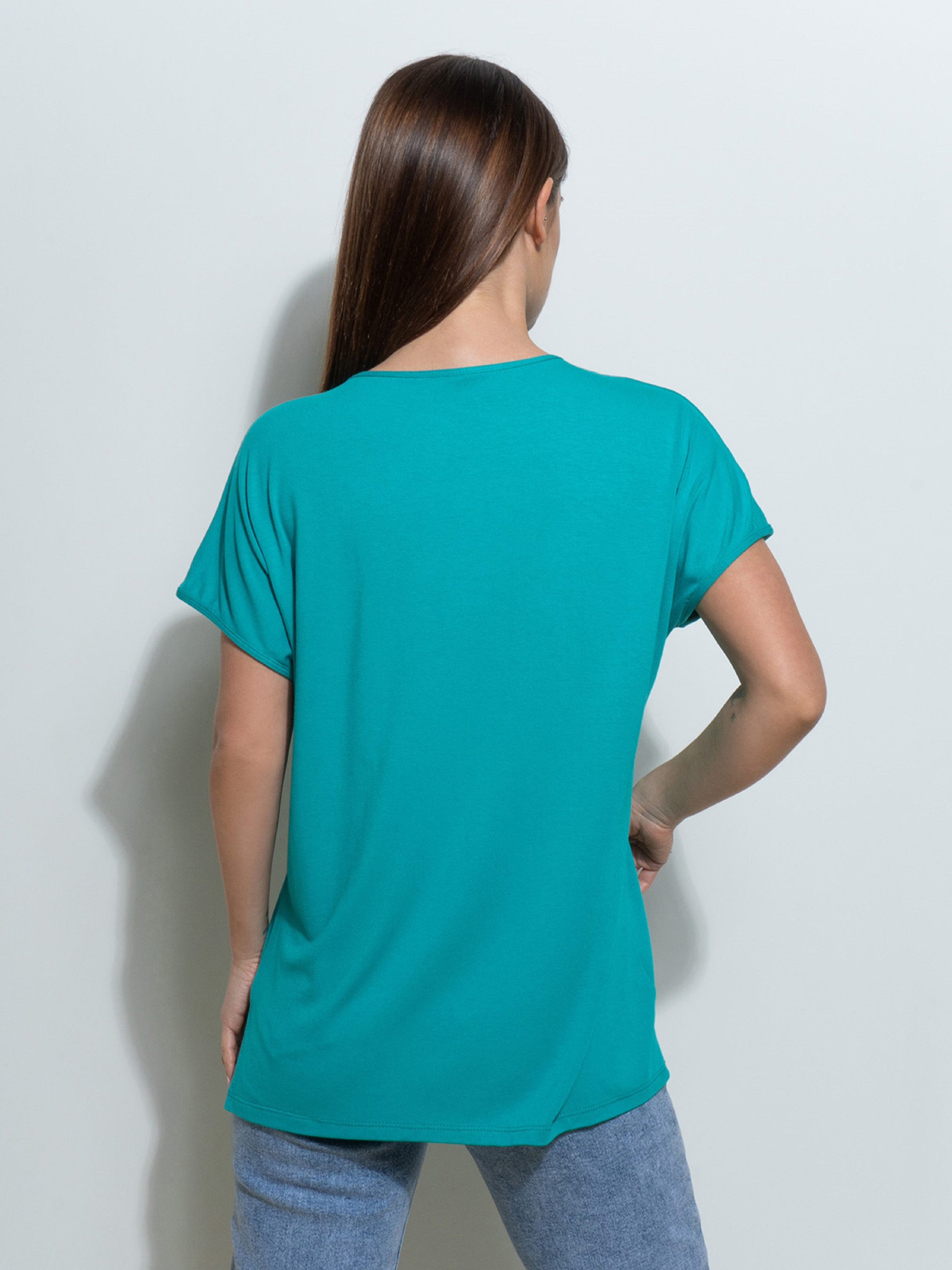 Свободна бірюзова футболка-кімоно, виконана з приємного до тіла віскозного трикотажу. Модель з короткими рукавами, бічними розрізами та закритою горловиною. Футболка декорована вишитим написом.Напівобхват: Груди: S (52), M (54), L (56), XL (58), Довжина виробу - 64, Рукав - 8, Тканина: Висока еластичність