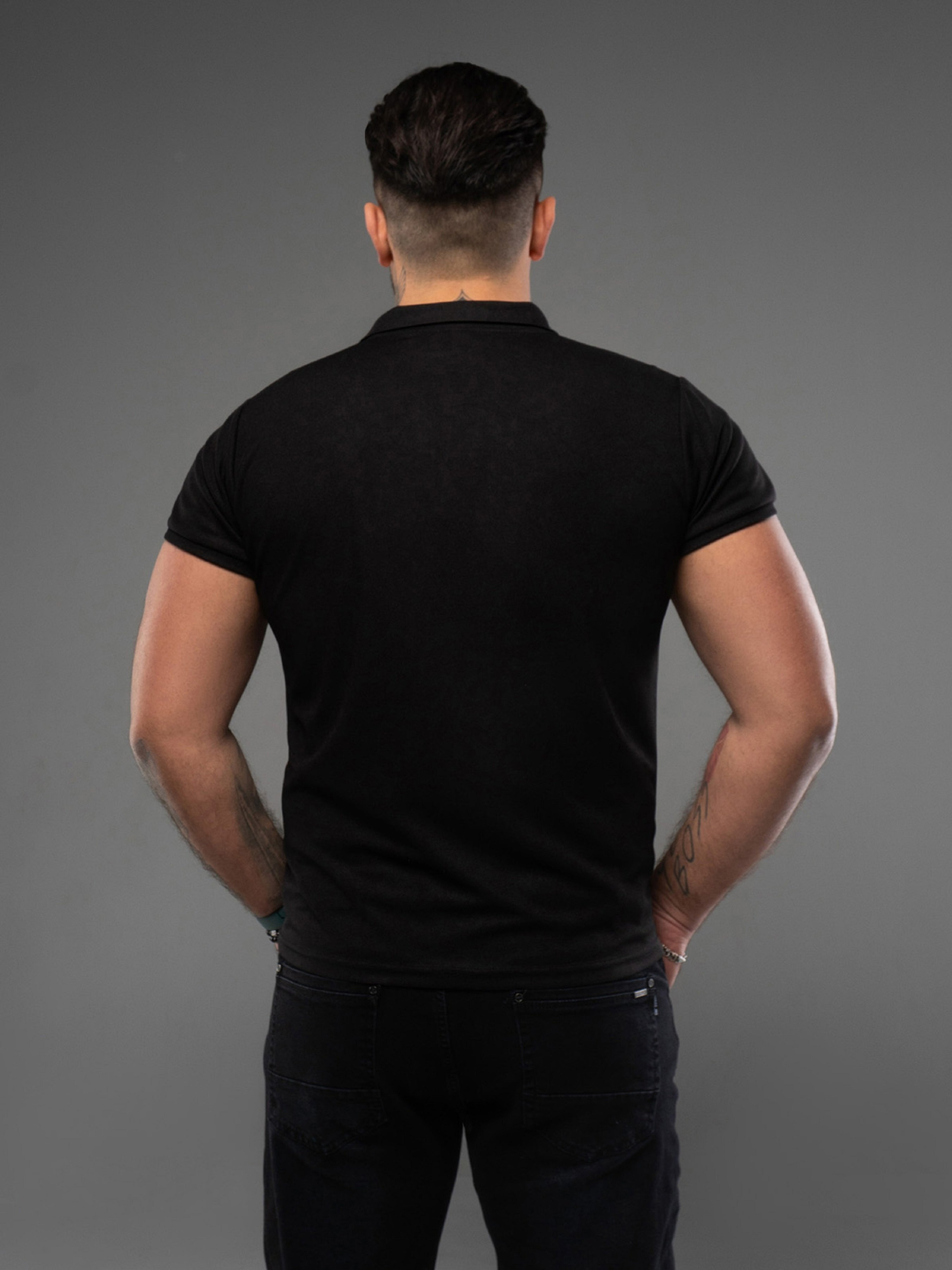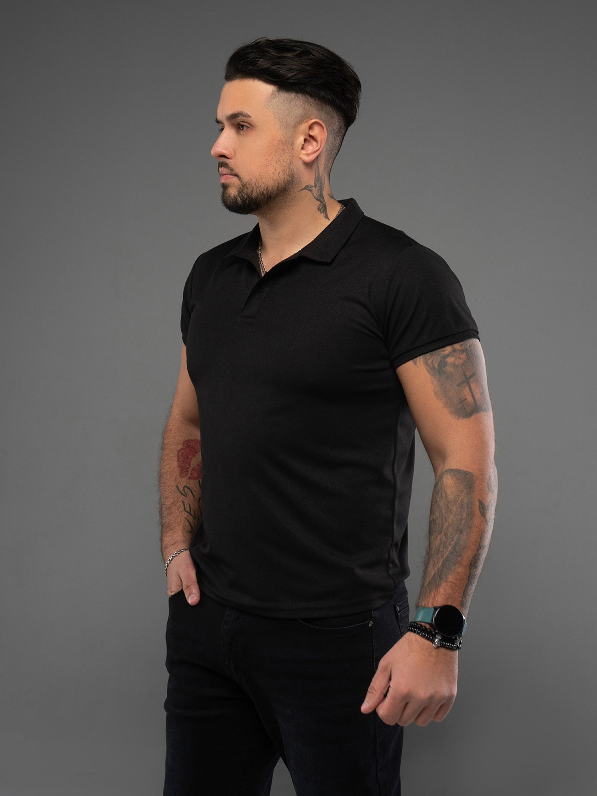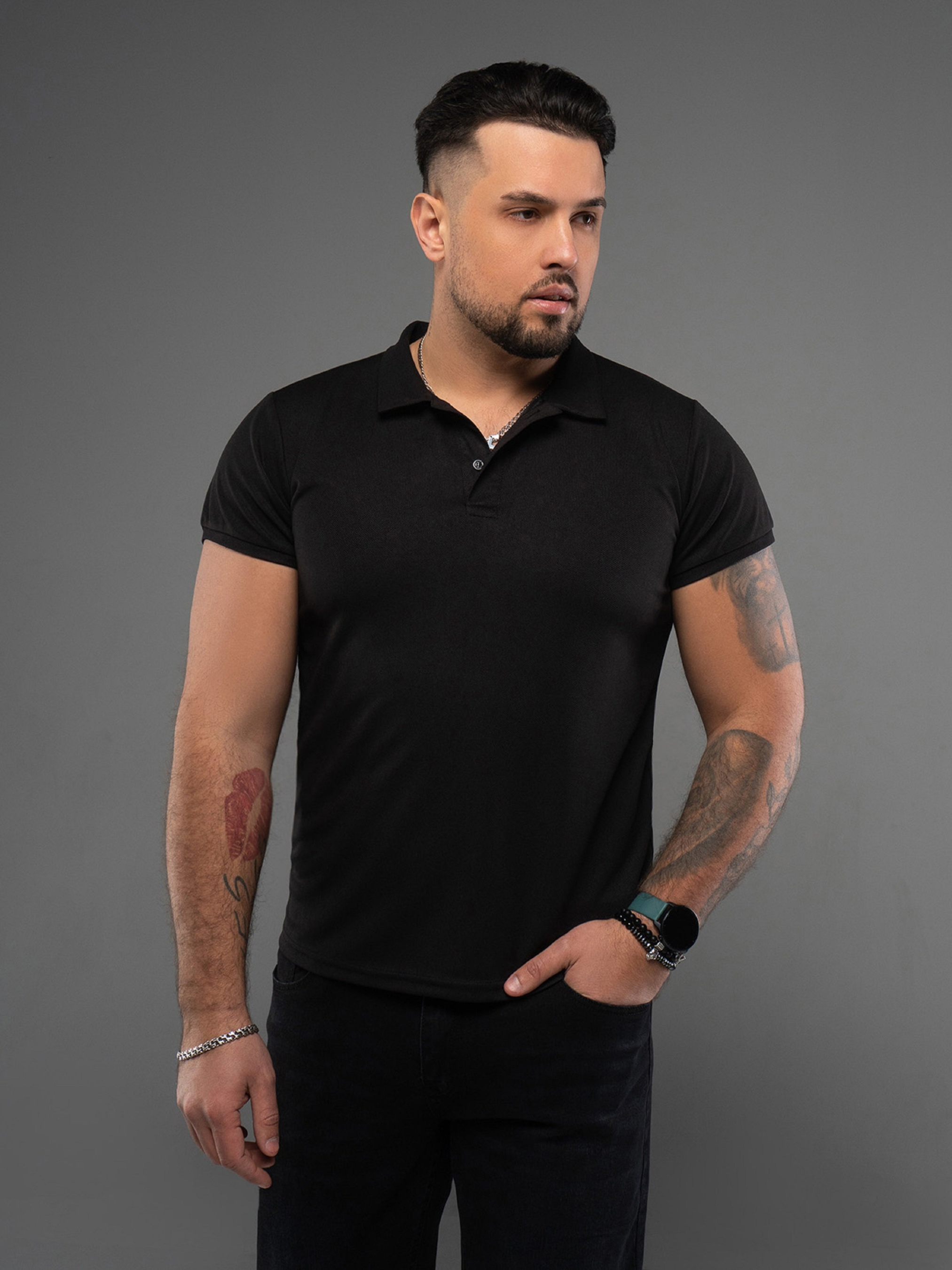 Чорна повсякденна футболка поло, виготовлена з фактурного трикотажу з короткими рукавами на манжетах. Модель прямого крою з коміром та укороченою планкою на ґудзиках. Напівобхват: Груди: S (48), M (50), L (52), XL (54), XXL (56), 3XL (58), Довжина виробу - 70, Рукав - 18, Тканина: Висока еластичність.