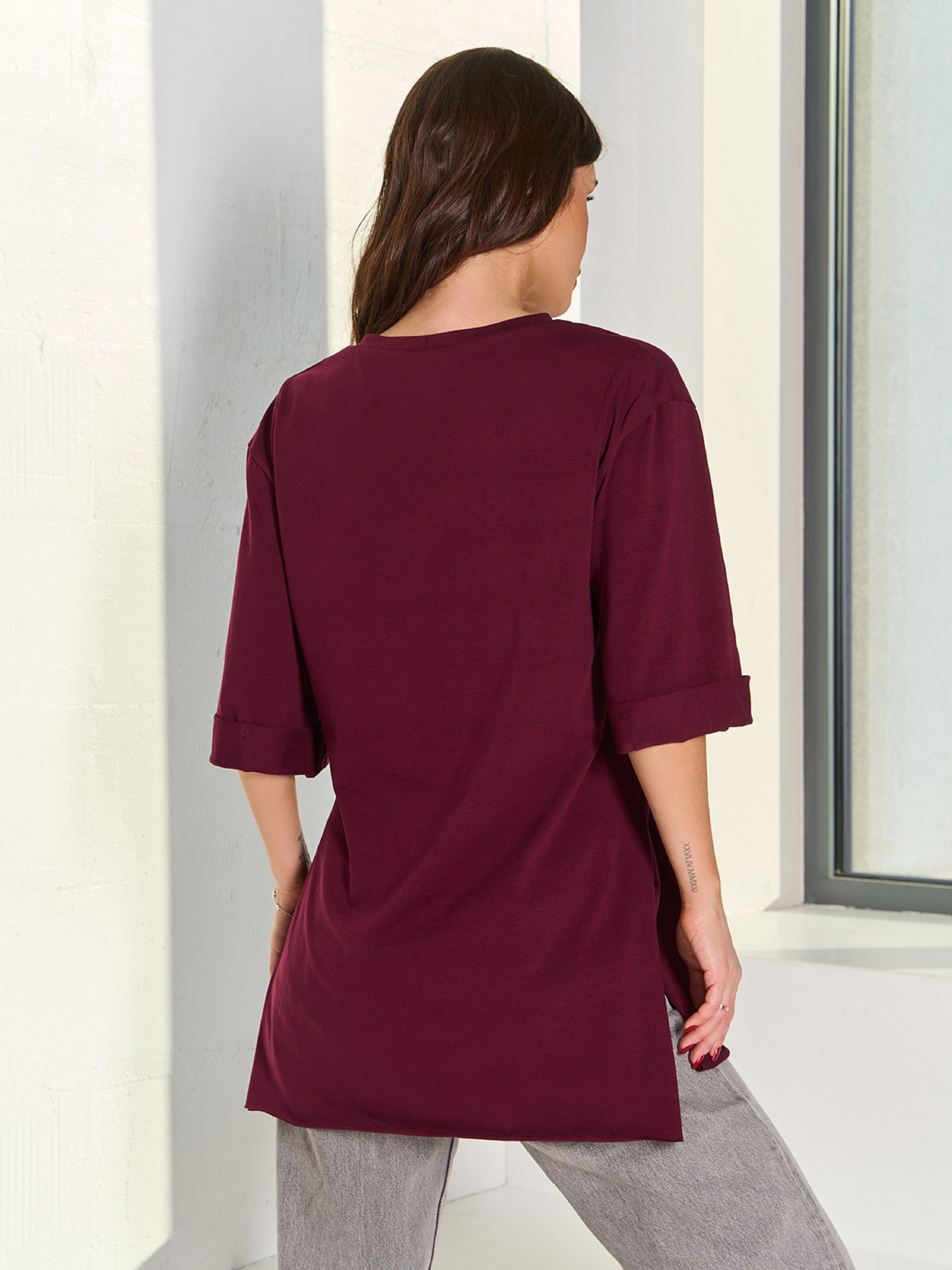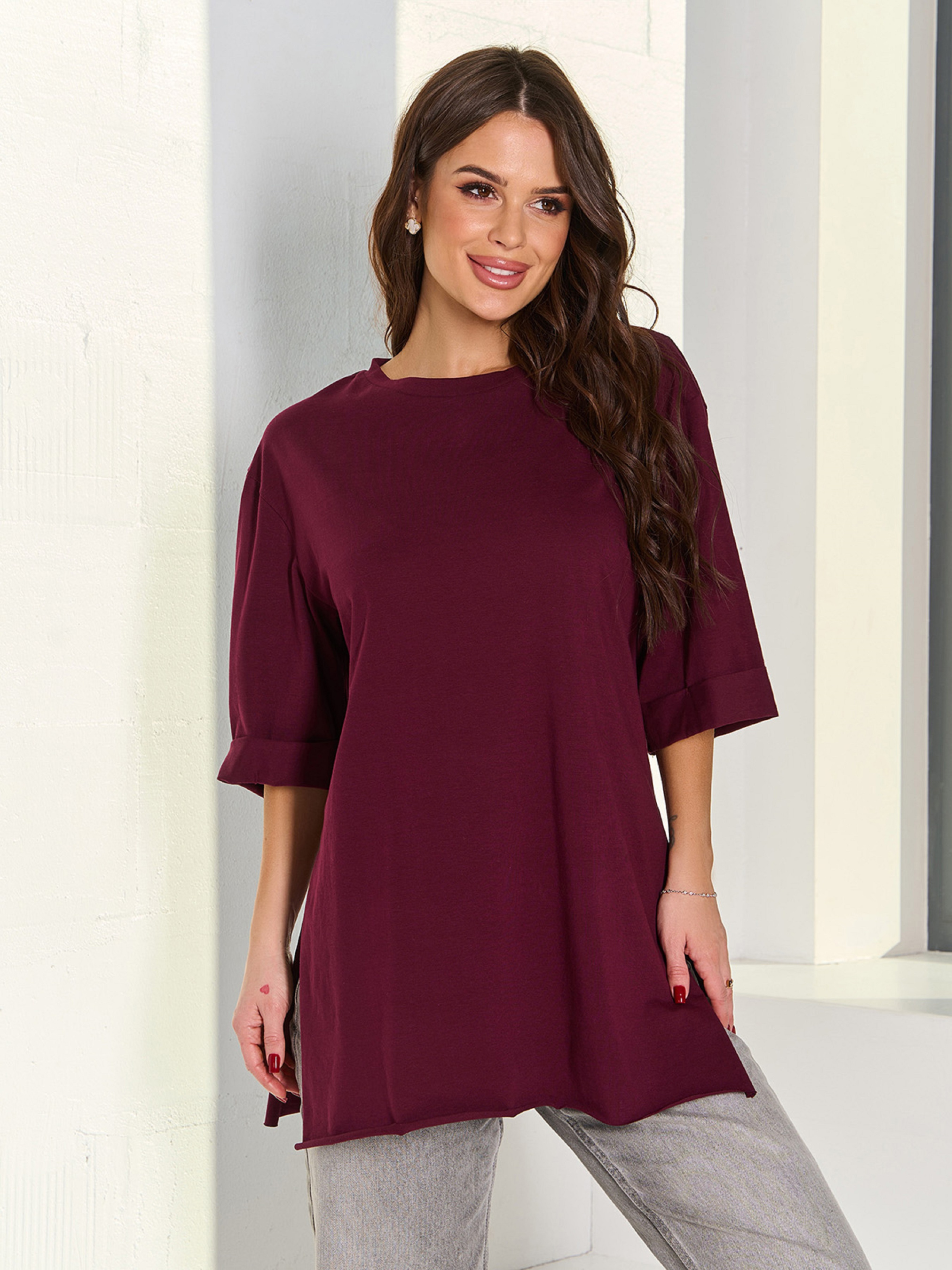 Асиметрична бавовняна футболка в стилі оверсайз із бічними розрізами, виконана в кольорі бургунді. Модель прямого подовженого крою з рукавами довжиною до ліктів та О-подібною проймою горловини. Нижні зрізи не оброблені швами. Склад: 92% бавовна, 8% еластан. Напівобхват: Груди: S(50), M(52), L(54), XL(56), Довжина виробу - 72/76, Рукав - 28, Тканина: Висока еластичність.