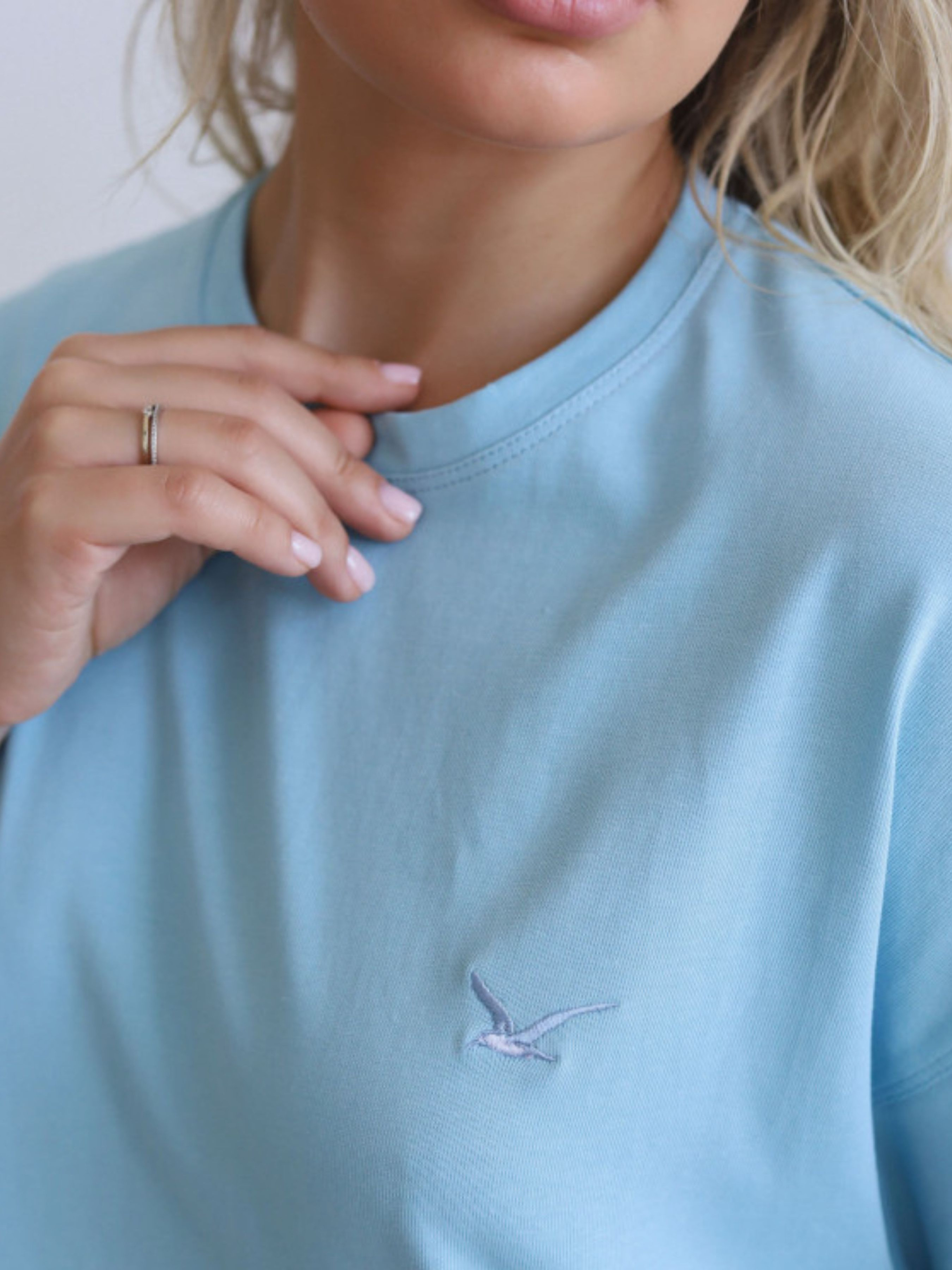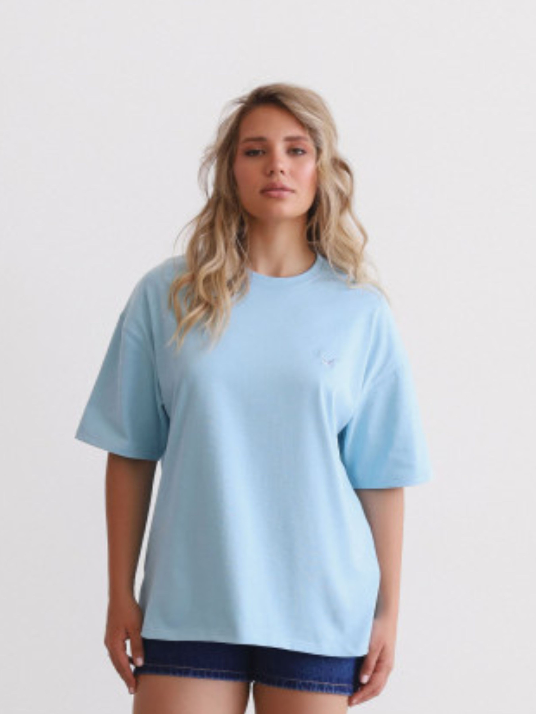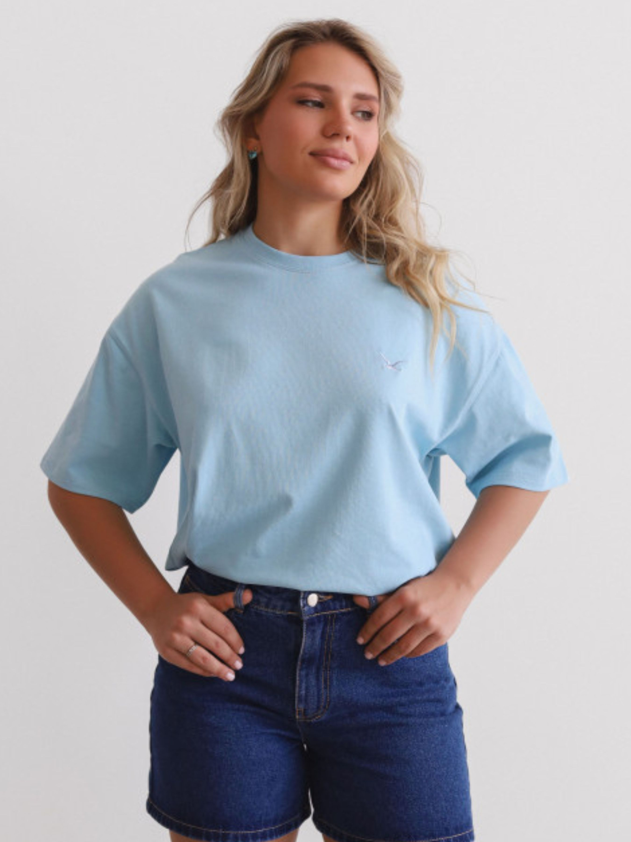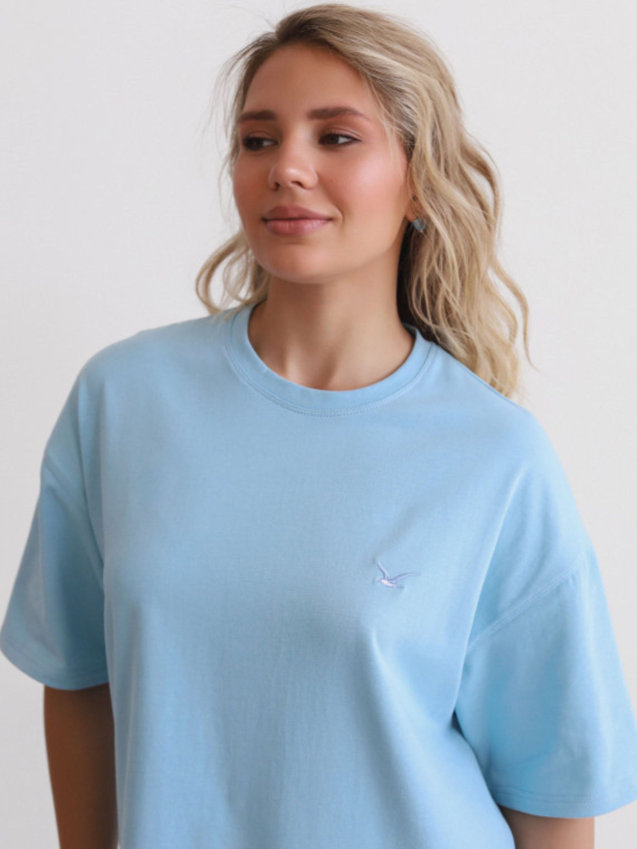 Стильна базова футболка вільного крою - ідеальний вибір для сучасних образів. Виконана з натуральної бавовни преміум-якості, що забезпечує комфорт і приємні тактильні відчуття. Вільний силует і занижена лінія плеча надають розслабленості та універсальності. Подробиці: - Круглий виріз із міцною окантовкою - Спущене плече та об'ємні рукави - Вишитий логотип у вигляді чайки - Подовжений крій для комфортної посадки