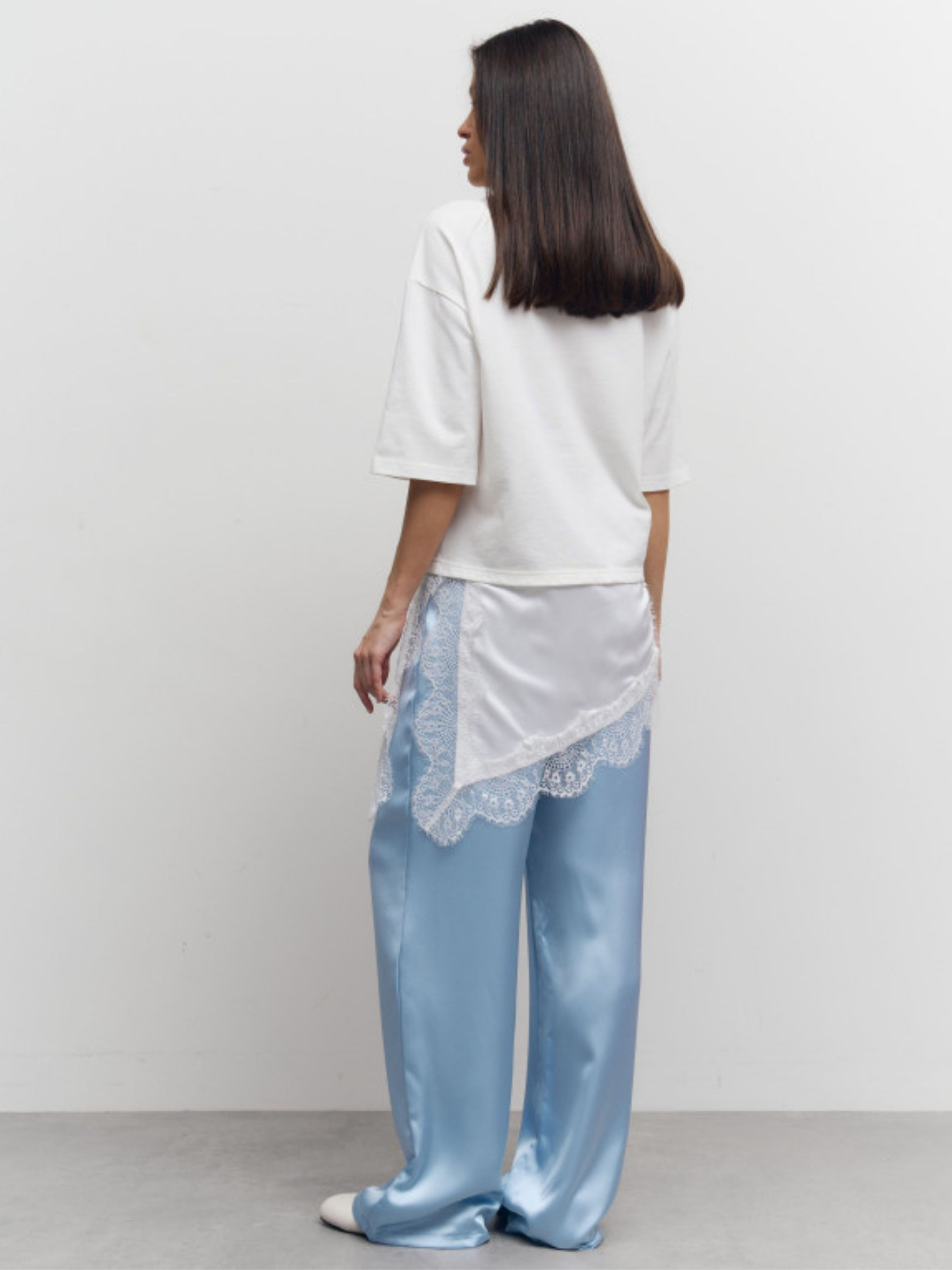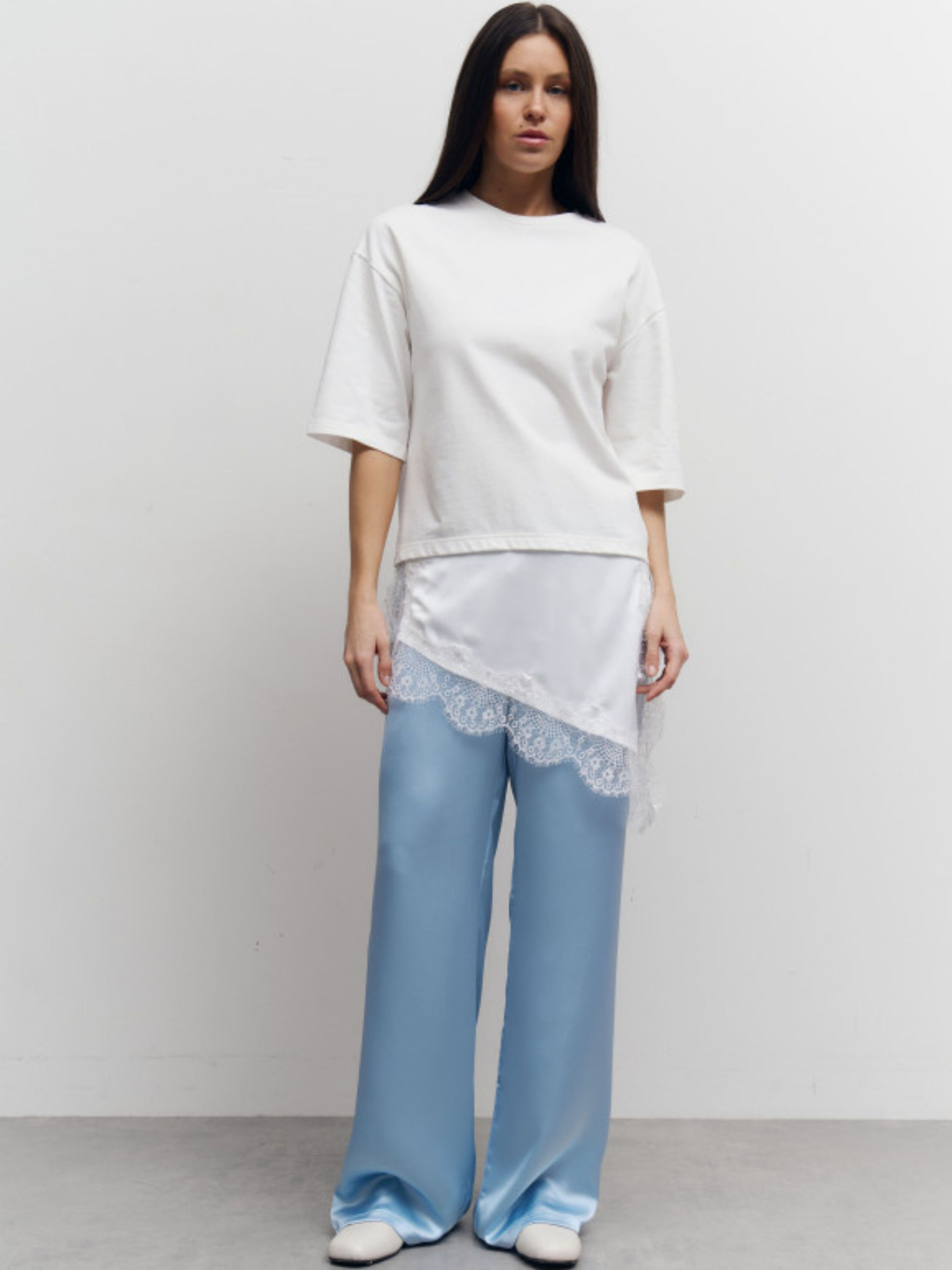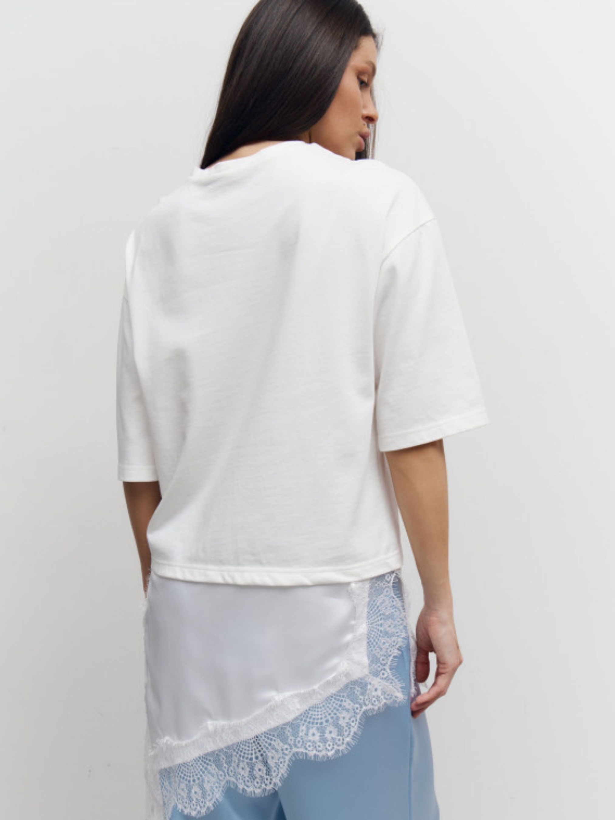 Базова футболка з ефектом тонкого багатошаровості. Лаконічний силует із щільного турецького котону поєднується з ніжною вставкою зі штучного шовку та витонченим гіпюром, що створює легкий, жіночний акцент у нижній частині виробу. Щільний 100% котон добре тримає форму, приємний для тіла та забезпечує комфорт протягом дня. Нижній шар зі штучного шовку з мереживним оздобленням надає образу легкості і нагадує стильну комбінацію, що делікатно виглядає з-під футболки. Це ідеальна модель для сучасних мінімалістичних образів - поєднуйте з денімом, класичними брюками або сатиновими сатинами для effortless chic стилю.