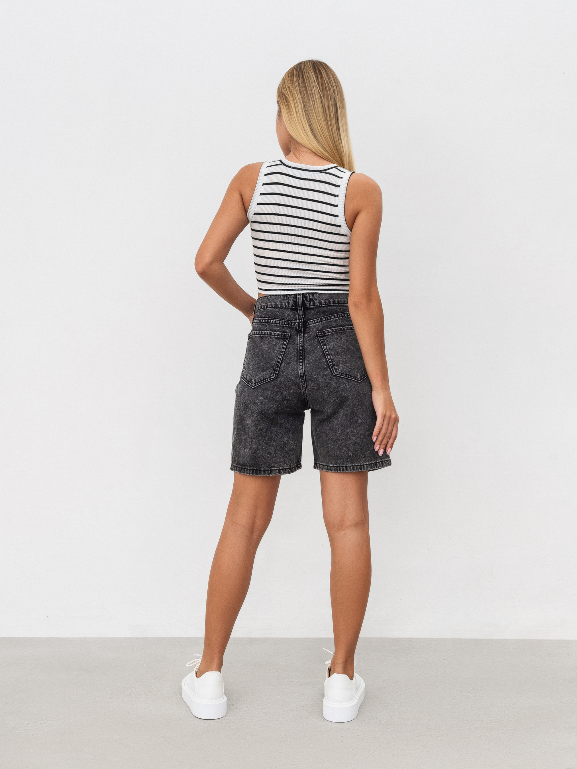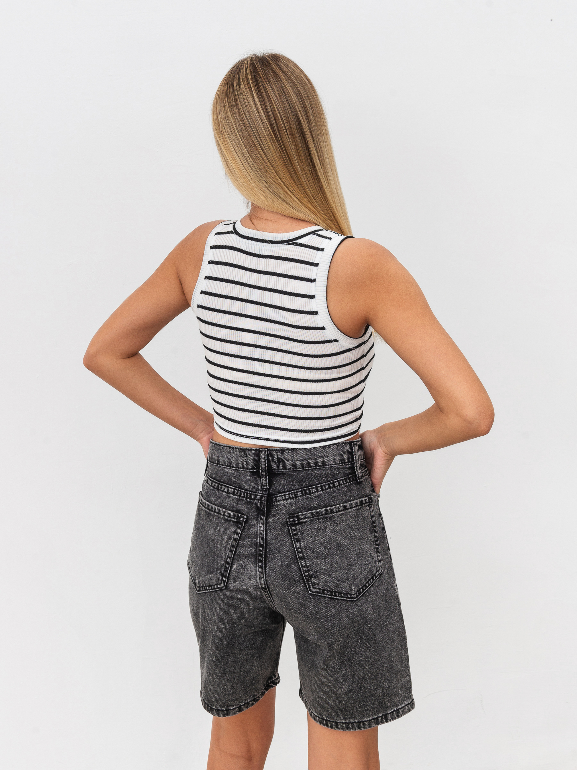 Вкорочений базовий топ з трикотажу у рубчик. Найкращий верх для літнього сезону — максимально відкриває тіло, не парить, пасує до всіх речей у гардеробі. Актуальності виробу додає широкий кант. Виріб йде у 4 кольорах — чорному, білому, бежевому, блакитному. Радимо поєднувати із шортами (наприклад, «Джуно»), спідницями (наприклад, «Монреаль», «Найробі», «Ватерлоо», «Сельма»), джинсами (наприклад, «Таллін», «Хартум»), легінсами та велосипедками. Колір виробу на фотографії може відрізнятися від реального кольору товару, що пов'язано з особливостями передачі кольору на моніторі, налаштуваннями фотоапаратури чи іншими факторами. XS Довжина по спині : 33 см Напівобхват грудей : 27+ см Плечі : 24 см Напівобхват талії : 28 см S Довжина по спині : 35 см Напівобхват грудей : 31+ см Плечі : 25 см Напівобхват талії : 30 см M Довжина по спині : 37 см Напівобхват грудей : 35+ см Плечі : 26 см Напівобхват талії : 36 см L Довжина по спині : 38 см Напівобхват грудей : 40+ см Плечі : 27 см Напівобхват талії : 41 см