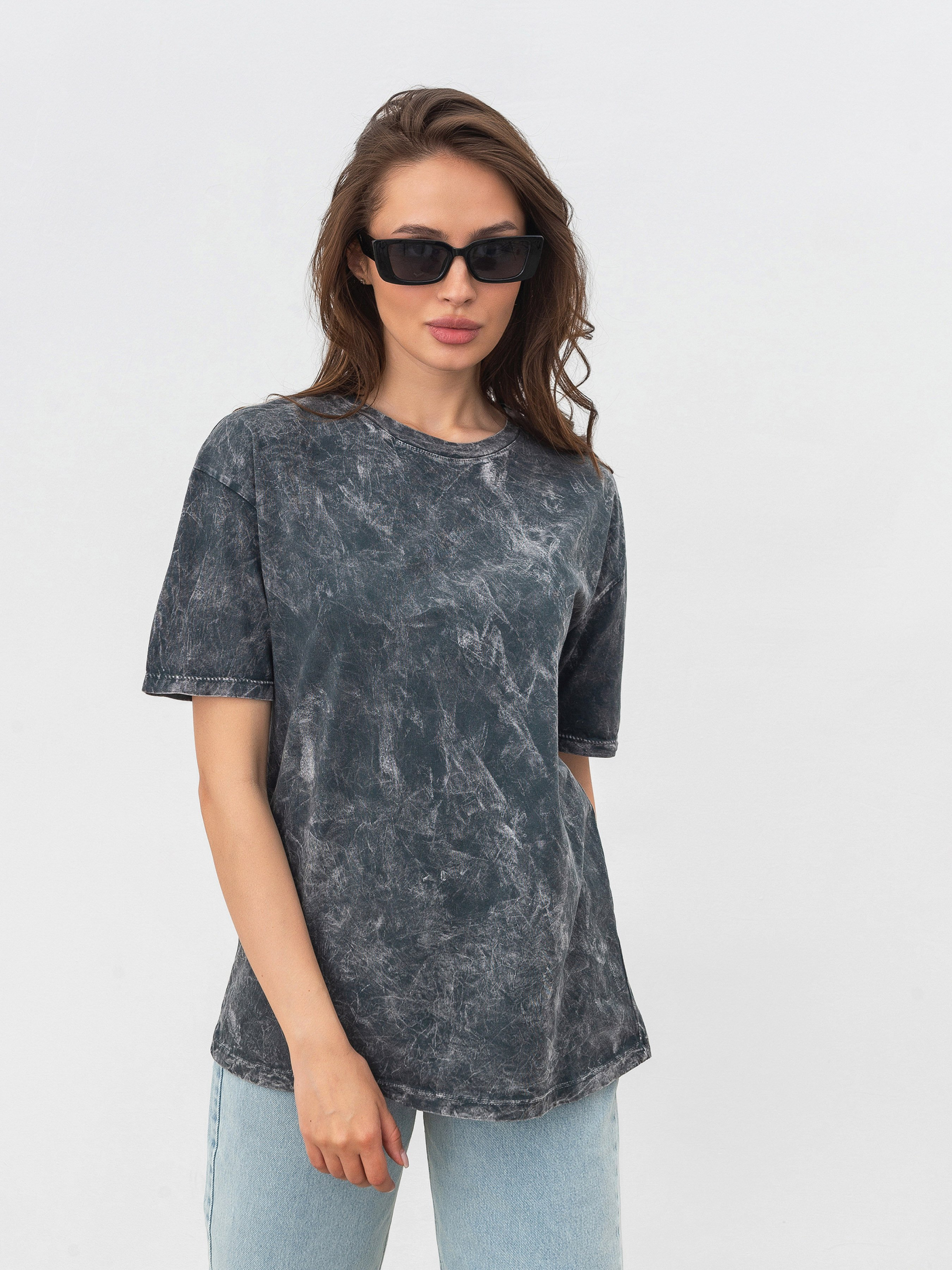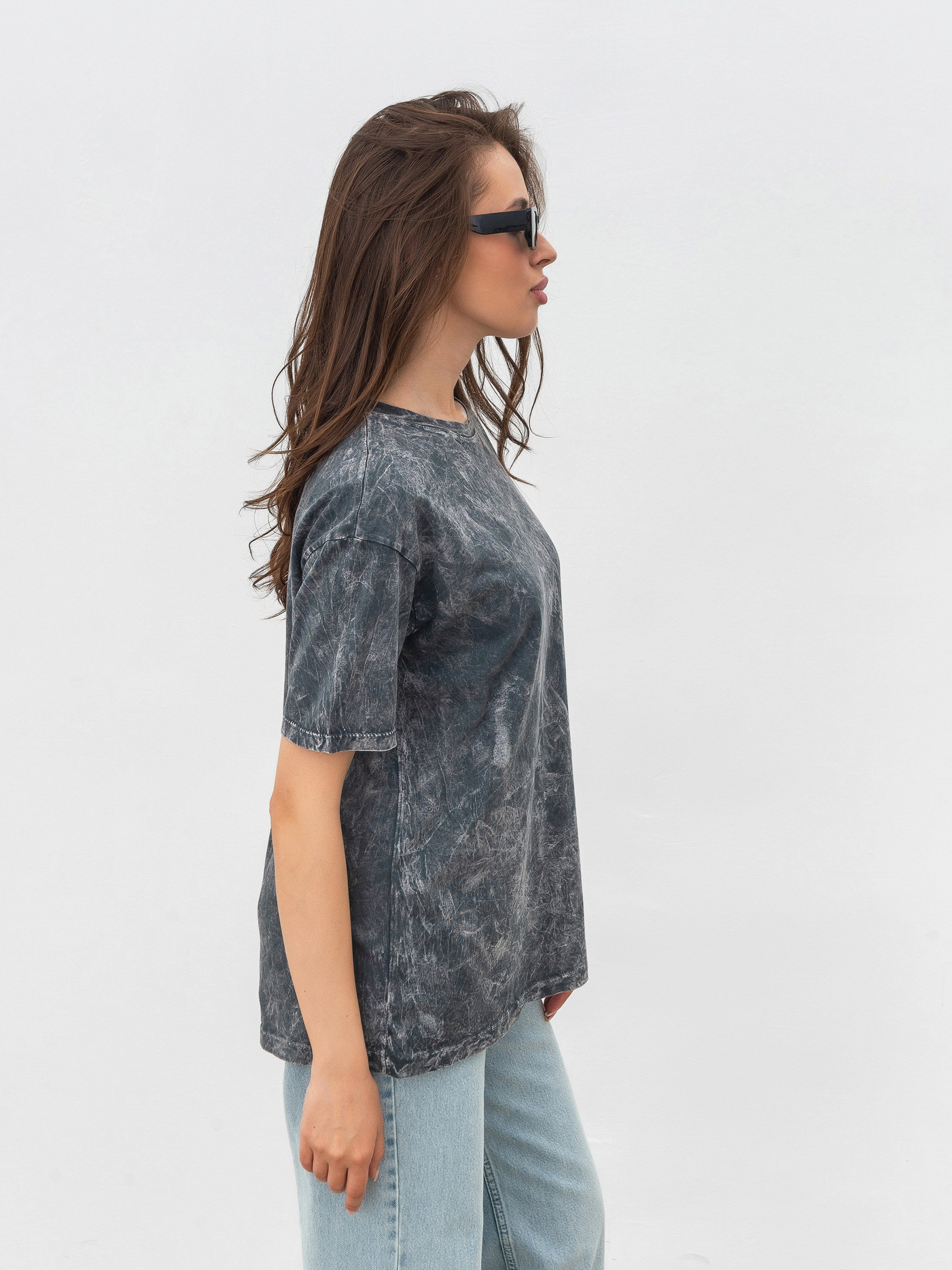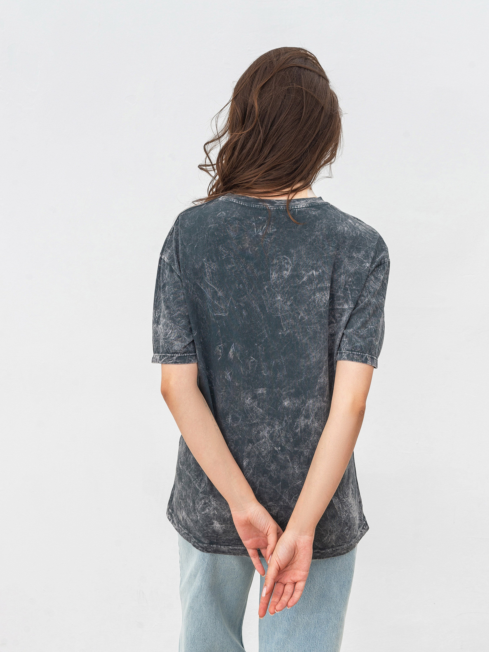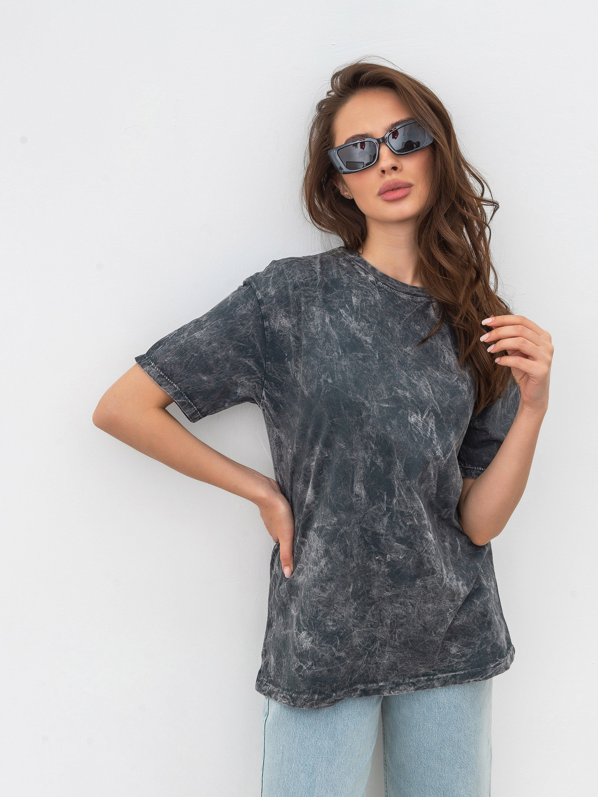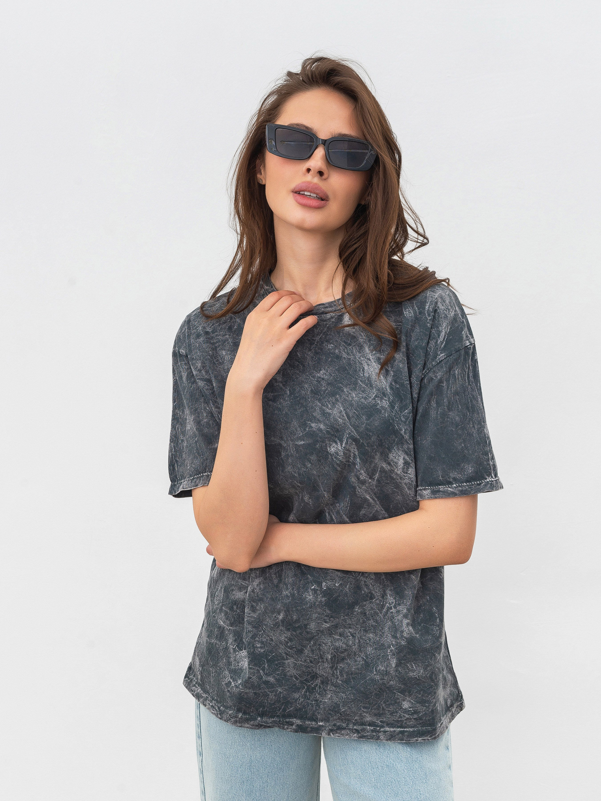 Футболка вільного фасону з вареним ефектом. Доповнена нашим дизайнерським принтом. Матеріал: проварена бавовна. Модель має спущений плечовий шов. Стильний і акцентний базовий верх. Комбінувати можна з джинсами або однотонними палаццо, доповнюючи ременем. S:- Довжина по спині : 66 см; Довжина рукава : 20 см; Напівобхват грудей : 50 см; Ширина плечей : 52 см; Напівобхват талії : 52 см, M:- Довжина по спині : 66 см; Довжина рукава : 20 см; Напівобхват грудей : 53 см; Ширина плечей : 52 см; Напівобхват талії : 56 см, L:- Довжина по спині : 67 см; Довжина рукава : 20 см; Напівобхват грудей : 54 см; Ширина плечей : 54 см; Напівобхват талії : 56 см.