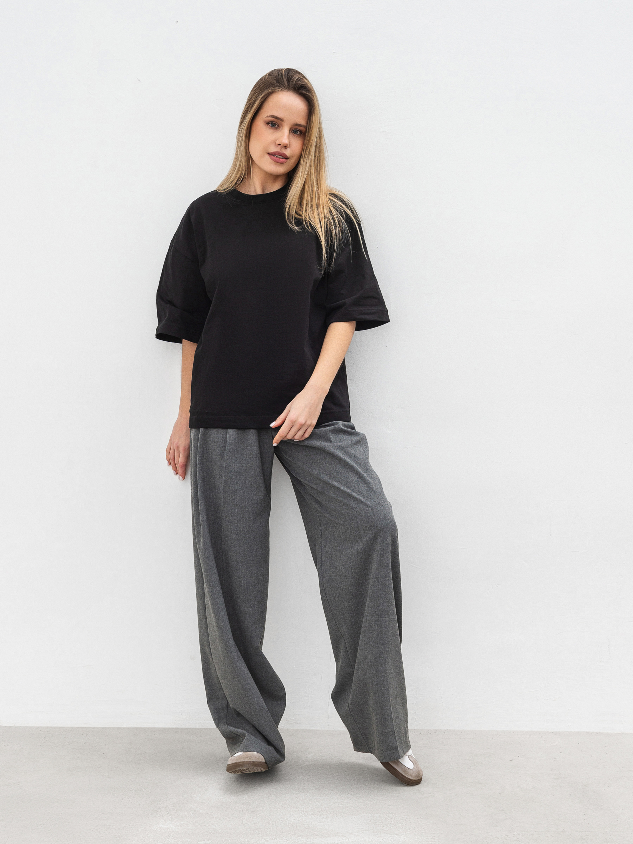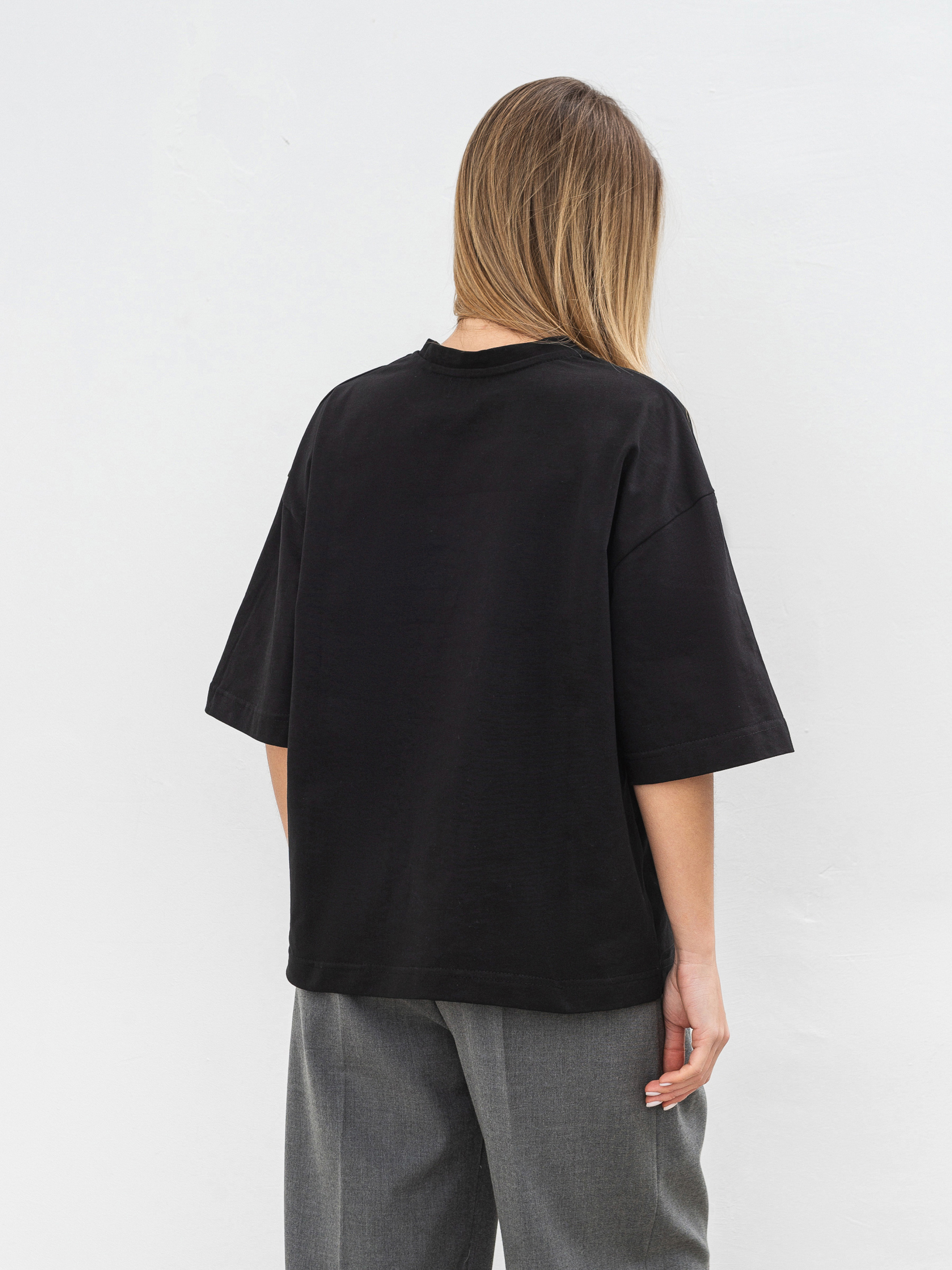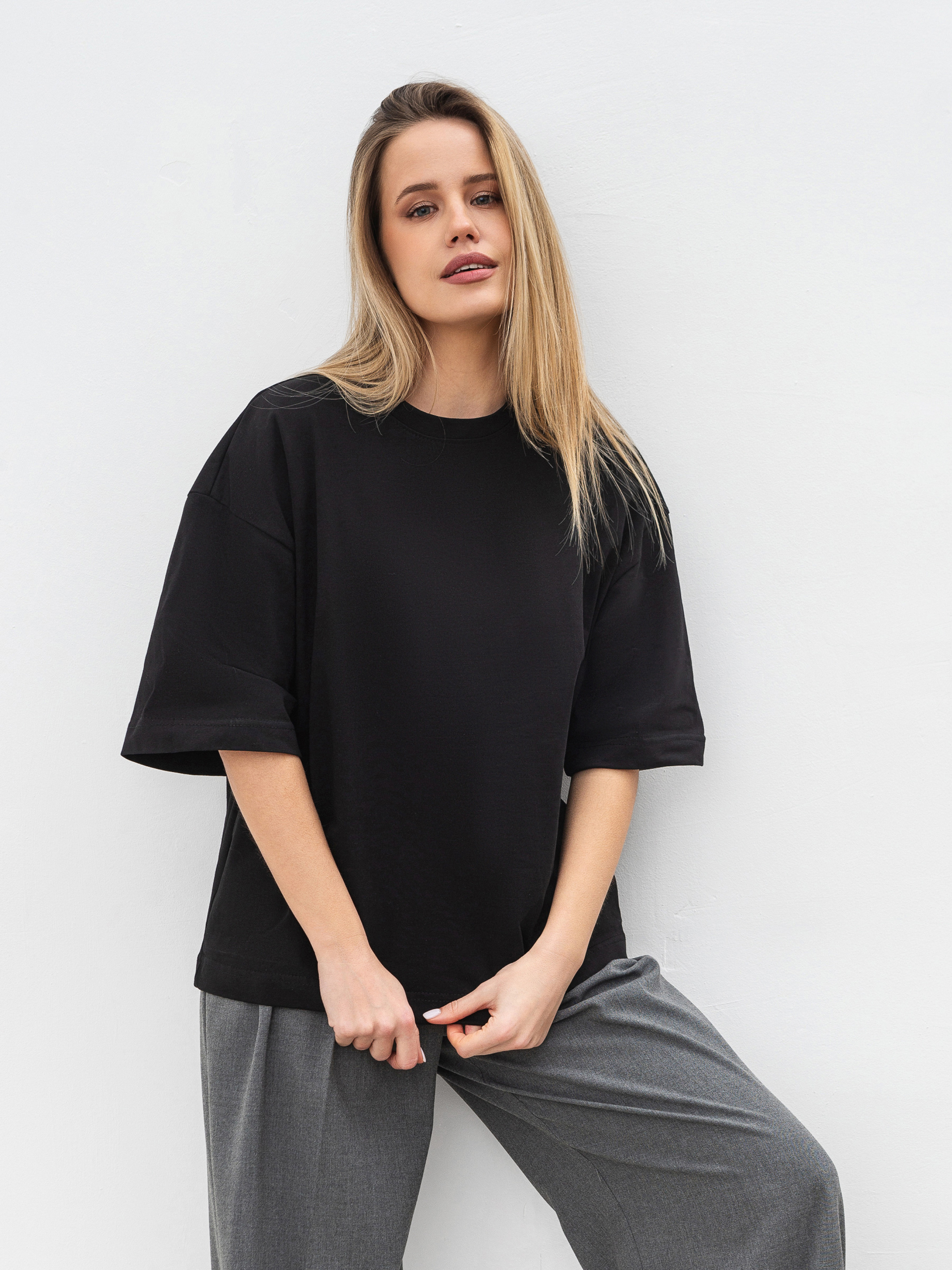 Простий, але стильний базовий елемент футболка Бейсік стане незамінною частиною будь-якого гардеробу. Модель виготовлена з м'якого трикотажу кулір із 100% бавовни, що забезпечує комфорт і чудову циркуляцію повітря. Особливість цієї футболки спущена лінія плеча і прямий фасон, який підходить для різних типів фігур. Вибір довжини (коротка та подовжена модель) дозволяє підібрати найбільш зручний варіант під ваш стиль. Доступна в різноманітних кольорах, вона без зусиль поєднується з іншими базовими елементами гардероба ідеальна для будь-якої ситуації, від повсякденних прогулянок до більш витончених образів на вихід. Довжина по спині - 58 см Напівобхват грудей - 55 см Напівобхват талії - 54 см Плечі - 55 см Довжина рукава - 23 см