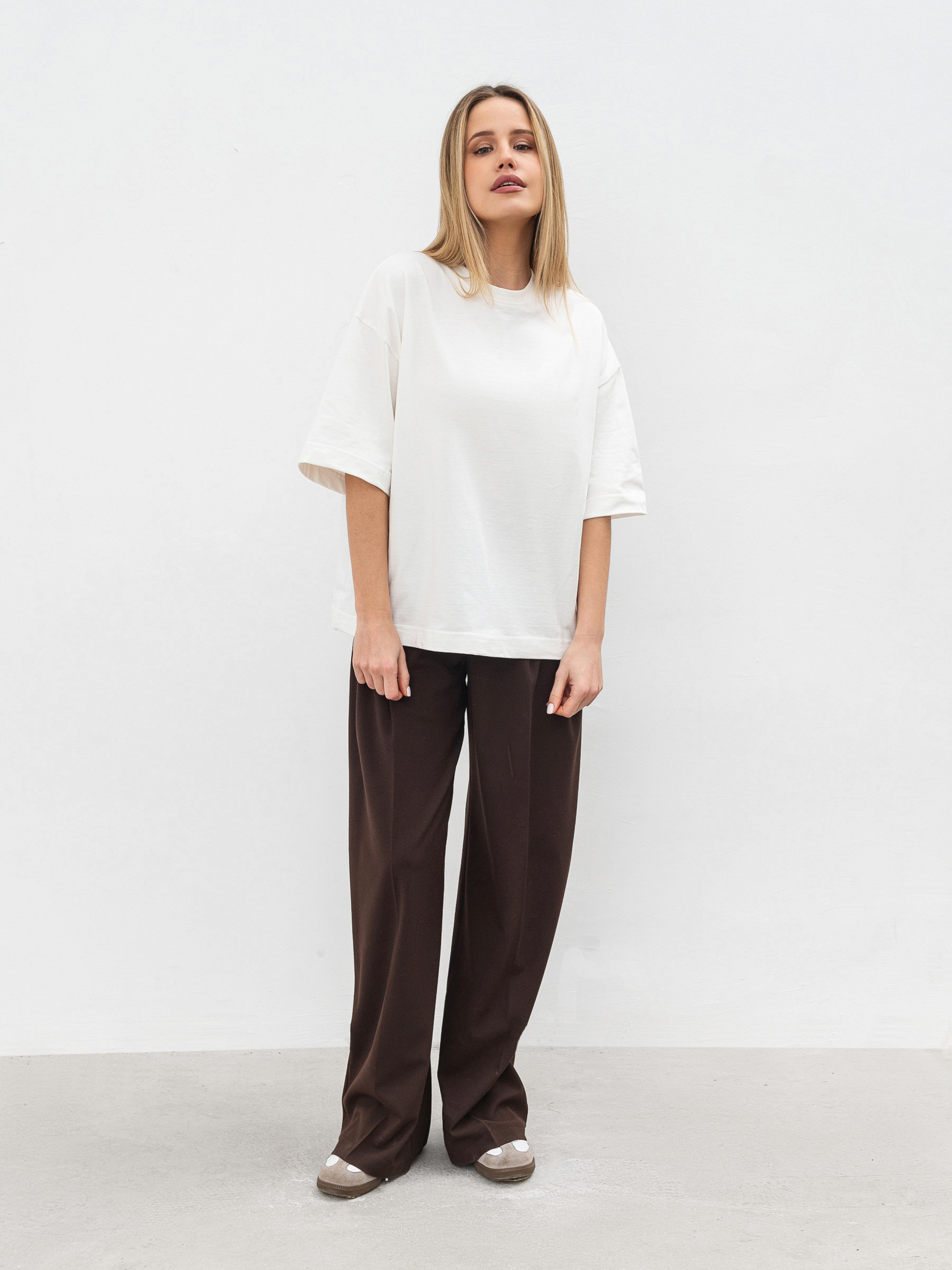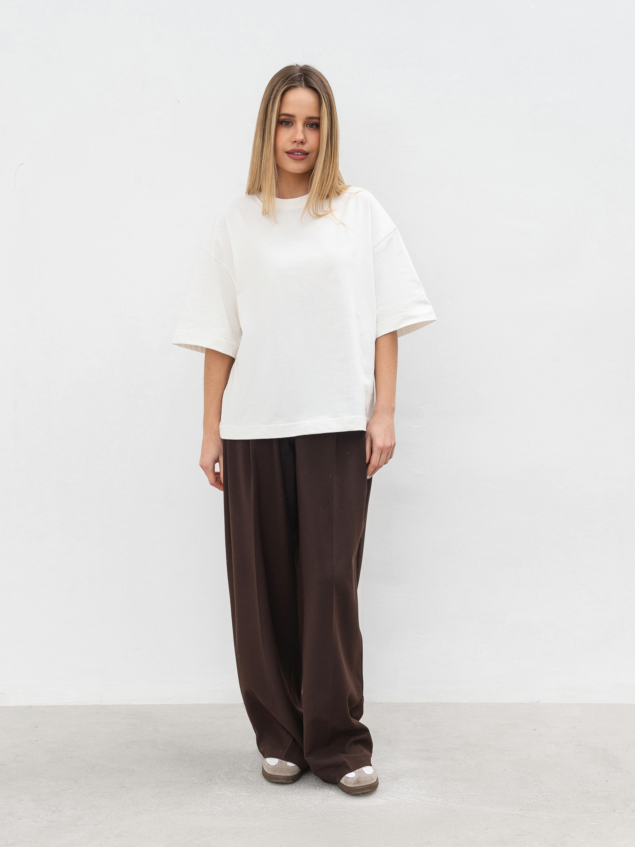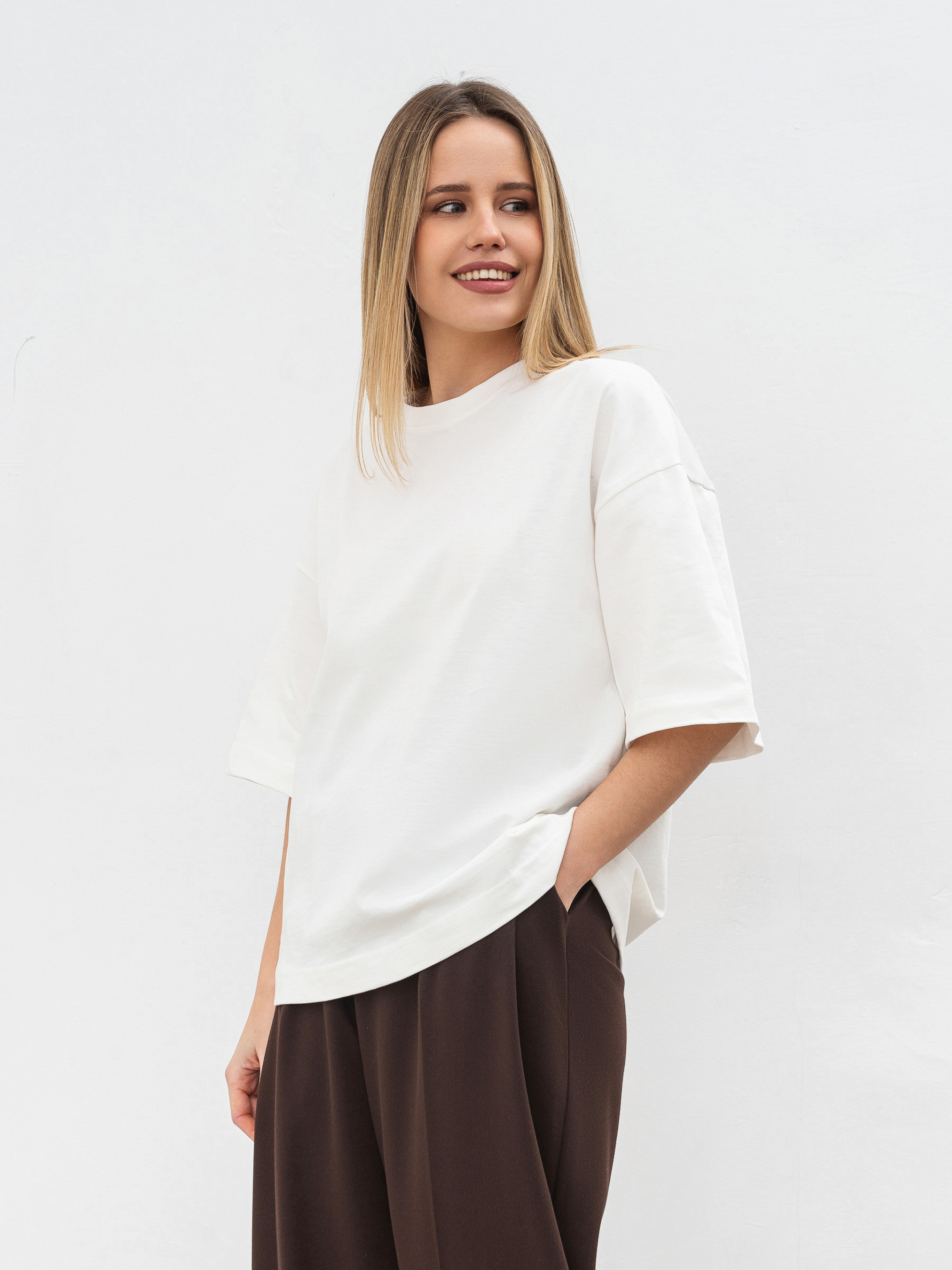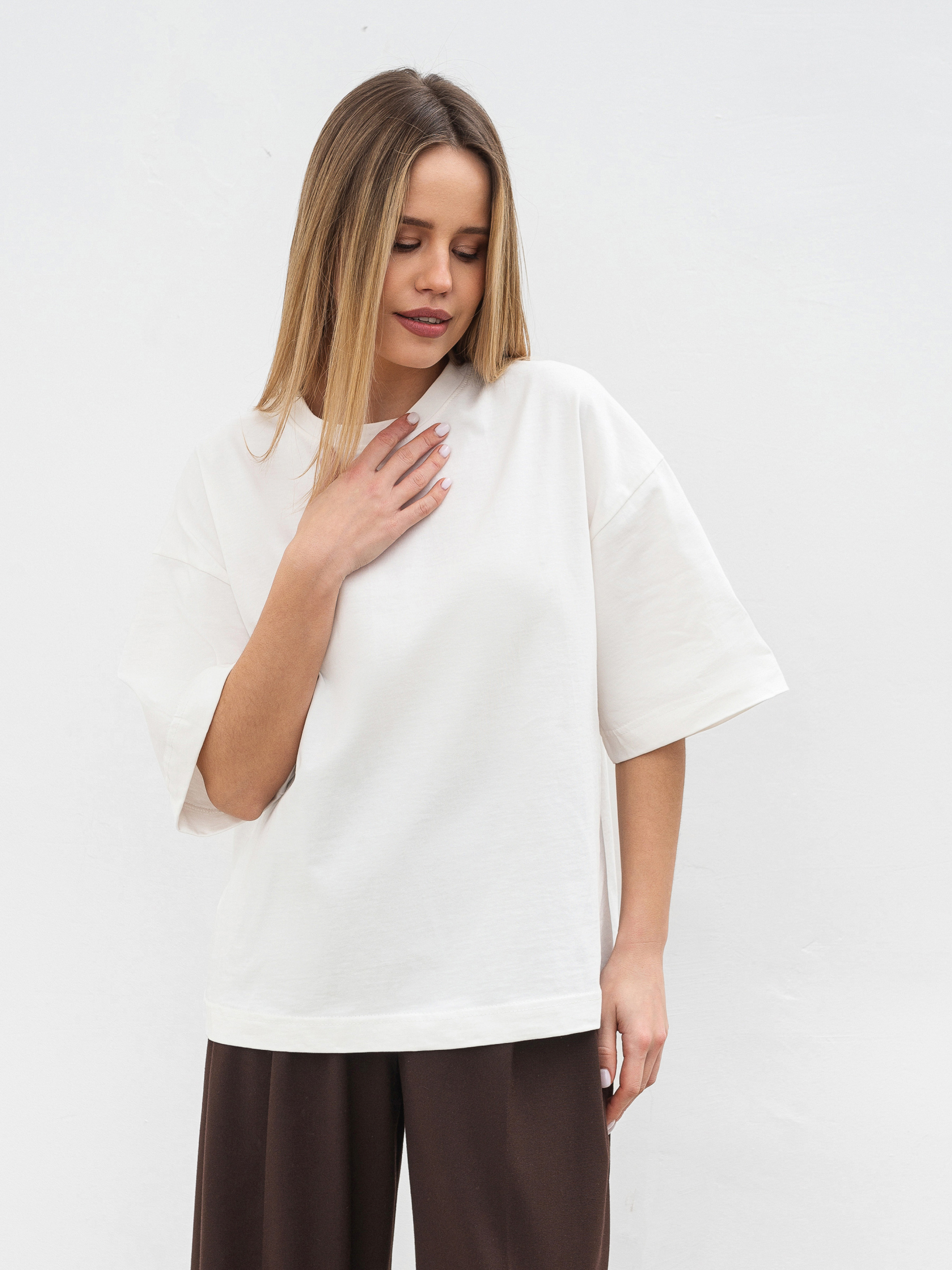 Простий, але стильний базовий елемент футболка Бейсік стане незамінною частиною будь-якого гардеробу. Модель виготовлена з м'якого трикотажу кулір із 100% бавовни, що забезпечує комфорт і чудову циркуляцію повітря. Особливість цієї футболки спущена лінія плеча і прямий фасон, який підходить для різних типів фігур. Вибір довжини (коротка та подовжена модель) дозволяє підібрати найбільш зручний варіант під ваш стиль. Доступна в різноманітних кольорах, вона без зусиль поєднується з іншими базовими елементами гардероба ідеальна для будь-якої ситуації, від повсякденних прогулянок до більш витончених образів на вихід. Довжина по спині - 58 см Напівобхват грудей - 55 см Напівобхват талії - 54 см Плечі - 55 см Довжина рукава - 23 см