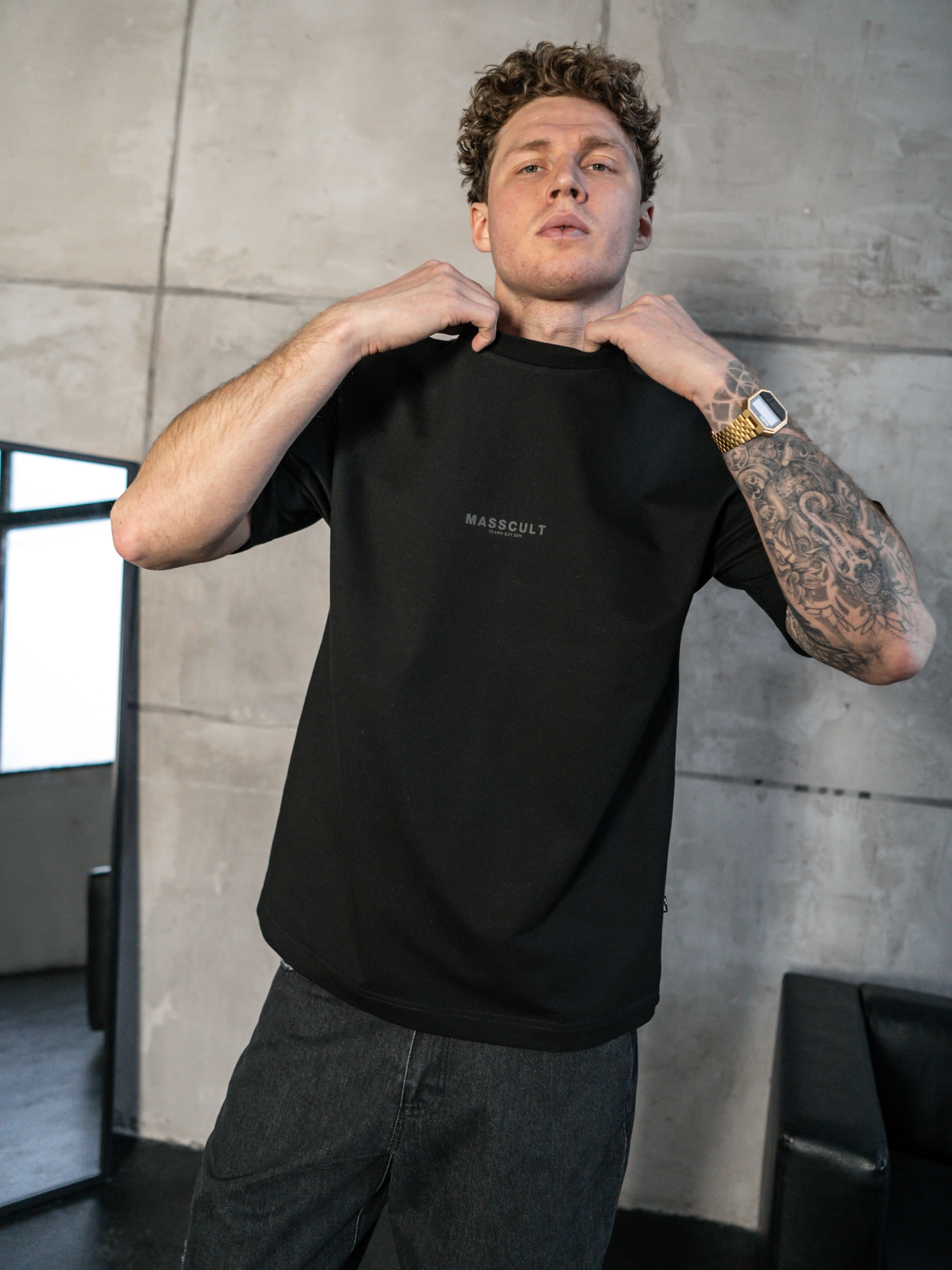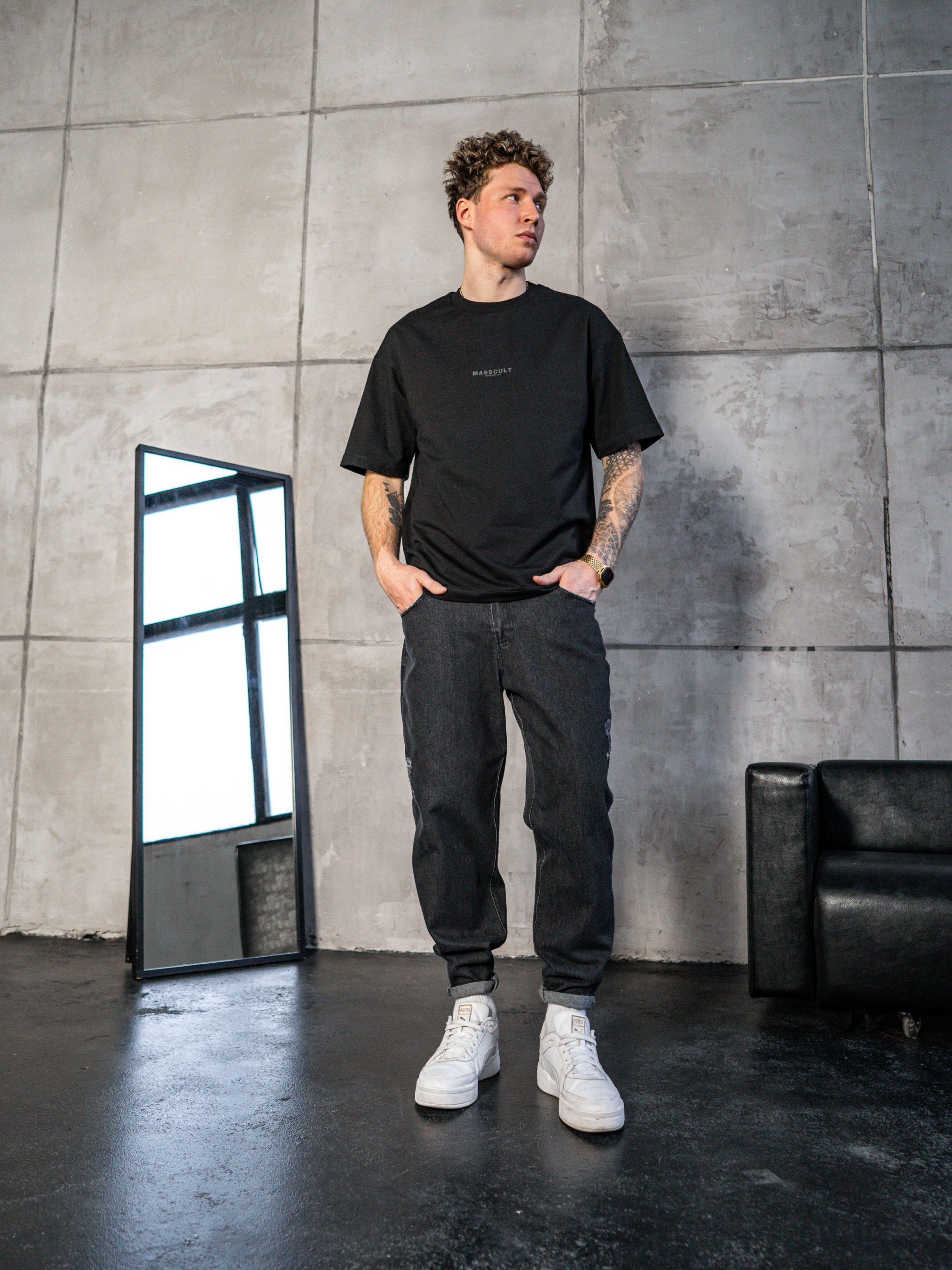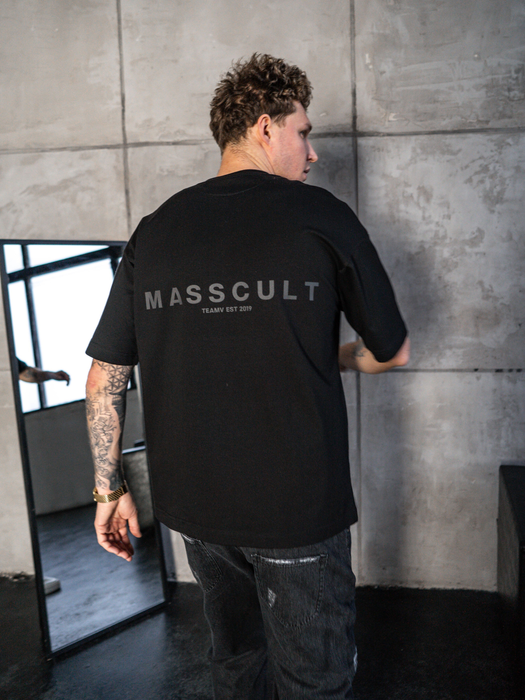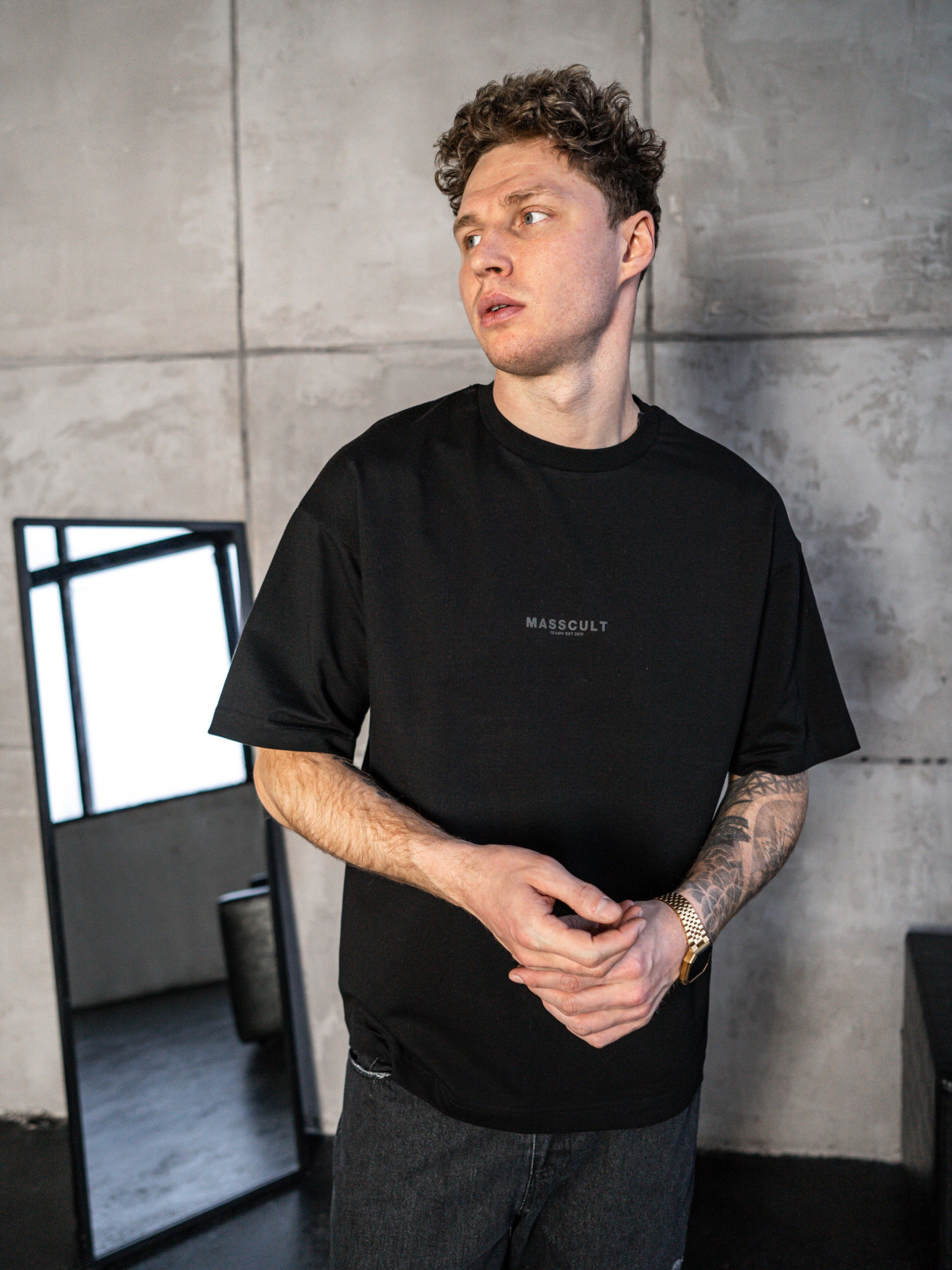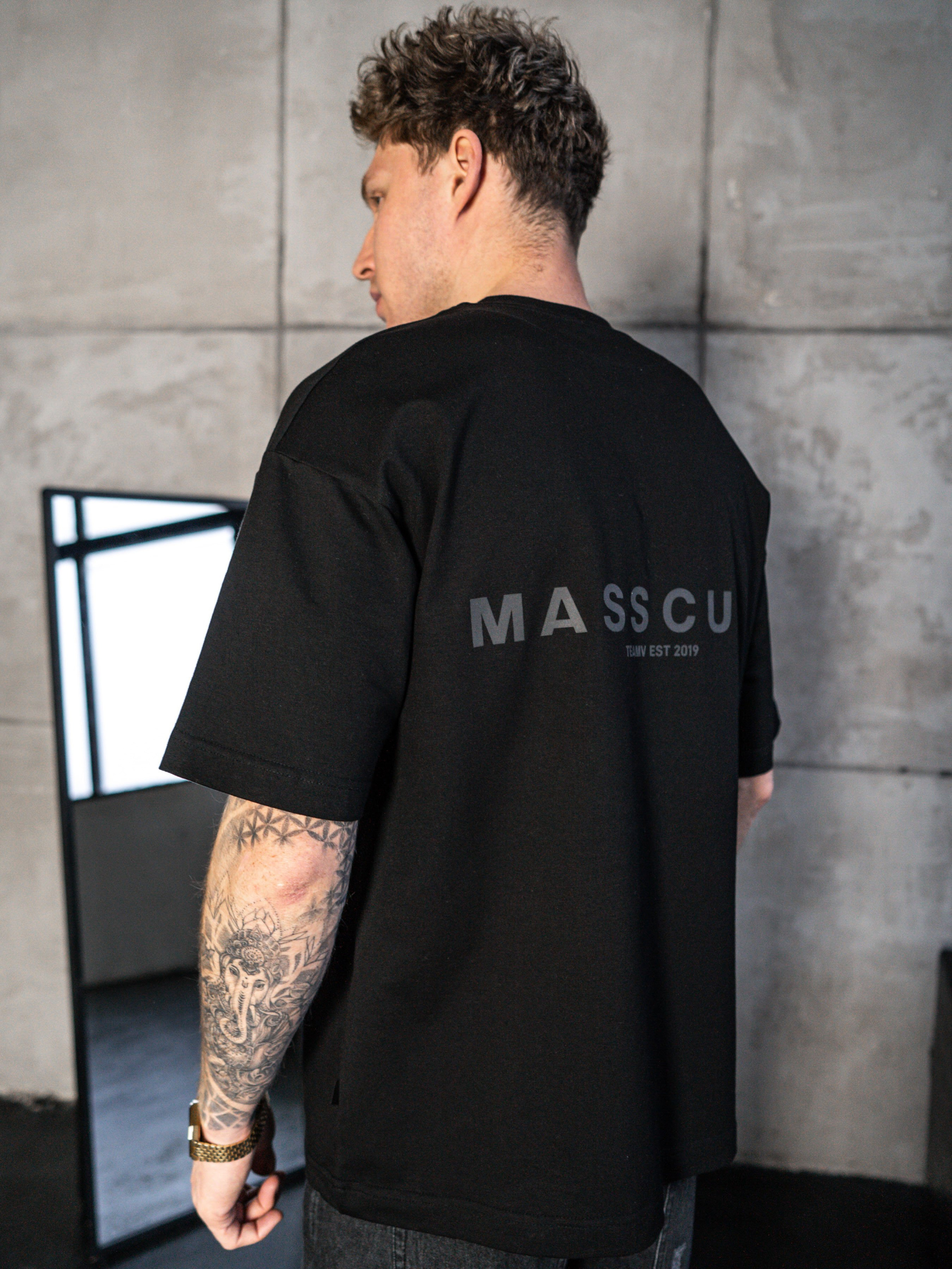 Подовжена футболка Оверсайз. Футболка вільного крою з принтом MASSCULT. Стійка до зовнішніх дій, не втрачає форму після прання. Еластичний матеріал середньої густини 220г/м². Склад - Бавовна (100%) На фотографії розмір L Параметри моделі: зріст – 185см, вага – 85кг