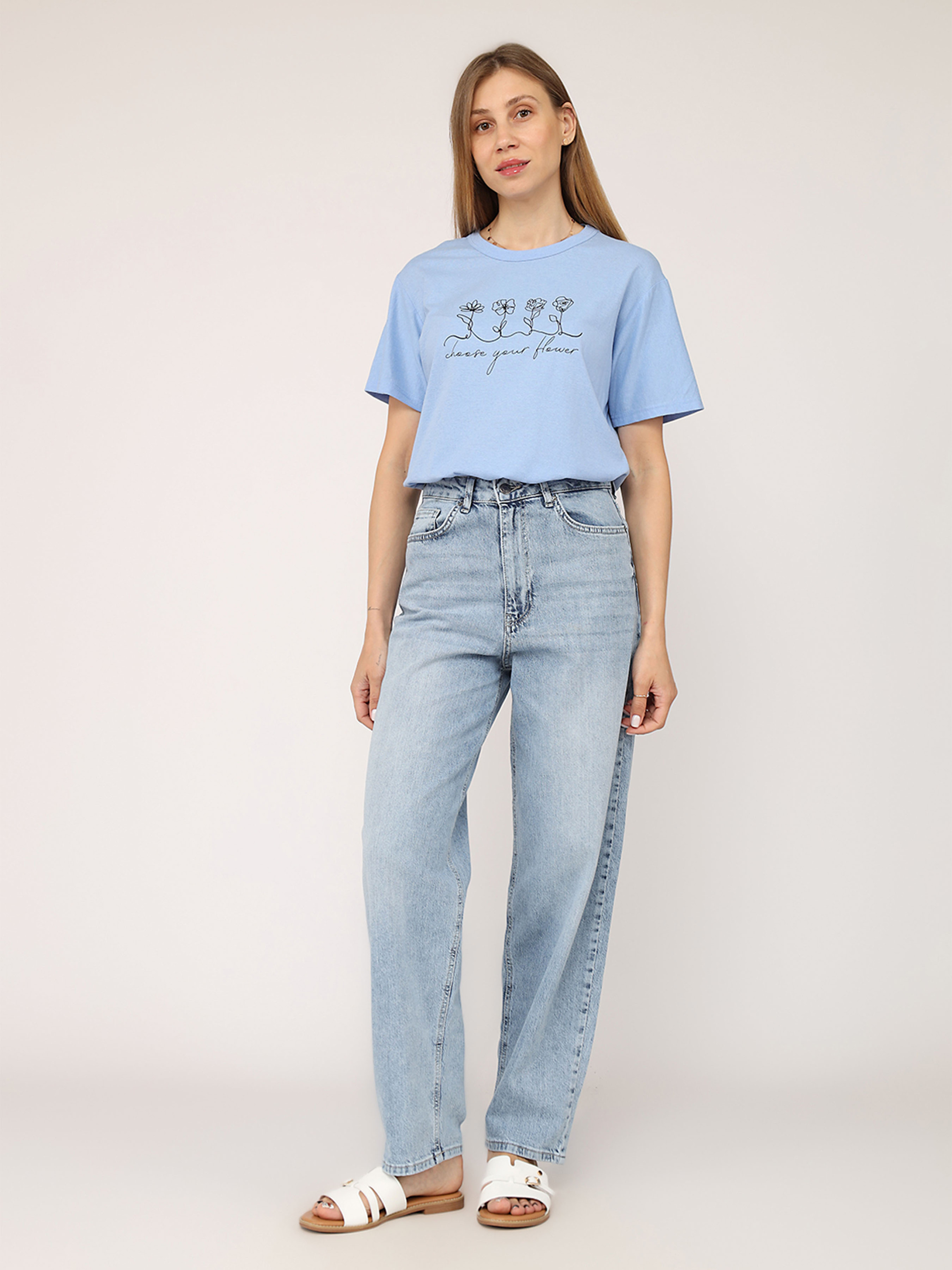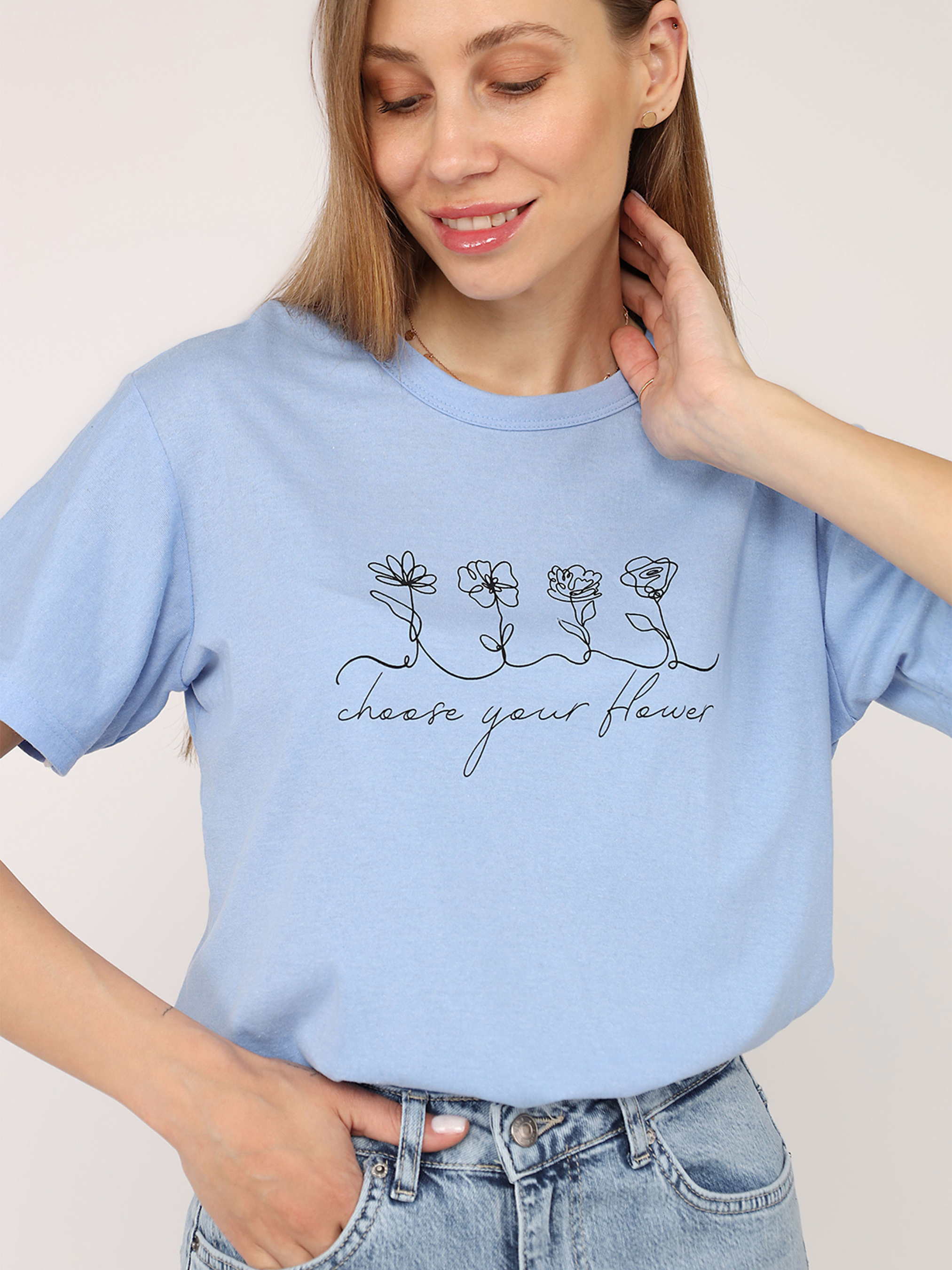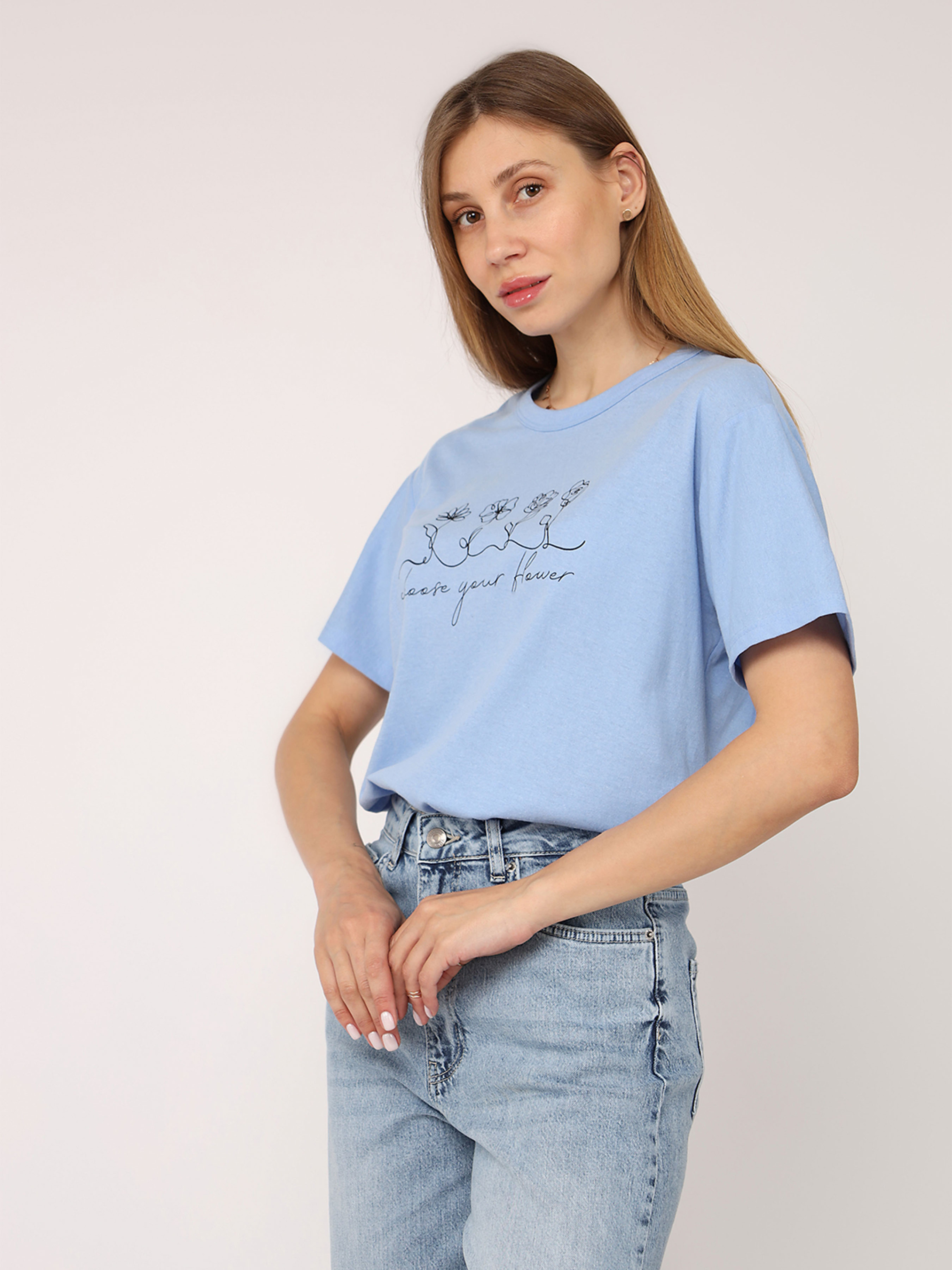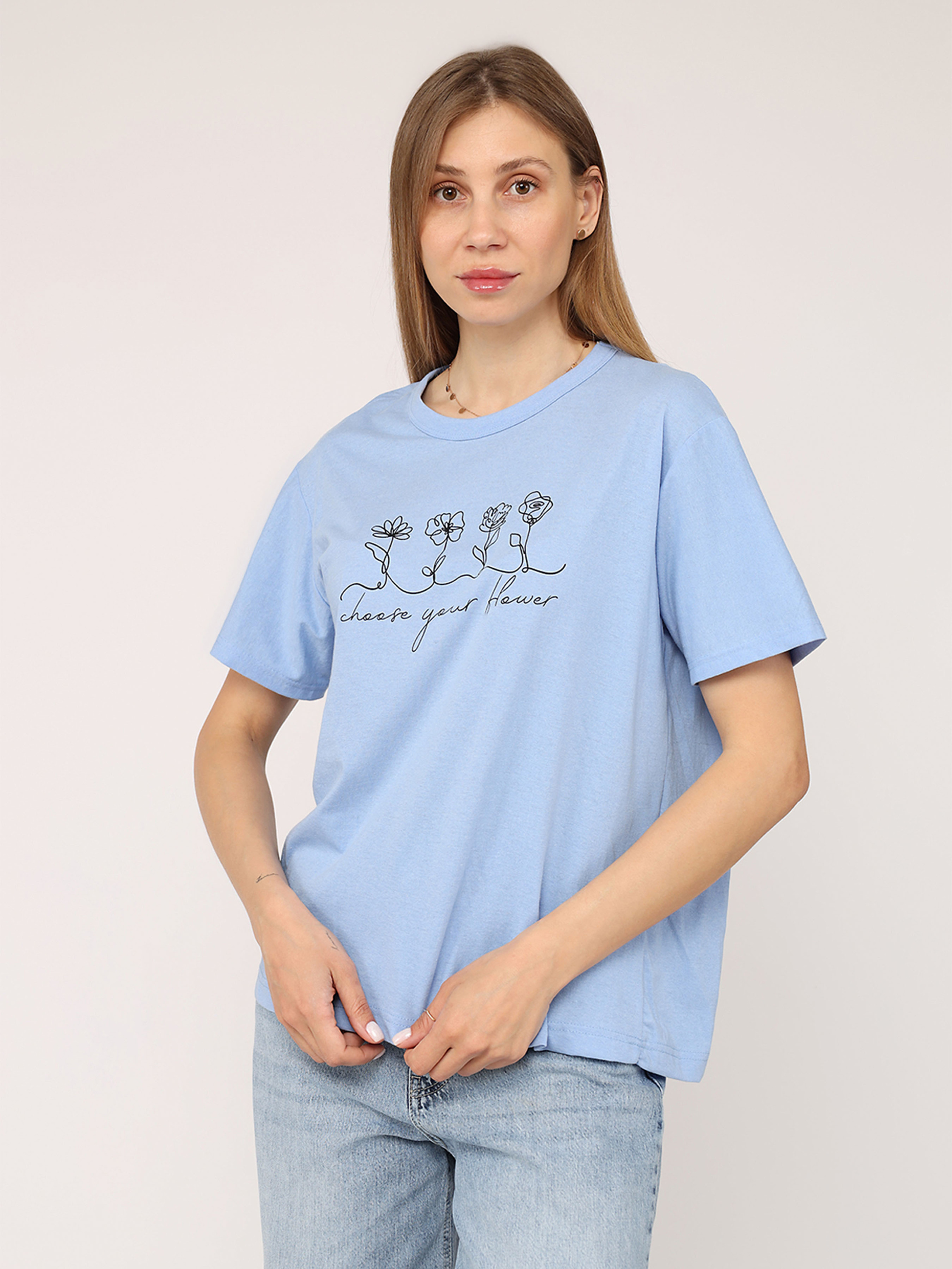 Футболка з коротким рукавом жіноча – це стильний і універсальний елемент гардеробу, який ідеально підходить для повсякденного носіння. Завдяки своєму лаконічному дизайну вона легко поєднується з джинсами, шортами чи спідницями, створюючи комфортний і невимушений образ. Виготовлена з м’якої, приємної до тіла тканини, ця футболка забезпечує відчуття легкості протягом усього дня. Короткі рукави додають їй практичності, роблячи чудовим вибором для теплих днів або активного відпочинку. Ця річ стане незамінною основою для створення casual-стилю чи яскравих комбінацій із аксесуарами. Додайте її до своєї колекції для універсального і завжди актуального образу! Особливості виробу: Колір: блакитний, з декоративним принтом спереду. Матеріал виготовлення: трикотаж. Склад: 50 % бавовна, 50 % поліестер. Довжина: середня. Крій: прямий. Сезон: літо. Параметри моделі: Зріст: 170 сантиметрів. Розмір на моделі: 46. Країна виробник: Туреччина.