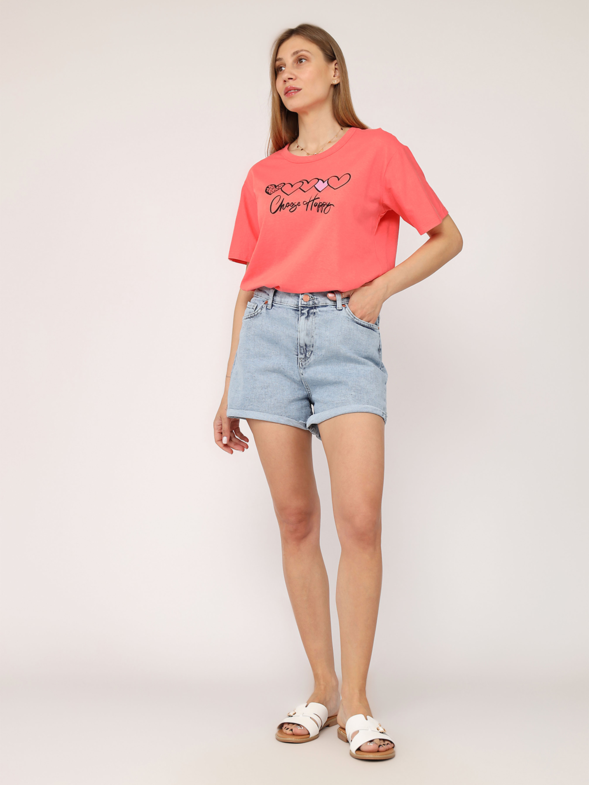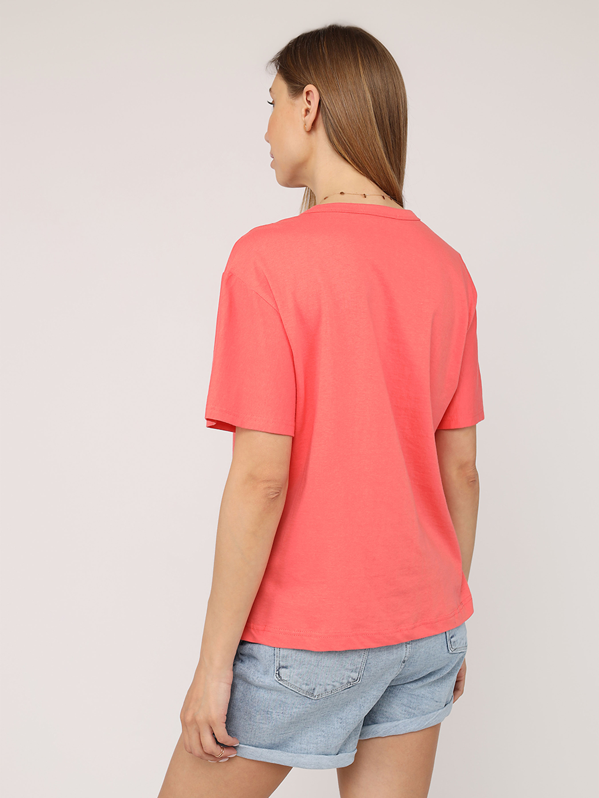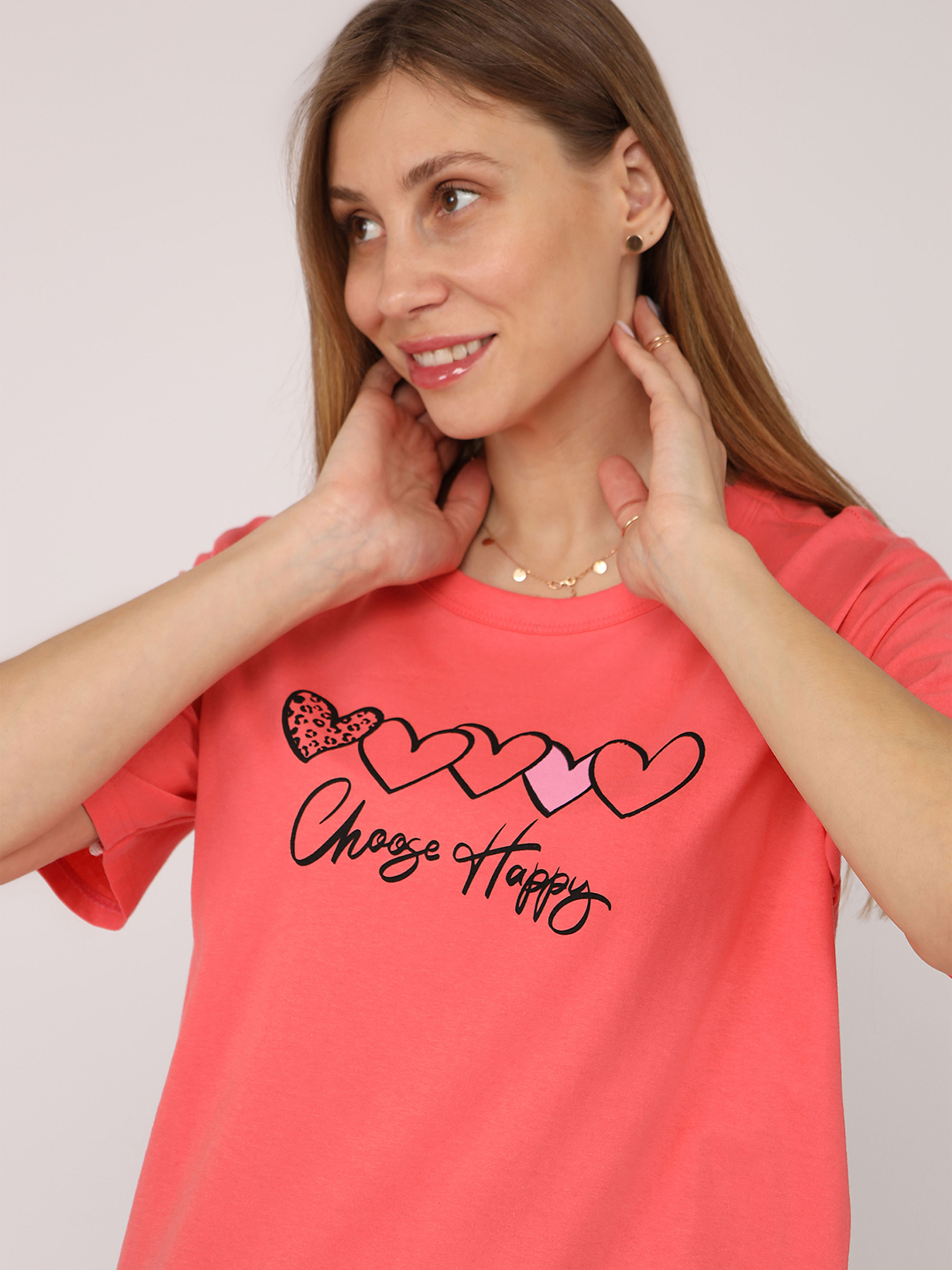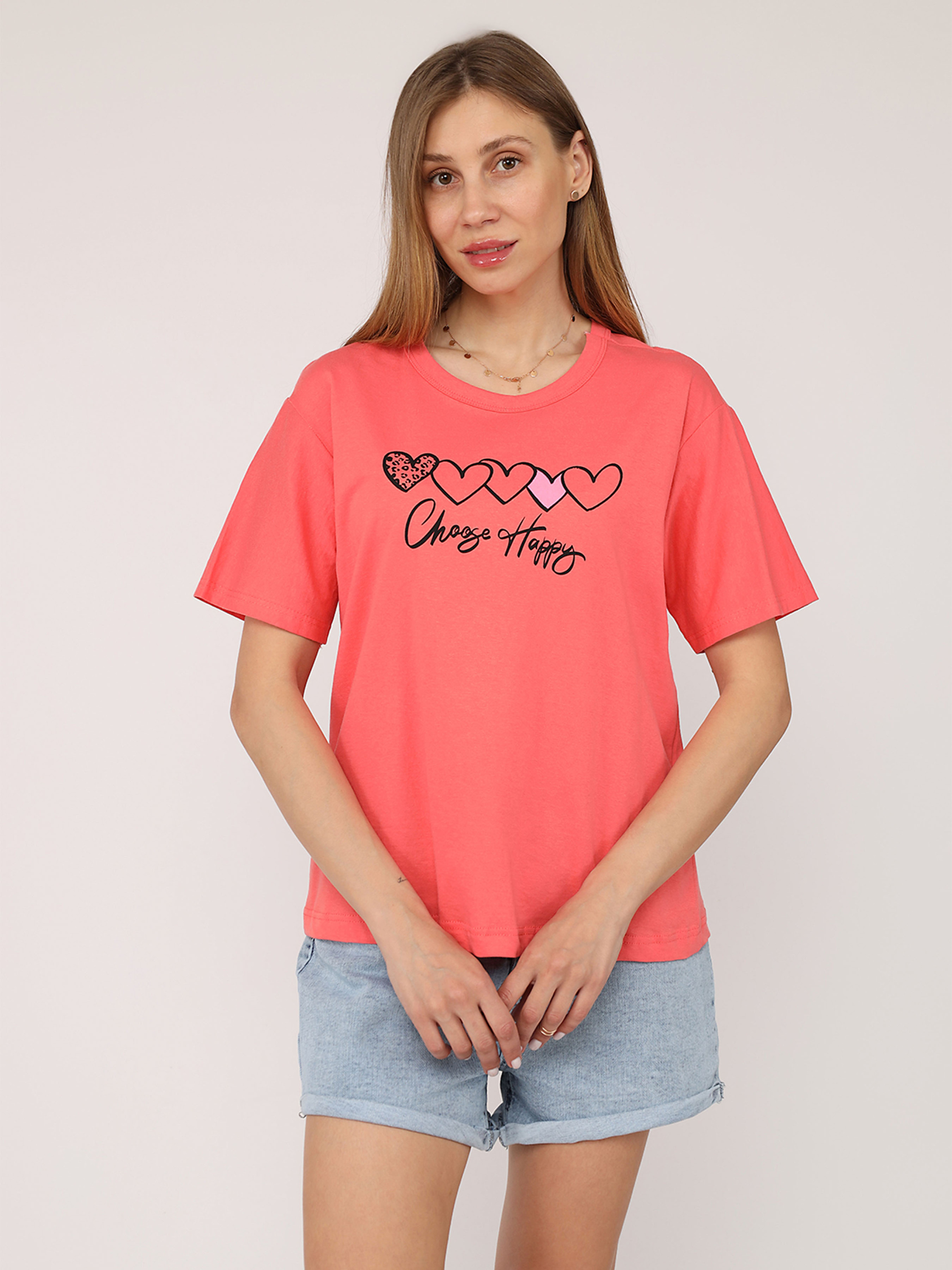 Футболка з коротким рукавом жіноча – це стильний і універсальний елемент гардеробу, який ідеально підходить для повсякденного носіння. Завдяки своєму лаконічному дизайну вона легко поєднується з джинсами, шортами чи спідницями, створюючи комфортний і невимушений образ. Виготовлена з м’якої, приємної до тіла тканини, ця футболка забезпечує відчуття легкості протягом усього дня. Короткі рукави додають їй практичності, роблячи чудовим вибором для теплих днів або активного відпочинку. Ця річ стане незамінною основою для створення casual-стилю чи яскравих комбінацій із аксесуарами. Додайте її до своєї колекції для універсального і завжди актуального образу! Особливості виробу: Колір: рожевий, з декоративним принтом спереду. Матеріал виготовлення: трикотаж. Склад: 50 % бавовна, 50 % поліестер. Довжина: середня. Крій: прямий. Сезон: літо. Параметри моделі: Зріст: 170 сантиметрів. Розмір на моделі: 46. Країна виробник: Туреччина.