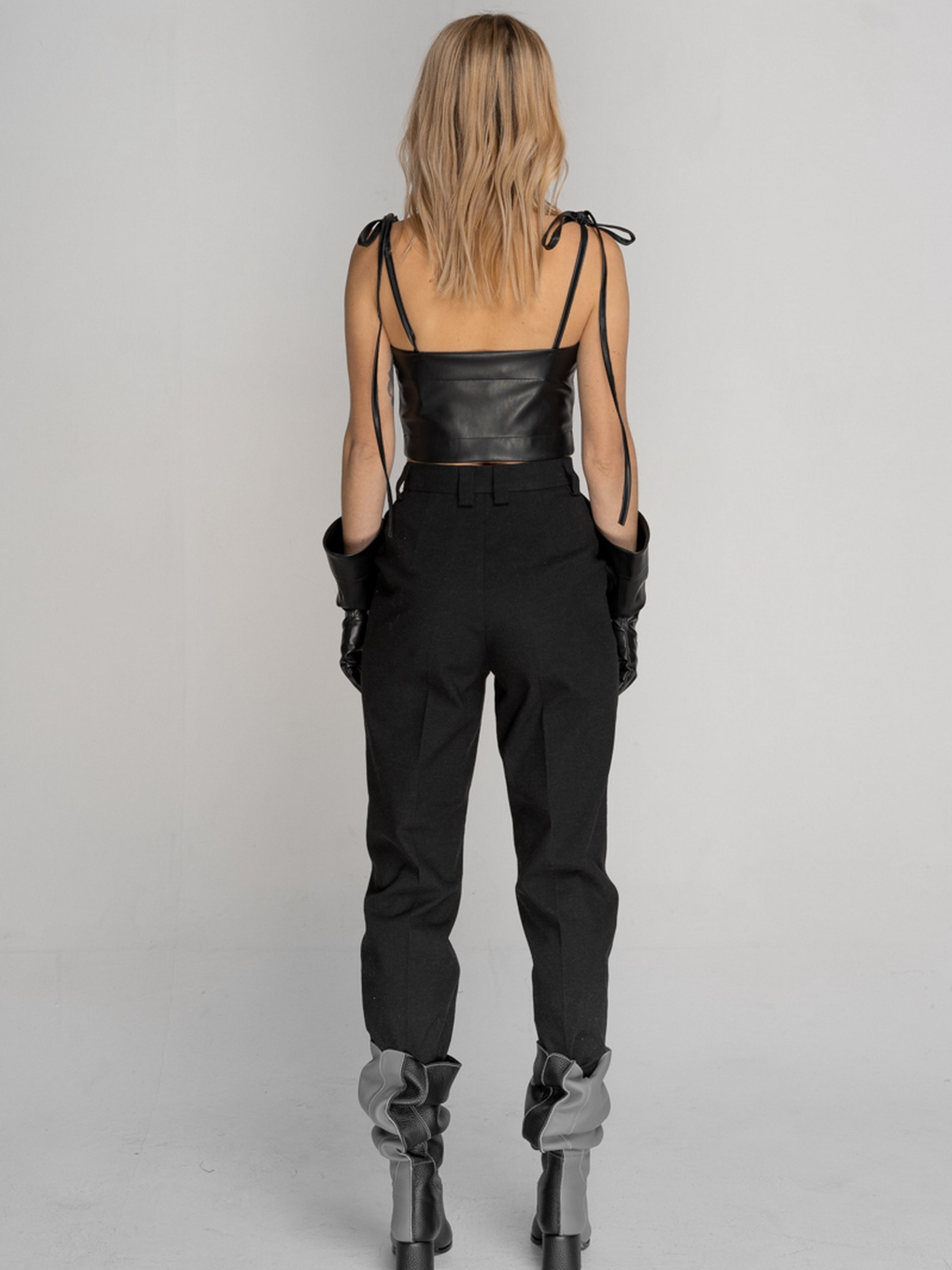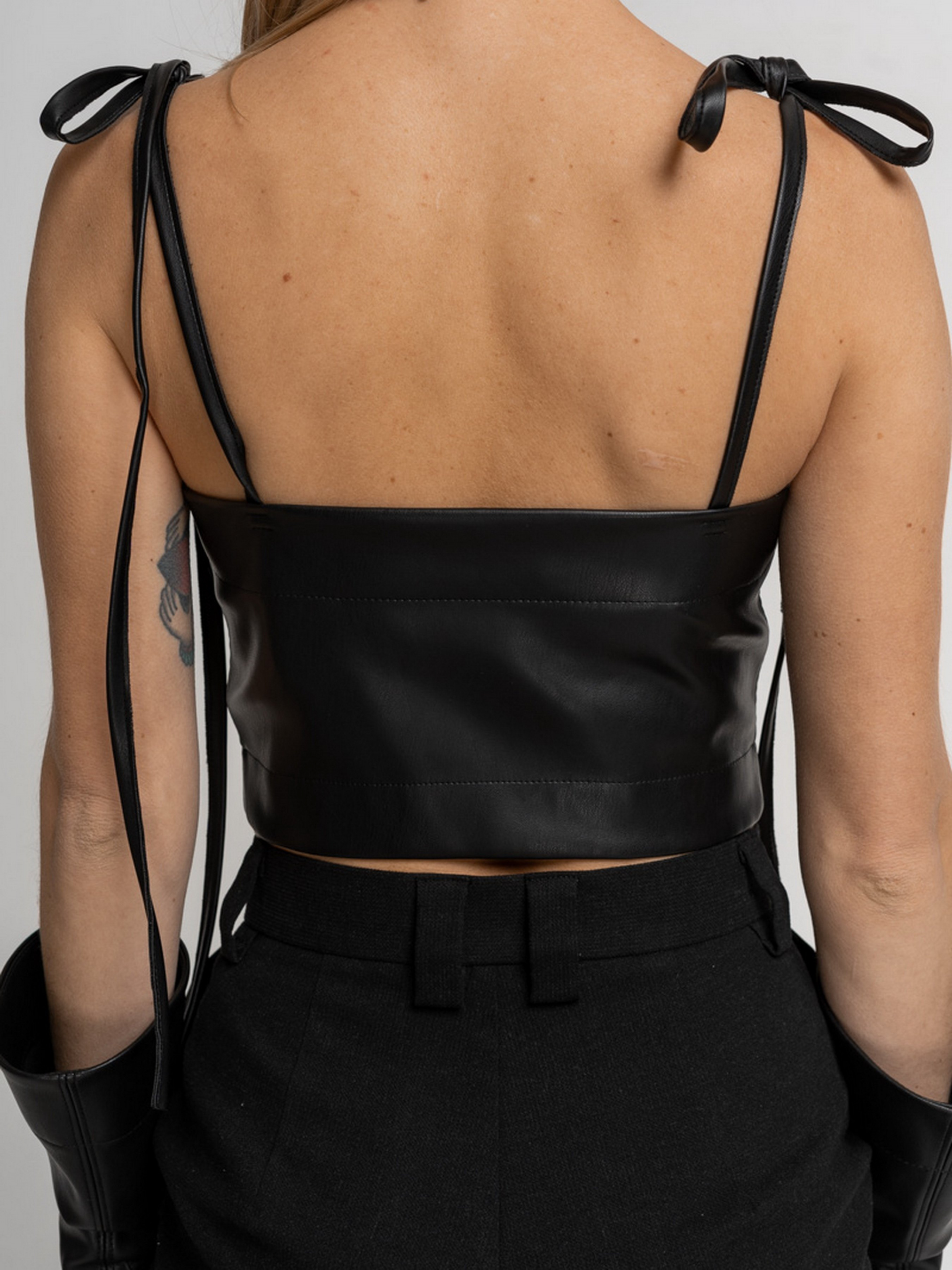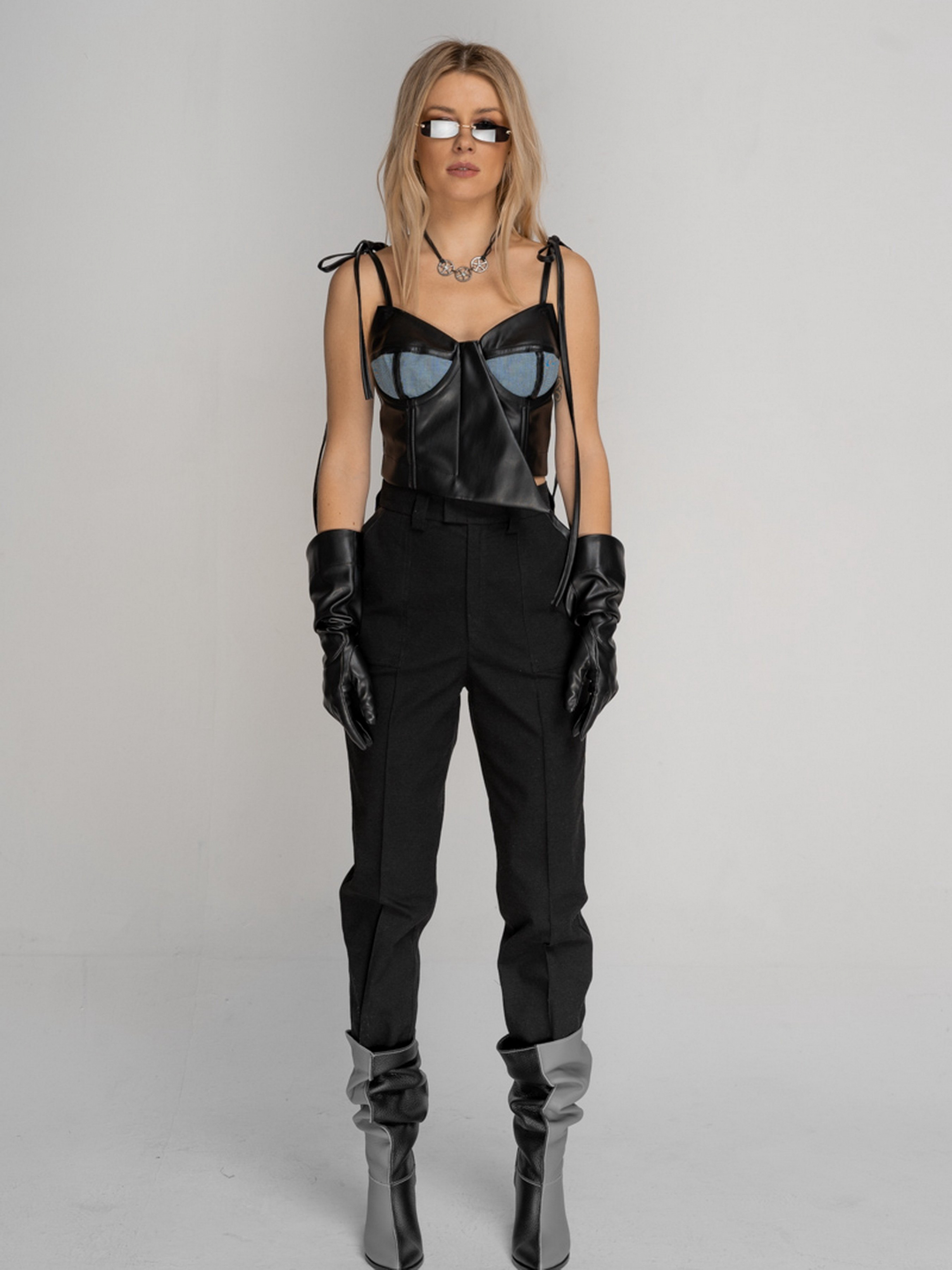 Зріст моделі 174, на ній надітКорсет - бюстьє з чашками на кісточках, виконаний з веганської шкіри. Нижня деталь чашки, виконана з тканини в клітину і декорована смужками з веганської шкіри. Застібка збоку на замку. Бретелі на зав'язках, на поличці є приховані кісточки. Носити можна як бюстье і як корсет на сорочку, гольф, сукню.ий розмір S. Догляд: Машинне прання 30°С- делікатний режим. Віджим: 600-800 об. Не використовувати режим сушки в пральній машинці. Не використовувати хлорні вибілювачі і засоби для виведення плям. Прасування виробу: середня температура, з виворітного боку. Склад: 50% Поліуретан 50% Поліестер