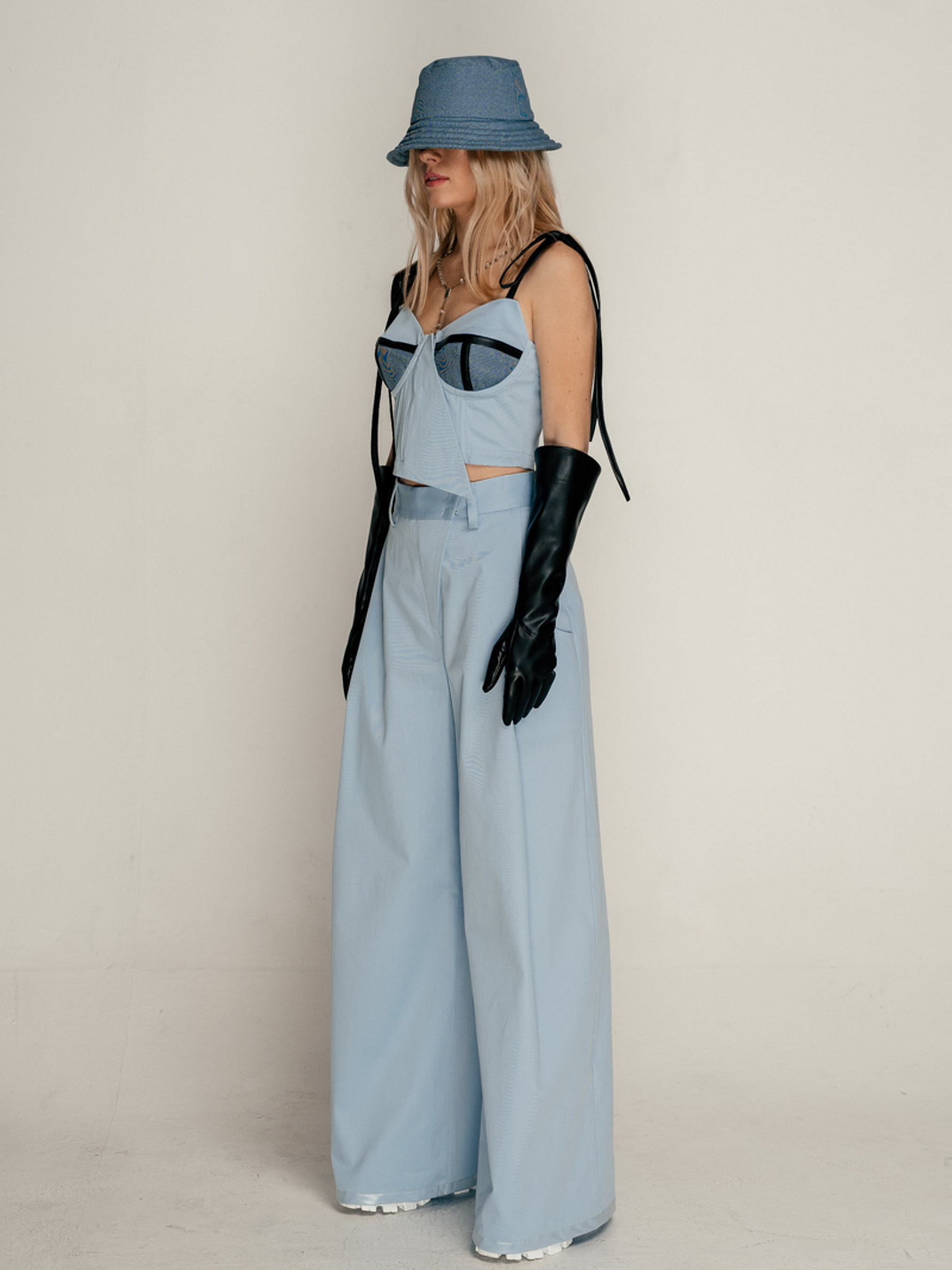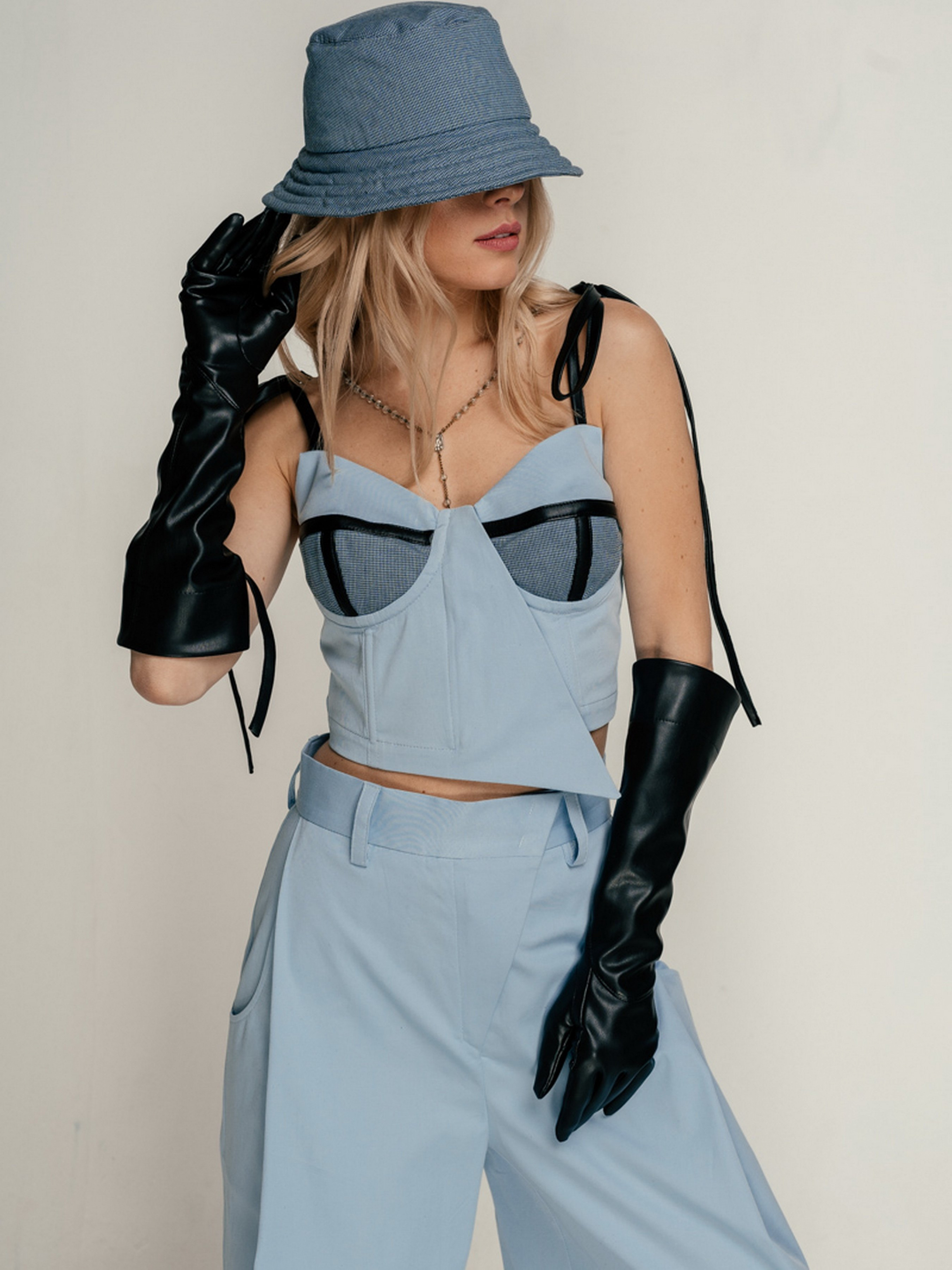 Корсет - бюстьє з чашками на кісточках, виконаний з хлопкової тканини. Нижня деталь чашки, виконана з тканини в клітину і декорована смужками з вегнанської шкіри. Застібка збоку на замку. Бретелі на зав'язках, на поличці є приховані кісточки. Носити можна окремо і як корсет на сорочку, гольф, сукню.