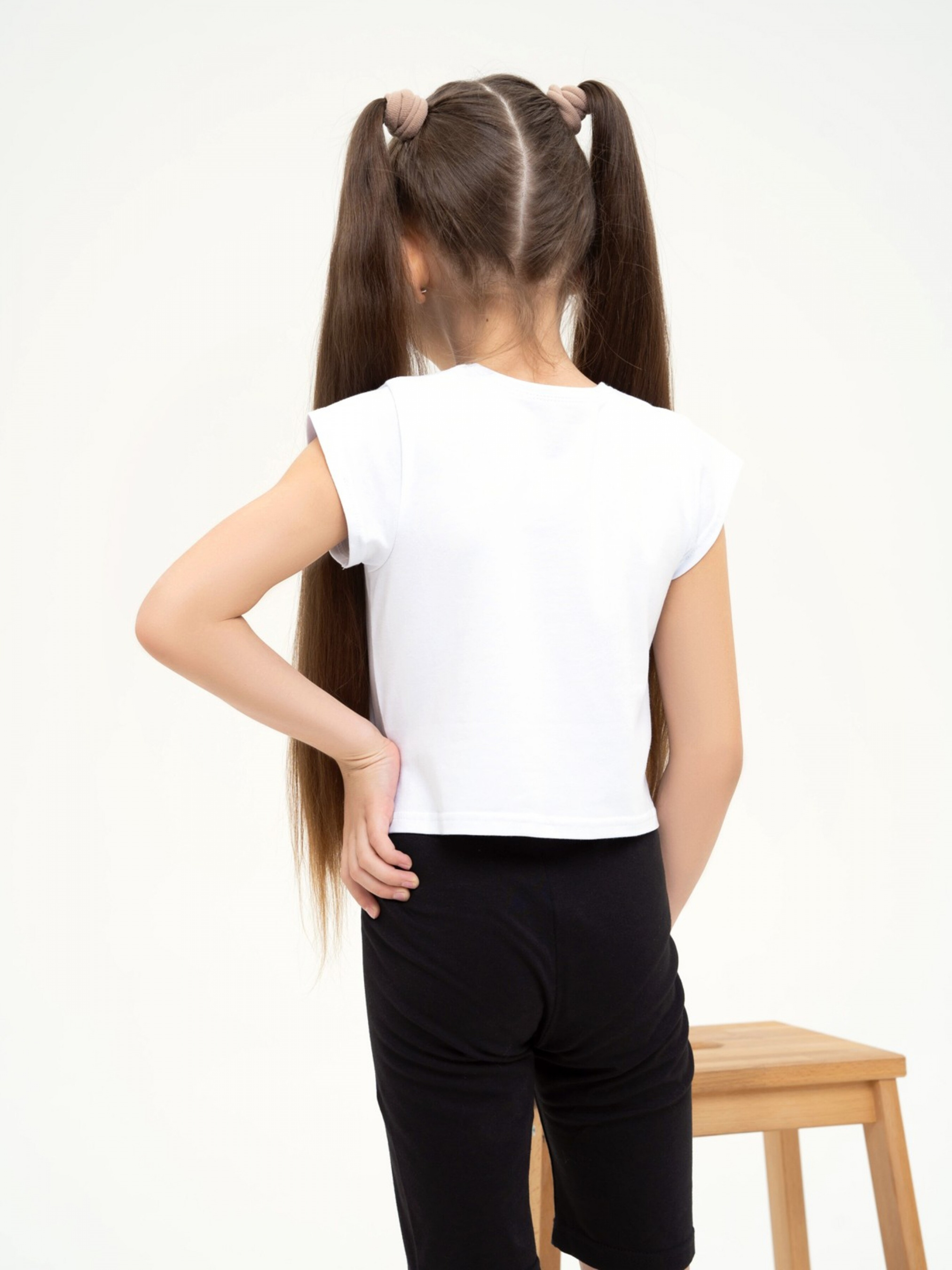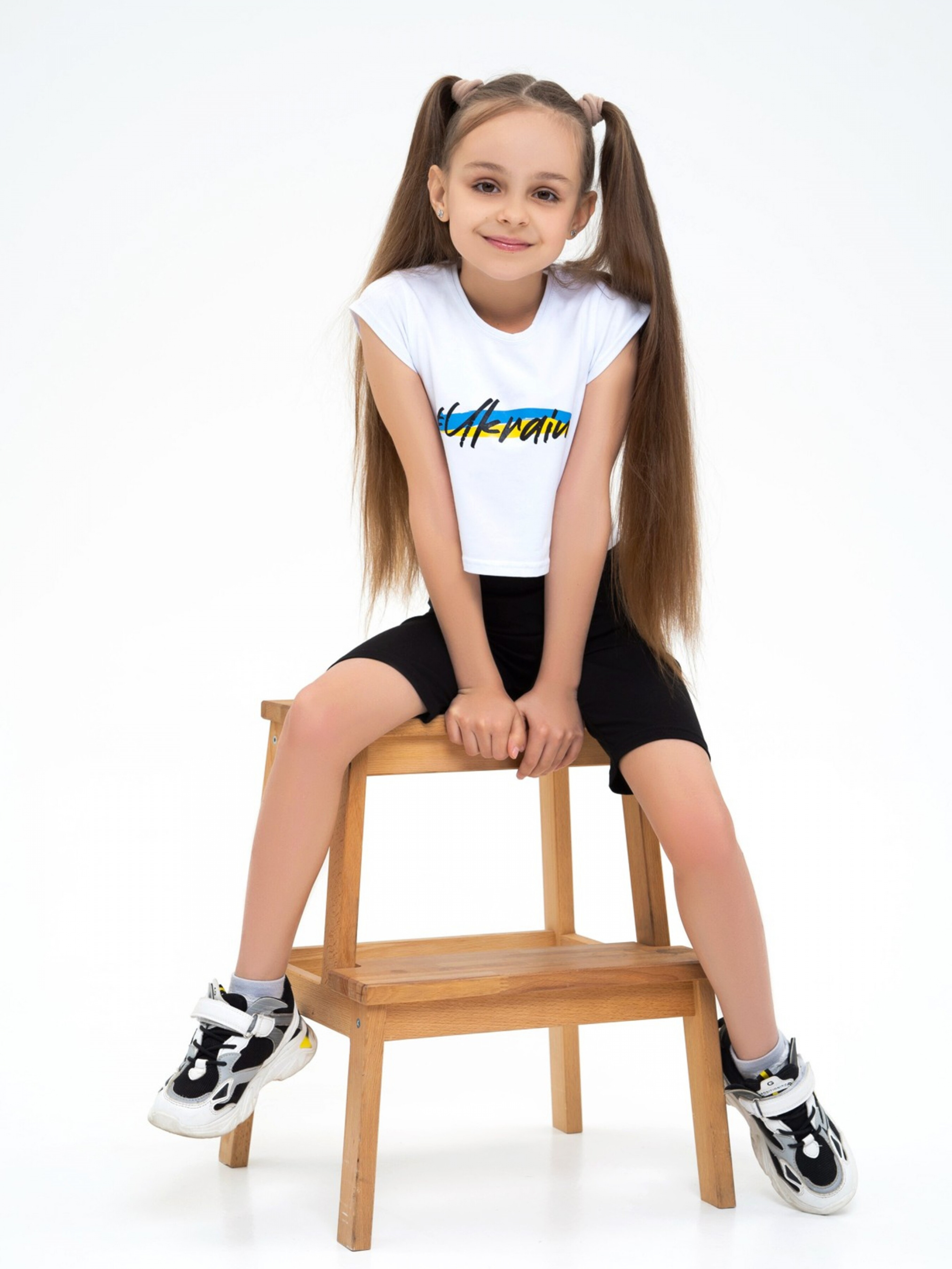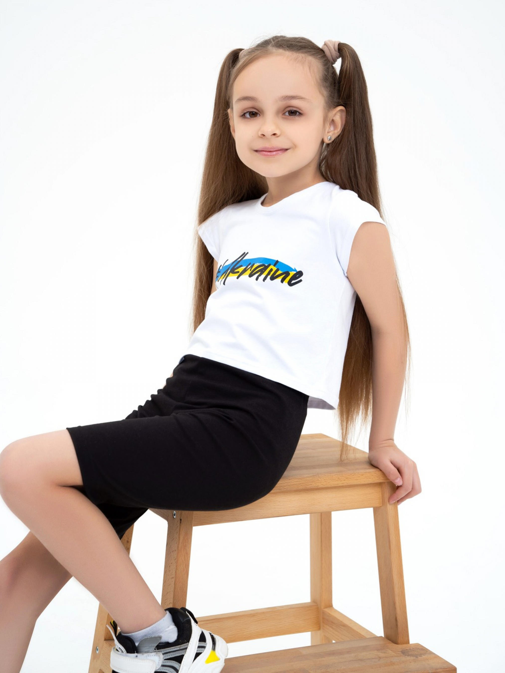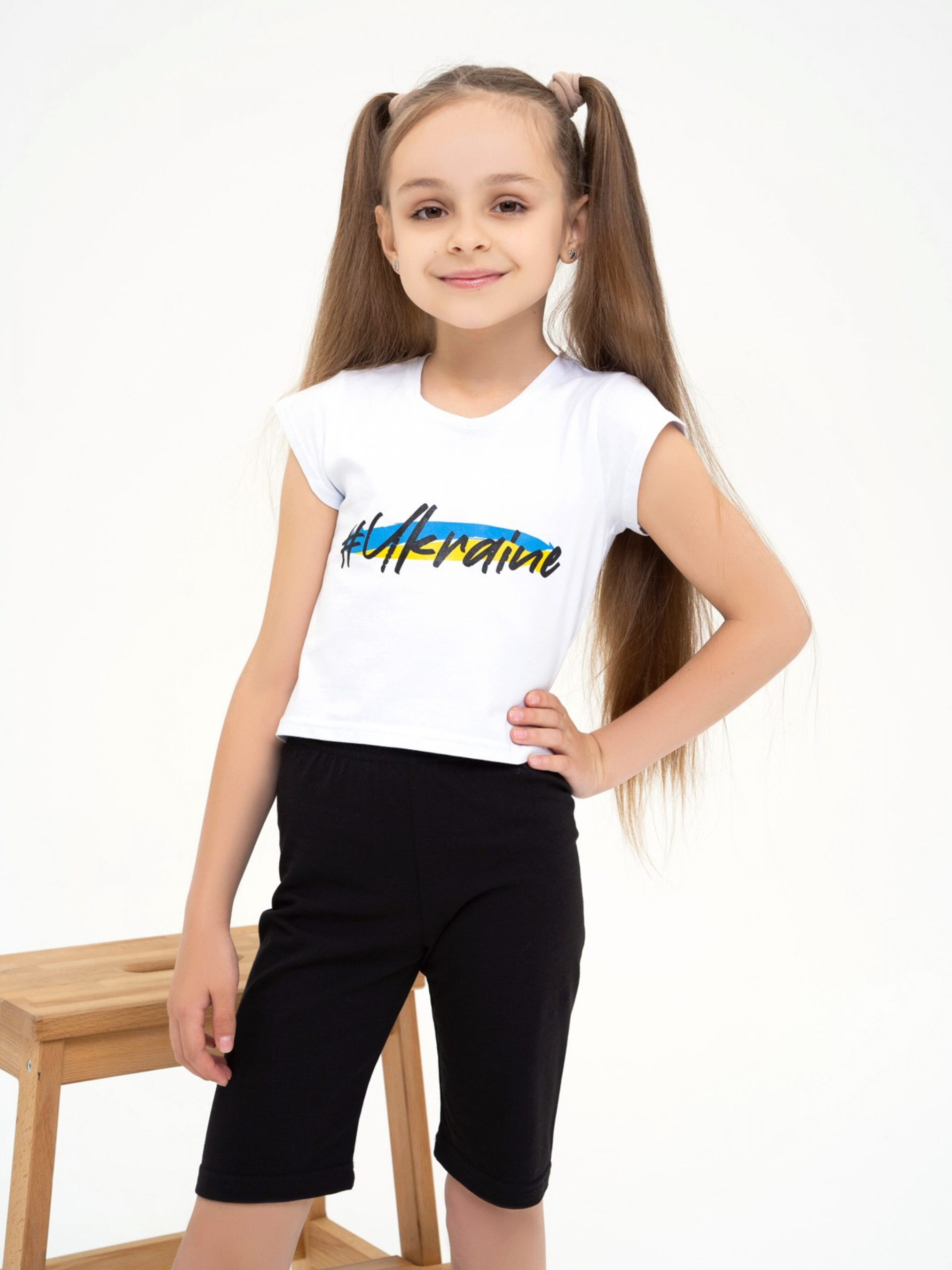 Білий топ з патріотичним написом. Склад: 100% хлопок. Матеріал: бавовна. Полуобхват: Грудь: 128 (32),134 (33), 140 (34), 146 (35), 152 (36), Длина виробу (128) - 33, Рукав - 6, Ткань - Висока еластичність.