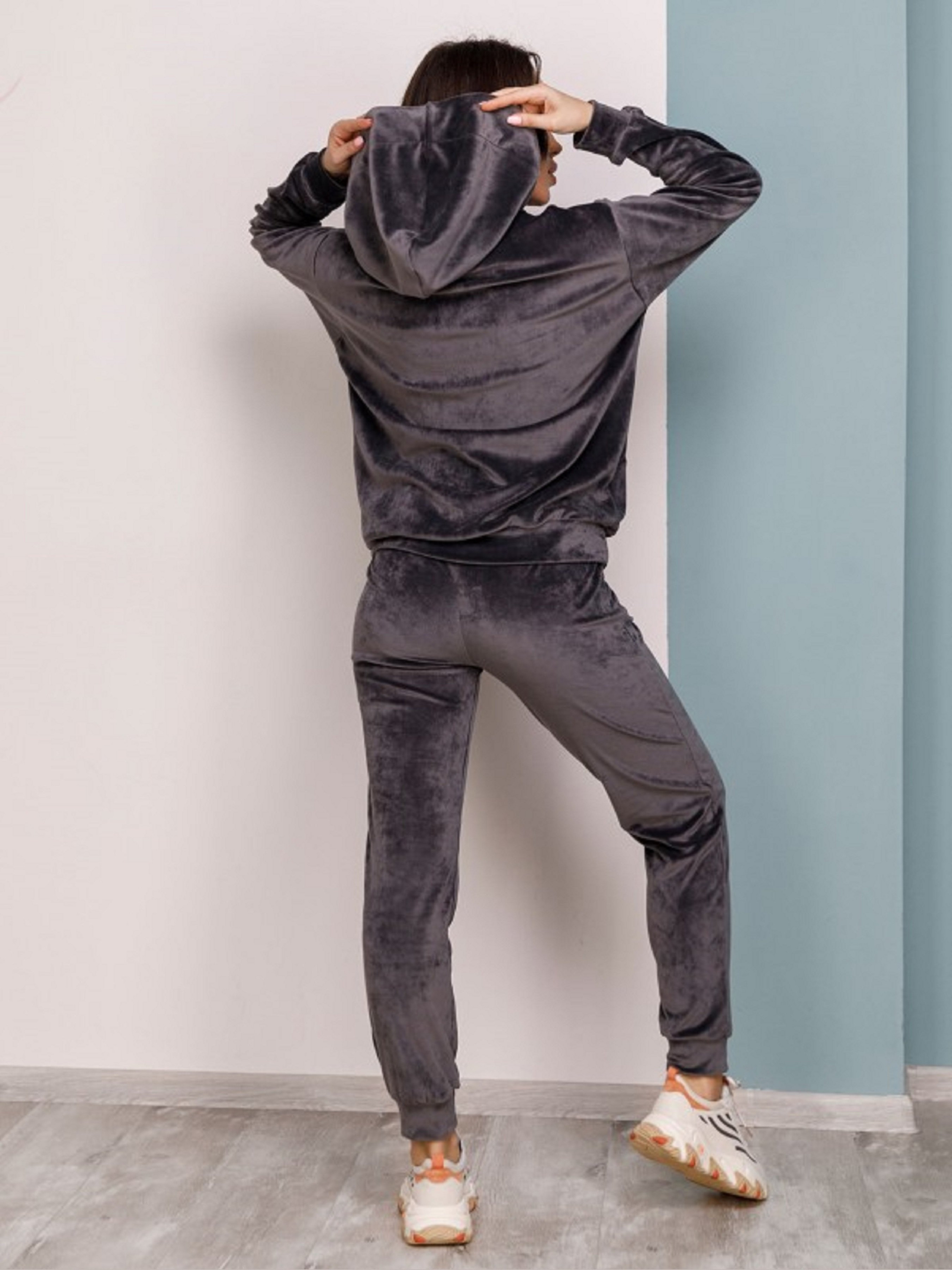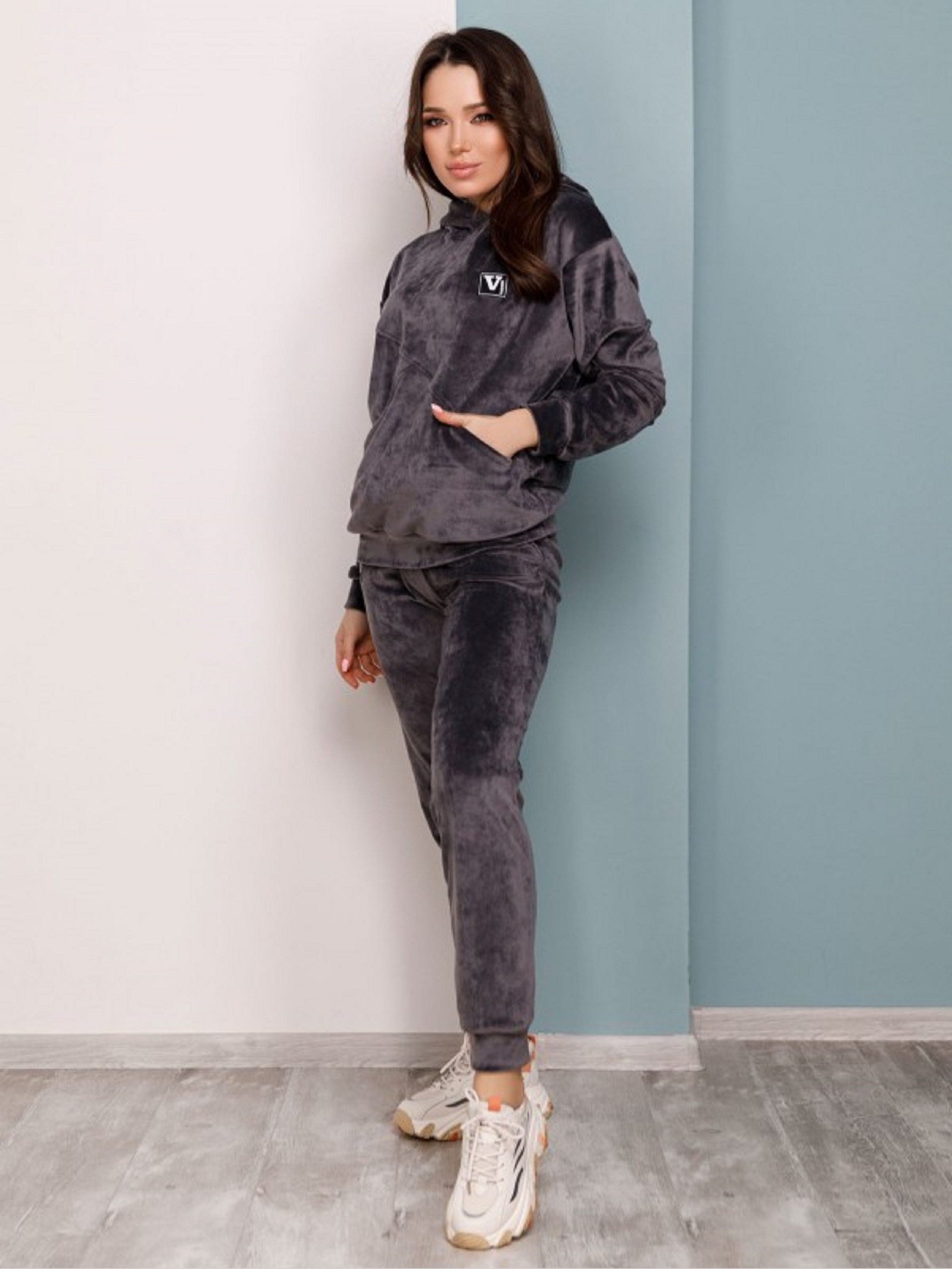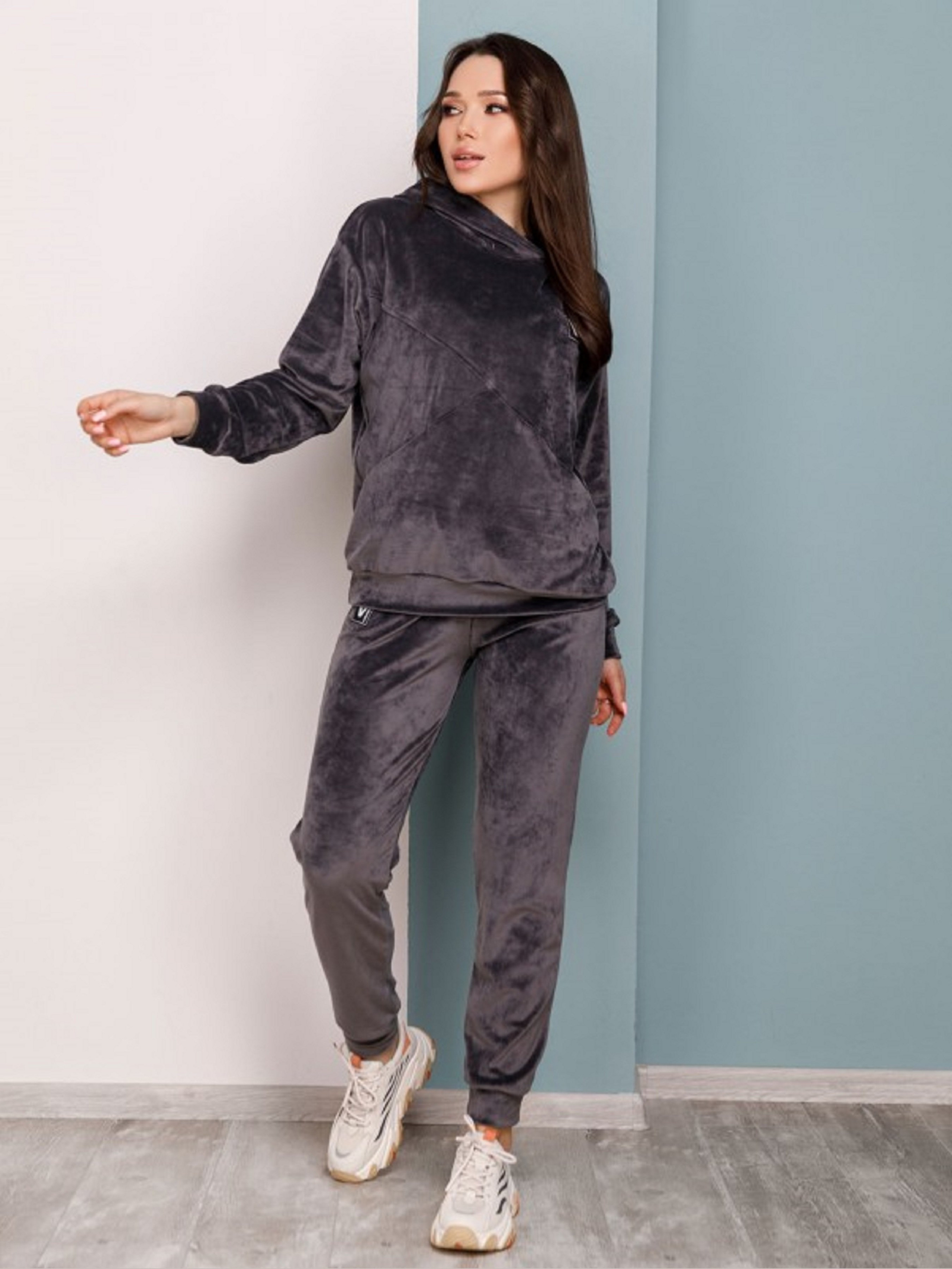 Cпортивний костюм з капюшоном та нашивкою виконаний з еластичного велюру. Худі прямого крою з кишенями та манжетами оснащені довгими рукавами. Штани прямого крою з манжетами та поясною гумкою оснащені бічними кишенями. Склад: 50% бавовна, 50% поліестер. Напівобхват: Кофта: Груди: S (57), M (59), L (61), XL (63), Довжина виробу - 63, Рукав - 54, Штани: Талія: S (29-35), M (31- 37), L (33-39), XL (35-41), Стегна: S (48), M (50), L (52), XL (54), Довжина виробу - 101, Довжина з внутрішнього шва - 74 .