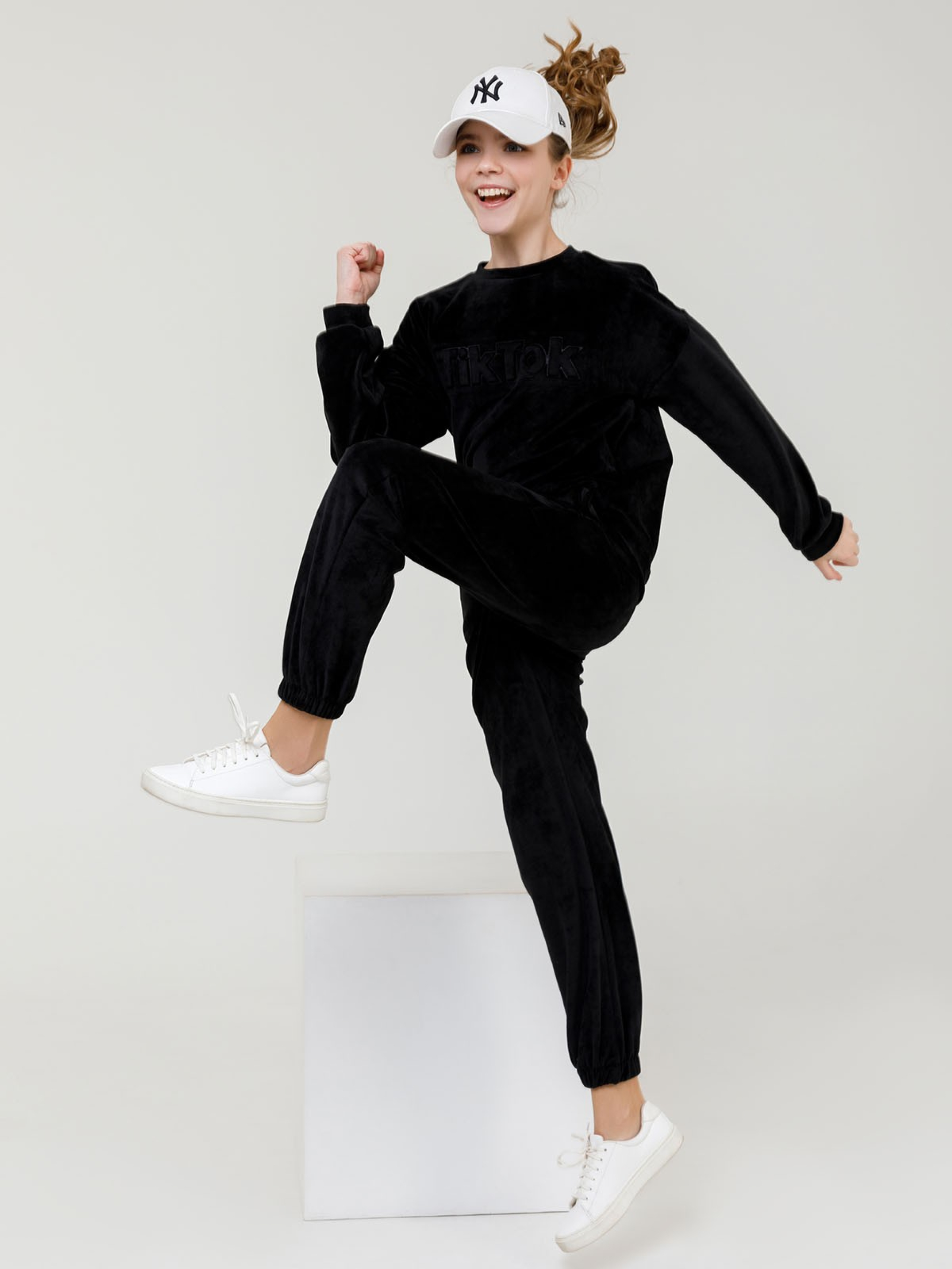 Чорний спортивний костюм виконаний з плюшевого велюру. Штани джоггери прямого крою з еластичними гумками і кишенями. Толстовка з манжетами і довгими приспущеними з пройм рукавами оснащена об'ємним написом. Матеріал: Велюр. Напівобхват: Кофта: Груди: 116 (35), 122 (37), 128 (39), 134 (41), 140 (43), 146 (45), 152 (47), 158 (49), довжина виробу - 41 , рукав - 35, Штани: Талія: 116 (25-31), 122 (26-32), 128 (27-33), 134 (28-34), 140 (29-35), 146 (30-36) , 152 (31-37), 158 (32-38), Стегна: 116 (33), 122 (35), 128 (37), 134 (39), 140 (41), 146 (43), 152 (45) ), 158 (47), довжина виробу - 69, довжина з внутрішнього шва - 50, Тканина: низька еластичність.