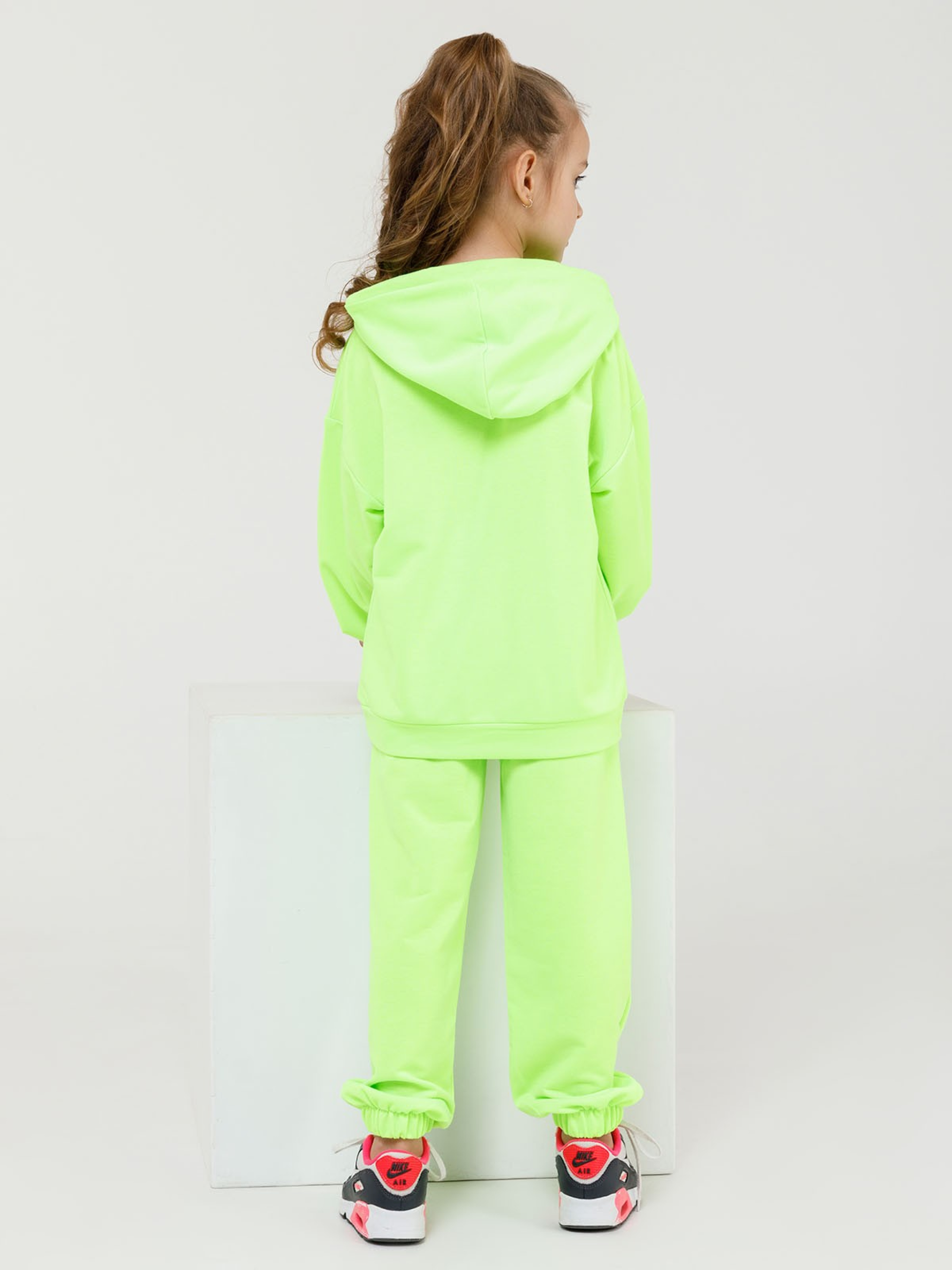 Демісезонний яскравий салатовий костюм з джоггерами виконаний з двухнітного трикотажу. Худі прямого крою з манжетами і фіксуючою тасьмою на капюшоні. Модель декорована принтом і оснащена кишенею. Штани на гумках з прямим кроєм і кишенями. Матеріал: Двунитка. Напівобхват: Кофта: Груди: 116 (39), 122 (41), 128 (43), 134 (45), 140 (47), 146 (49), 152 (51), 158 (53), довжина виробу - 46 , рукав - 31, Штани: Талія: 116 (26-31), 122 (27-32), 128 (28-33), 134 (29-34), 140 (30-35), 146 (31-36) , 152 (32-37), 158 (33-38), Стегна: 116 (35), 122 (36), 128 (37), 134 (38), 140 (39), 146 (40), 152 (41) ), 158 (42), довжина виробу - 69, довжина по внутрішньому шву - 49 ,Тканина: низька еластичність.