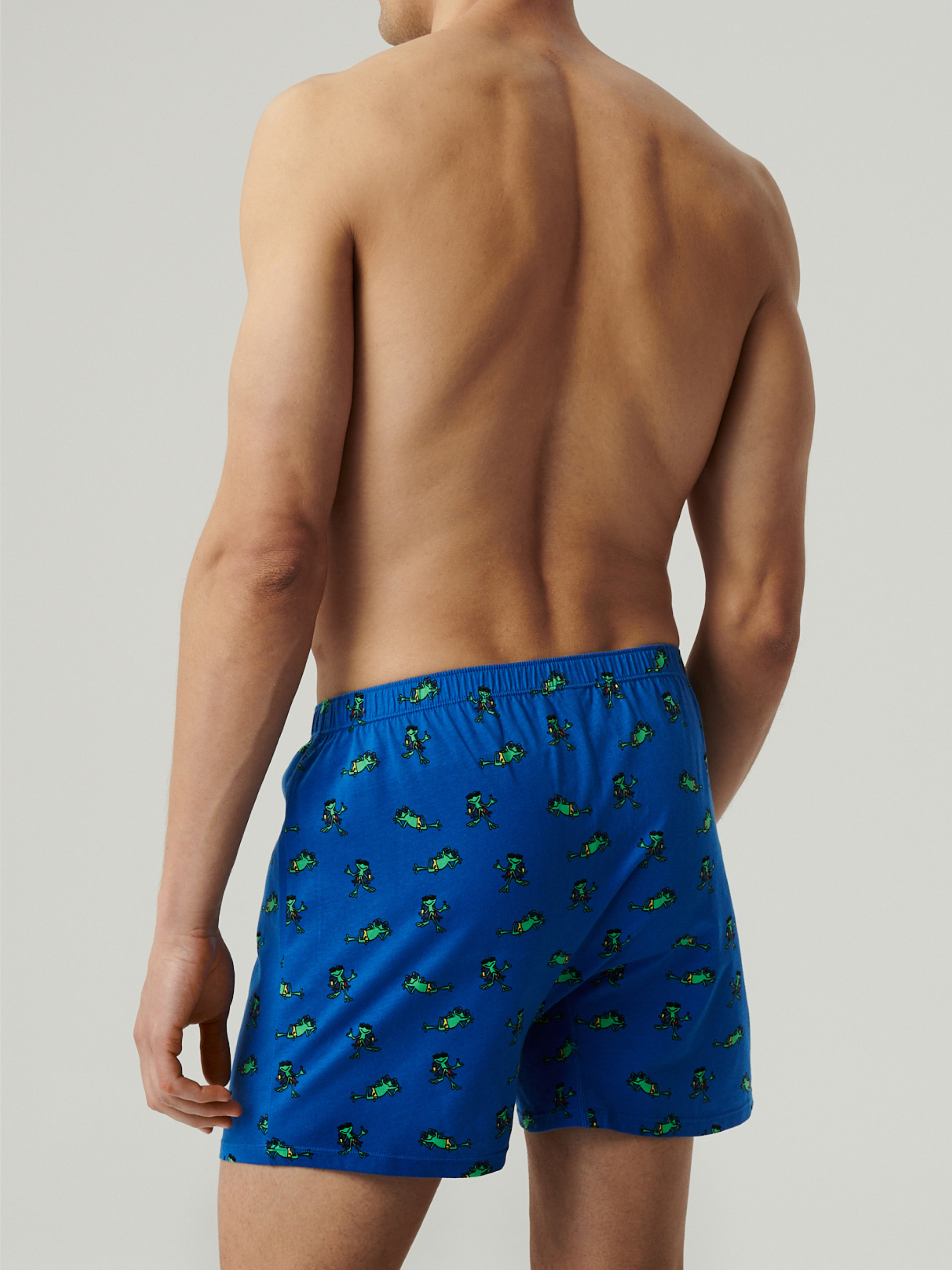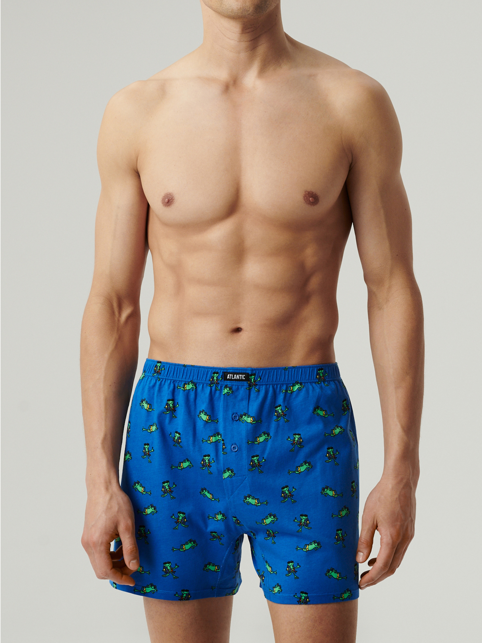Набір з 2 штук чоловічих трусів-боксерів Atlantic вільного крою Практичний та стильний набір чоловічих трусів вільного крою для повсякденного комфорту. У комплект входять дві пари боксерів: темно-синього та блакитного кольорів з яскравим та нестандартним принтом жабенята – для тих, хто цінує зручність та не боїться оригінальних деталей у білизні. Боксери виконані зі 100% бавовни — натурального матеріалу, що дихає, який м'яко прилягає до шкіри і забезпечує комфорт протягом усього дня. Вільний крій не сковує рухів і особливо підходить тим, хто віддає перевагу просторій спідній білизні. Труси добре тримають форму після прання, не втрачаючи кольору та м'якості. Еластична, але не туга резинка забезпечує надійну посадку без тиску. Особливості: Комплект з 2-х штук: темно-синій та блаикитний кольори Вільний крій для максимального комфорту Оригінальний принт Натуральна 100% бавовна Зручна посадка та м'яка резинка Ідеальний вибір для дому, сну чи повсякденного використання.