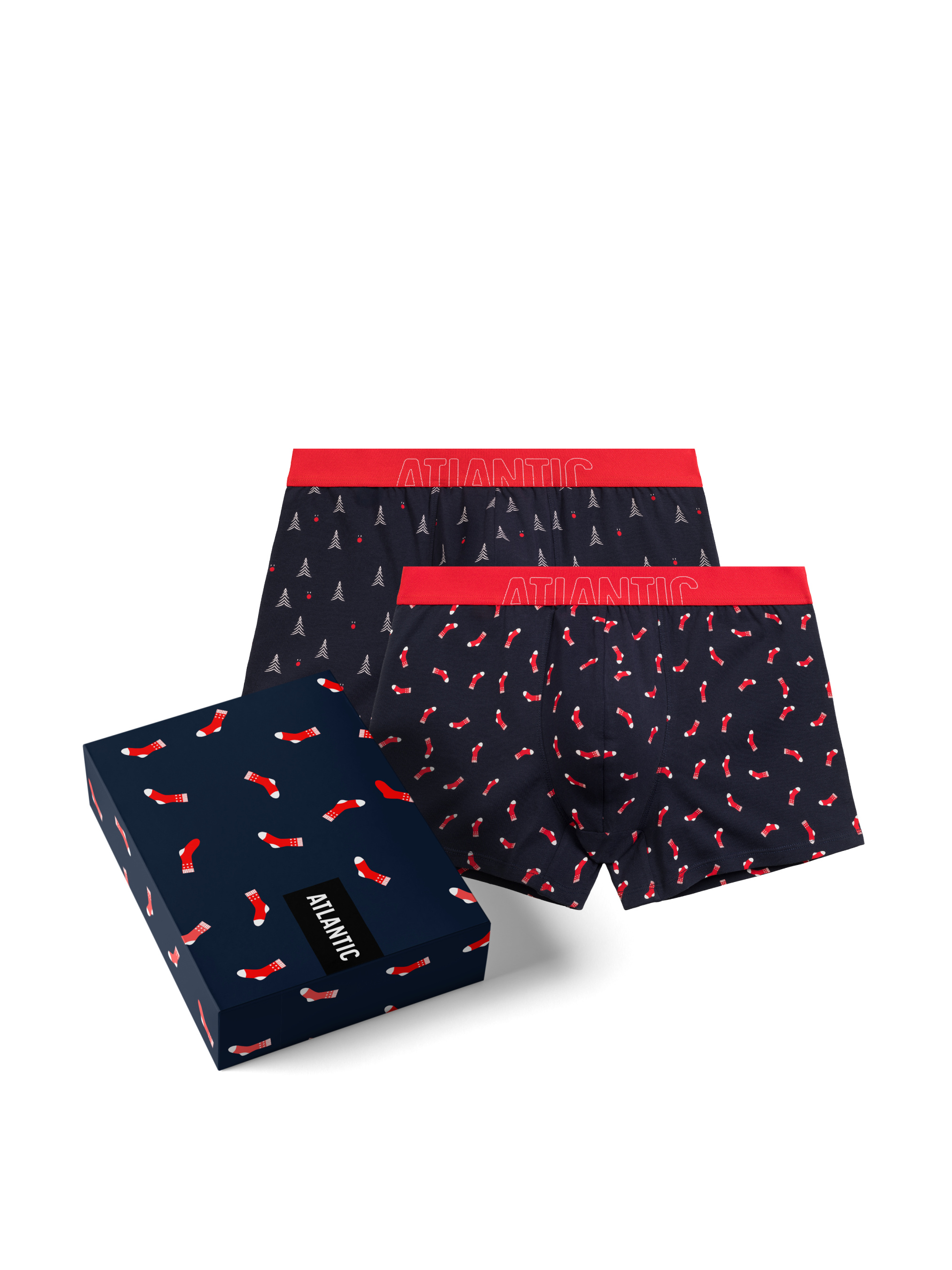 Подарунковий набір чоловічих трусів-шорт Atlantic Подарунковий набір чоловічих трусів-шортів з м'якої бавовни - стильне та практичне рішення для новорічного сезону. У комплект входять дві пари трусів зі святковими принтами: одні прикрашені малюнком новорічних шкарпеток, другі – ялинками, що створюють святковий настрій. Модель виконана з натуральної бавовни, яка приємна до тіла і забезпечує комфорт протягом усього дня. М'яка зовнішня резинка з логотипом бренду надійно фіксує труси на талії, не стискаючи і не натираючи. Особливості моделі: Натуральна бавовна - матеріал, що дихає і приємний до тіла; Зручний крій, який не обмежує рухів; М'яка зовнішня резинка з логотипом; Два оригінальні новорічні принти в наборі; Упаковані в подарунковій коробці – готові до вручення. Подарунковий набір боксерів Atlantic – відмінний вибір для тих, хто цінує комфорт та настрій свята у кожній деталі.