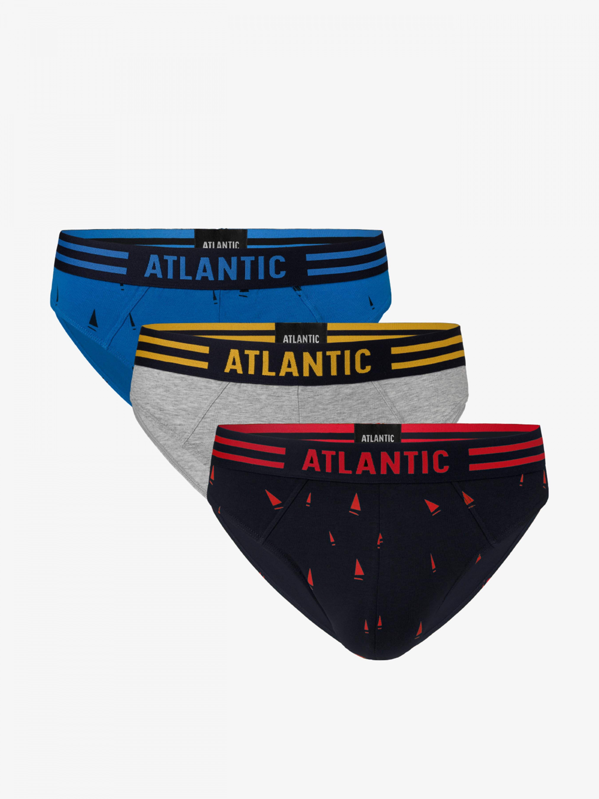 Набір з 3 шт. чоловічих трусів Atlantic в кольорах: блакитний, сірий меланж і темно-синій. У набір входять: 1 однотонна модель і 2 моделі з контрастним принтом вітрильників. Труси-сліпи з широкою зовнішньої резинкою чорного кольору, на якій зображені великий напис ATLANTIC і дві контрастні смужки. Труси-сліпи спортивного крою із заниженою талією, стандартною бічною частиною і профільованим кроєм. Такий крій забезпечить комфорт, зручність і свободу рухів, а також ідеальне прилягання до тіла. Труси виготовлені з м'якої і приємної на дотик бавовни у поєднанні з еластаном. Матеріал стійкий до високих температур, не розтягується, не втрачає форму і колір. Основні характеристики моделі: • спортивний крій • низька посадка і універсальна ширина бічної частини • зовнішня еластична резинка • максимальний комфорт • високоякісна бавовна