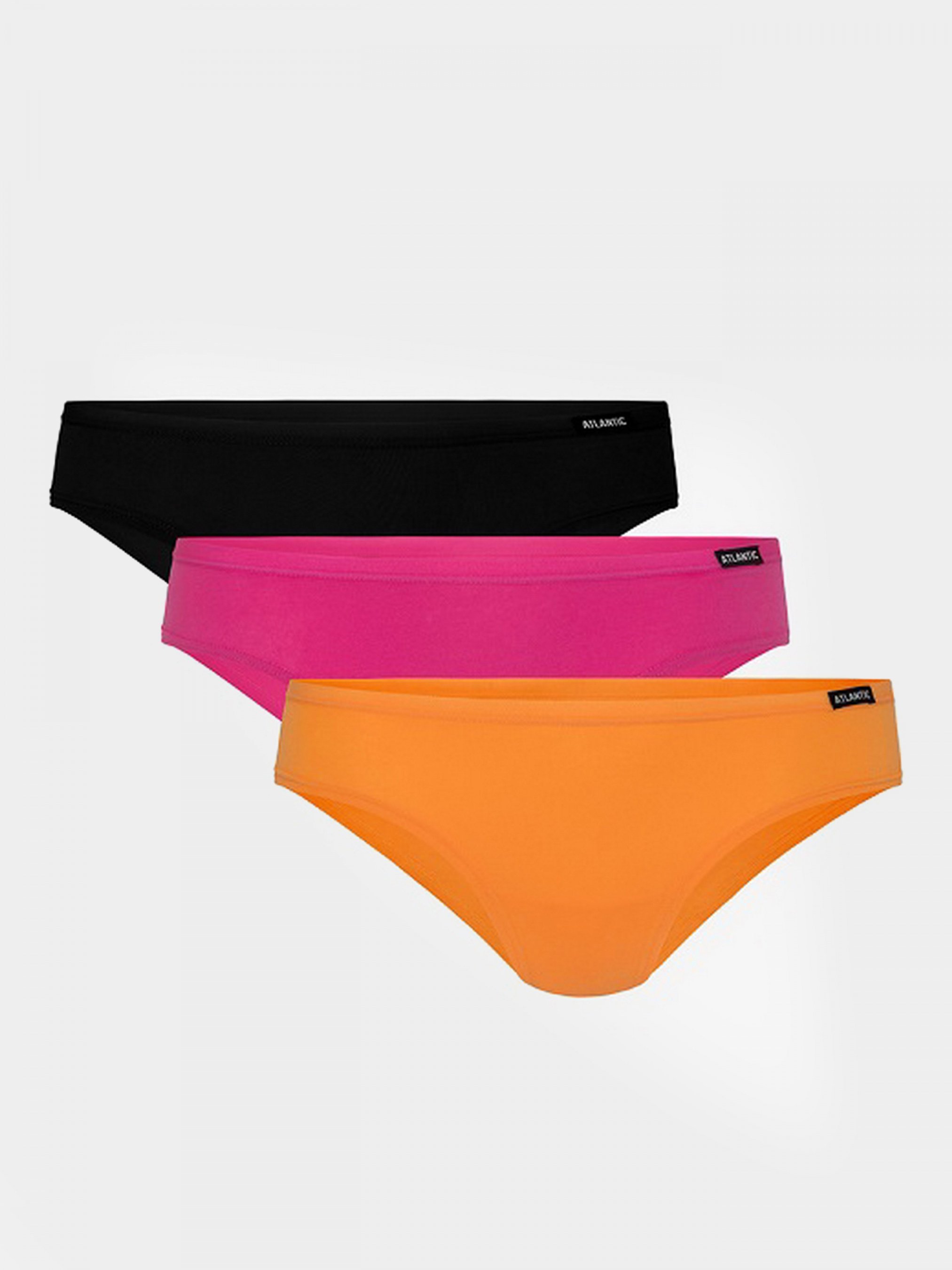 Набір жіночих трусів Atlantic, модель Бікіні. У наборі 3 однотонних трусів наступних кольорів: темно-синій, рожевий та помаранчевий. Труси-бікіні характеризуються заниженою талією з невеликим логотипом ATLANTIC і універсальною бічною частиною. Нижня білизна виготовлена з м'якої на дотик і легкої тканини, яку ми називаємо thin & light (тобто тонка і легка), що є поєднанням бавовни та еластану. Труси ідеально облягають тіло та забезпечують максимальний комфорт. Основні характеристики: ідеально на кожен день гарно сидять на фігурі легкий і приємний на дотик трикотаж забезпечення максимального комфорту