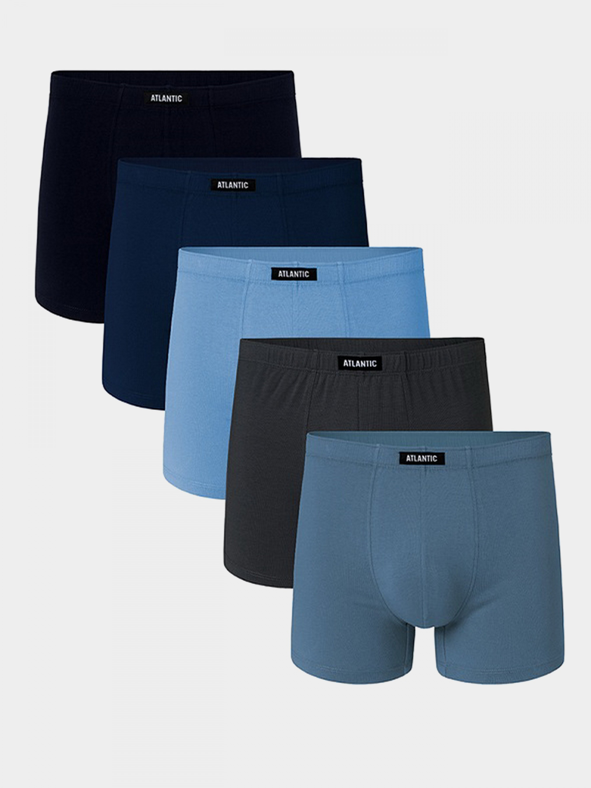 Набір чоловічих трусів-шорт Atlantic. У наборі 5 одиниць білизни у наступних кольорах: темно-синій, темно-блакитний, світло-блакитний, графітовий, блакитний. Модель виконана в спортивному дизайні – для моделі характерні занижена талія, профільований крій, універсальна довжина штанин. В області талії м'яка, не стискаюча тіло, внутрішня (тунельна) резинка. Шорти гарантують найвищий рівень комфорту та необмежену свободу рухів, а також ідеальну посадку та щільне прилягання до тіла. Нижня білизна виконана з якісної, приємної на дотик бавовни. Перевага бавовни - стійкість до високих температур та розтягування. Таким чином, білизна надовго зберігає свої унікальні властивості. • спортивний крій • занижена талія та універсальна довжина штанини • м'яка внутрішня резинка • високоякісна бавовна • максимальний комфорт