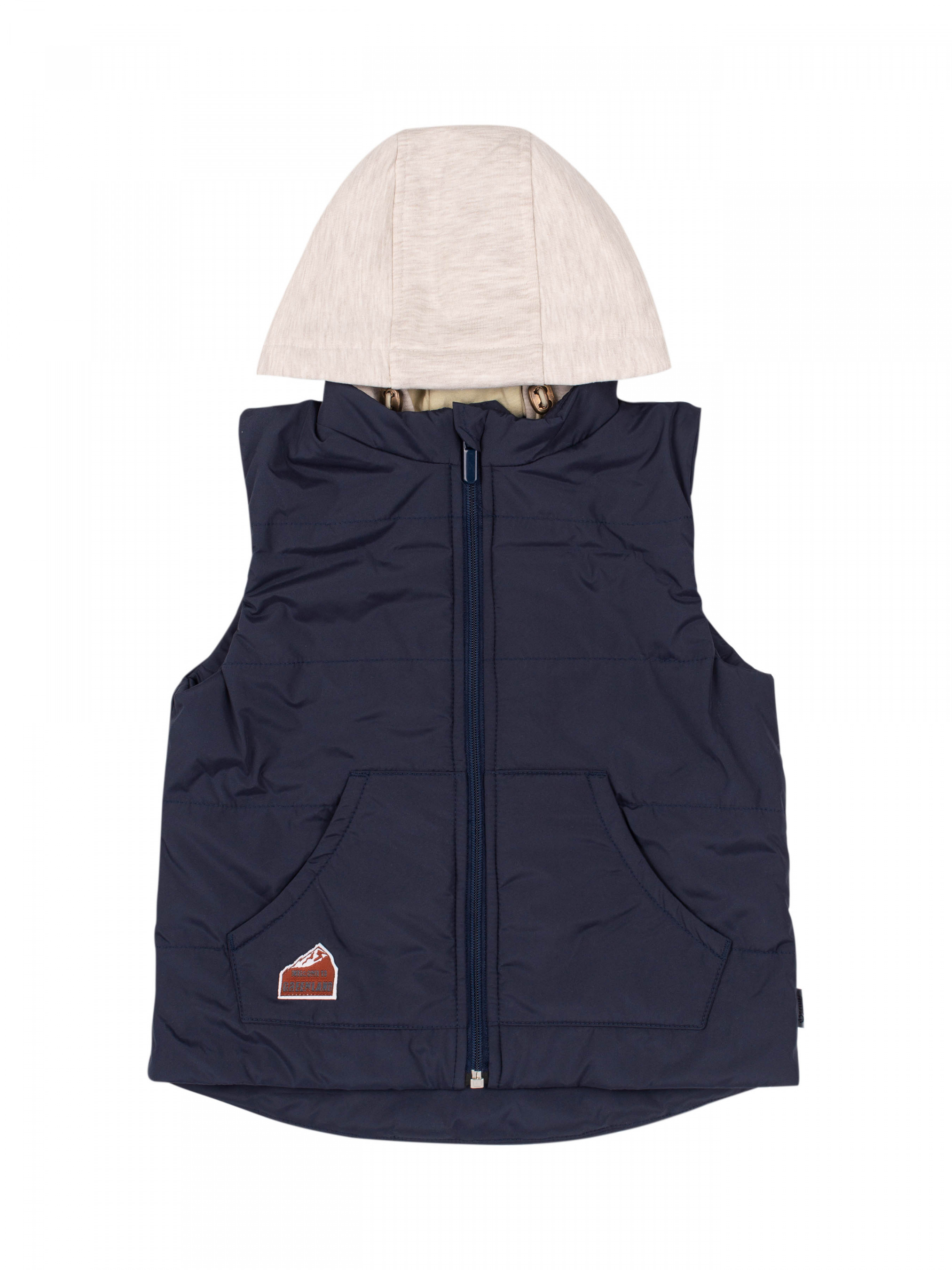 Жилет для хлопчика демісезонний, верх з водовідштовхувальної плащівки, підкладка бавовняна. Вся модель зшита на утеплювачі «Comforlight». Застібається на блискавку, має елемент із захистом підборіддя, вшивні кишені центральні. Капюшон з регулюючим еластичним шнурком на фіксаторах.