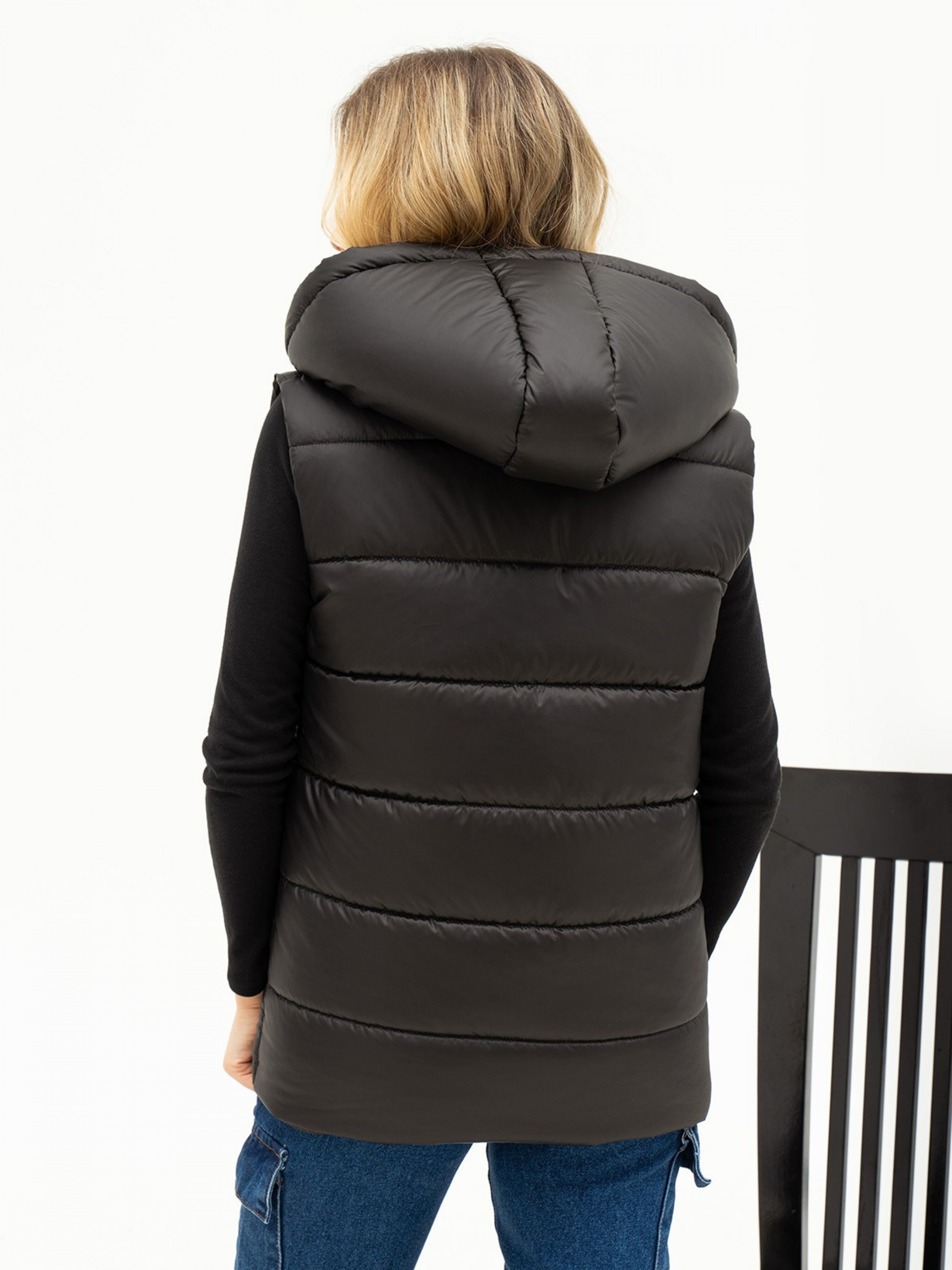 Утеплена повсякденна жилетка виконана з плащової тканини на синтепоні чорного кольору. Модель на блискавці оснащена каптуром та кишенями. Склад: 100% поліестер. Матеріал: Плащівка на синтепоні. Напівобхват: Груди: S (52), M (54), L (56), XL (58), Довжина виробу - 64, Тканина: Низька еластичність.