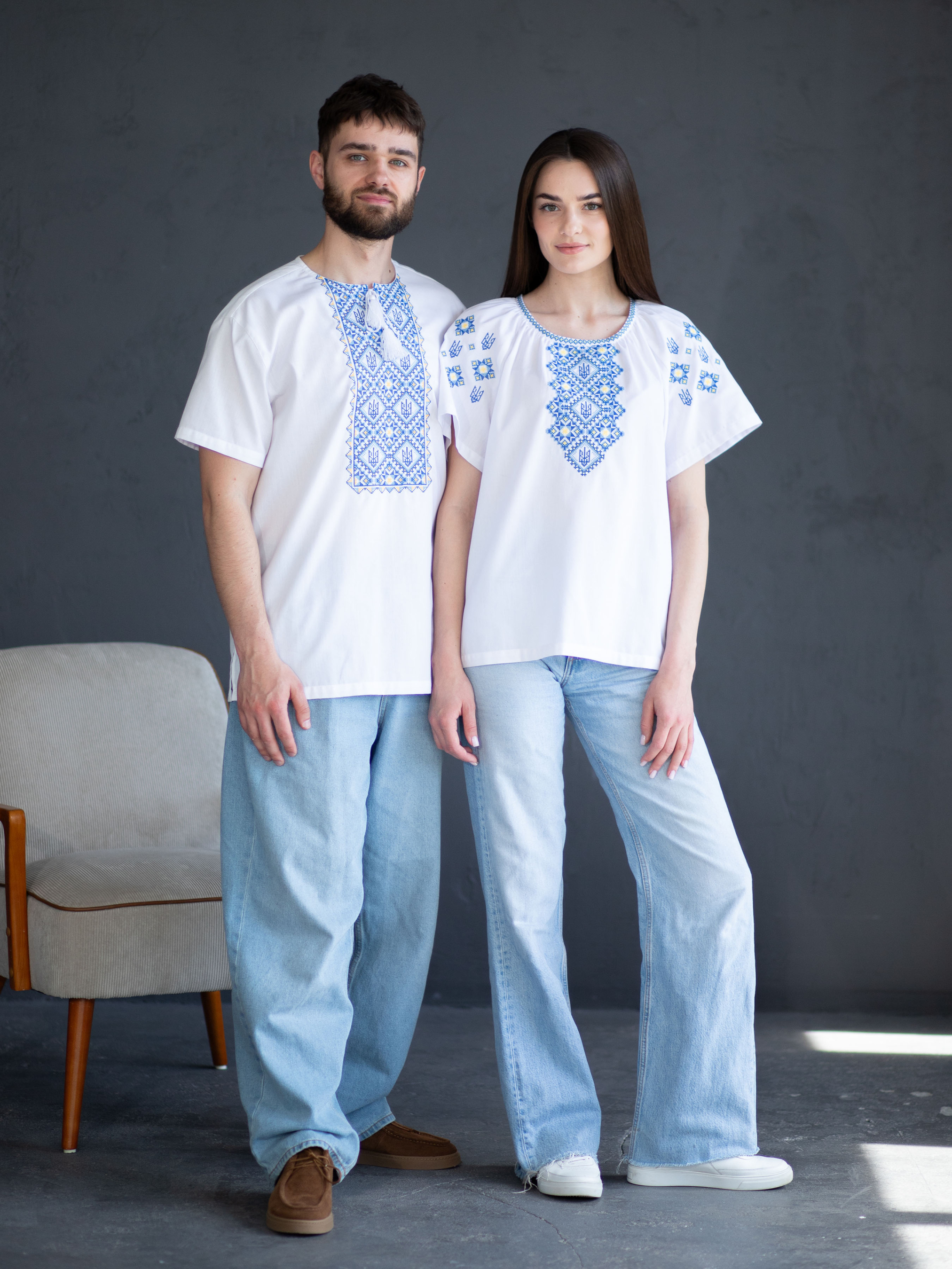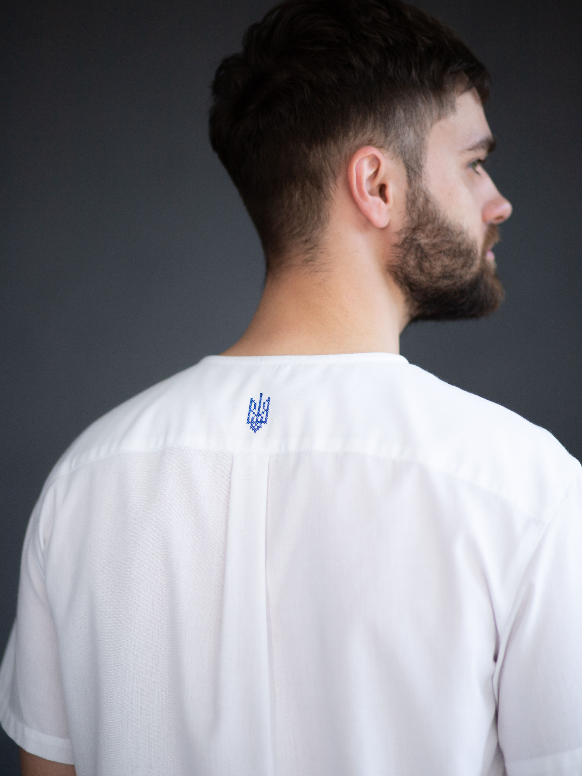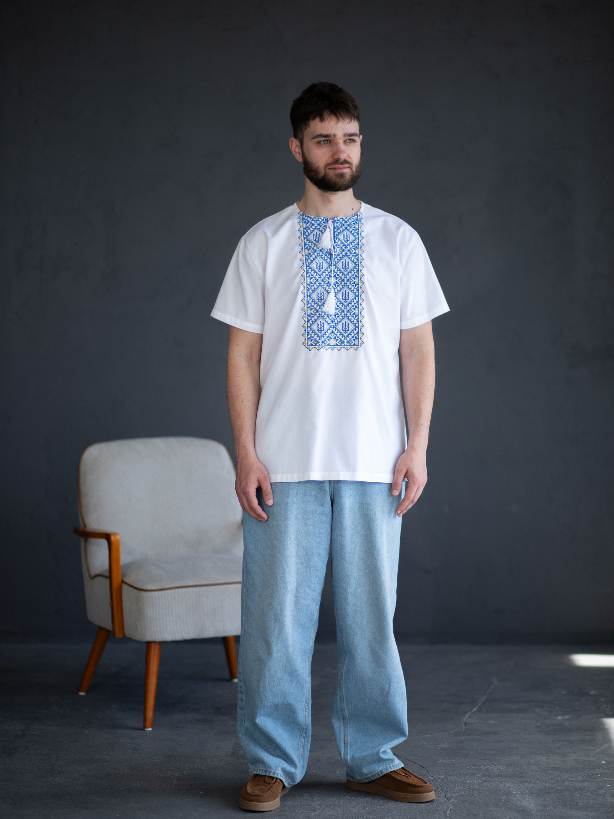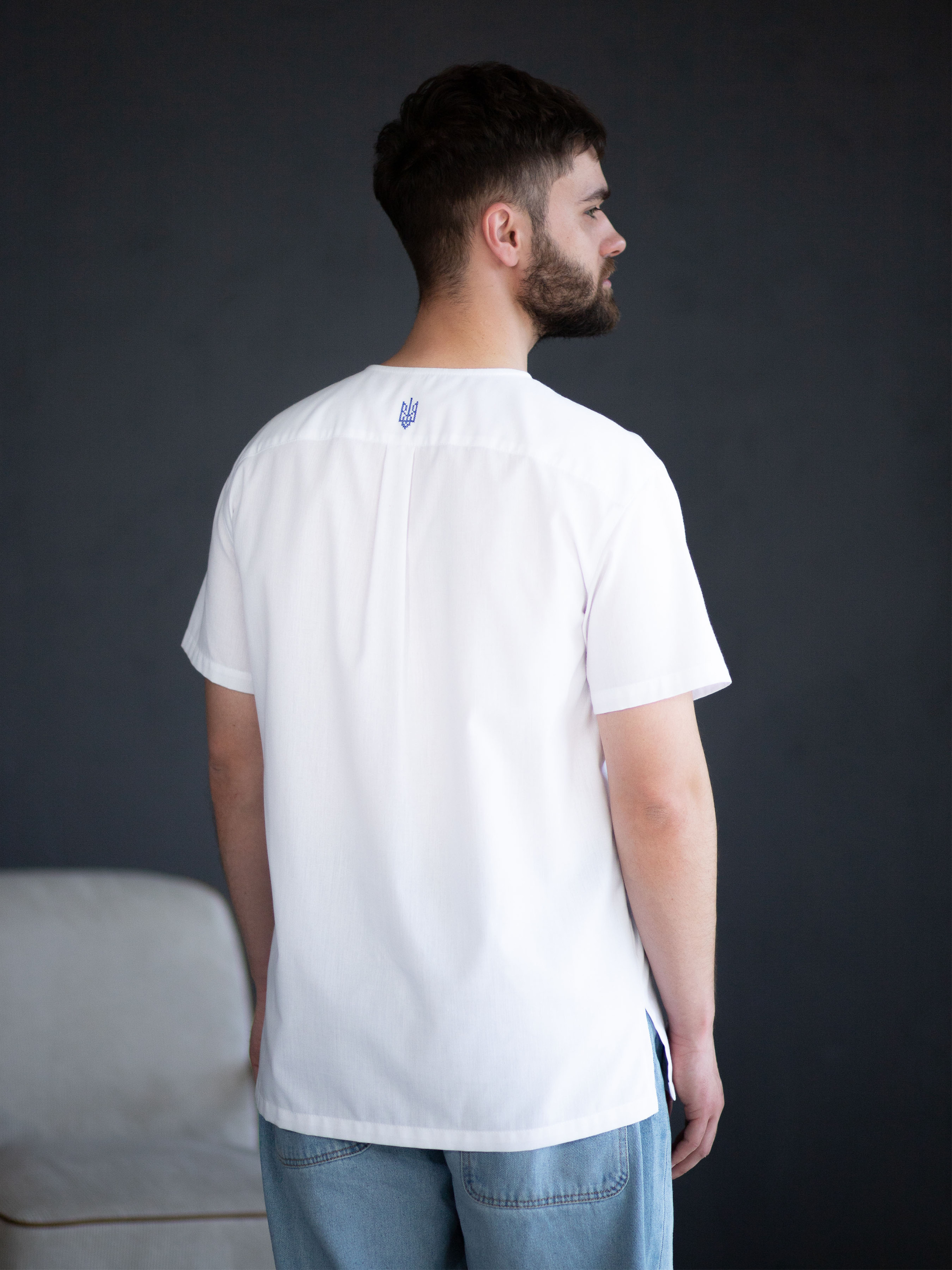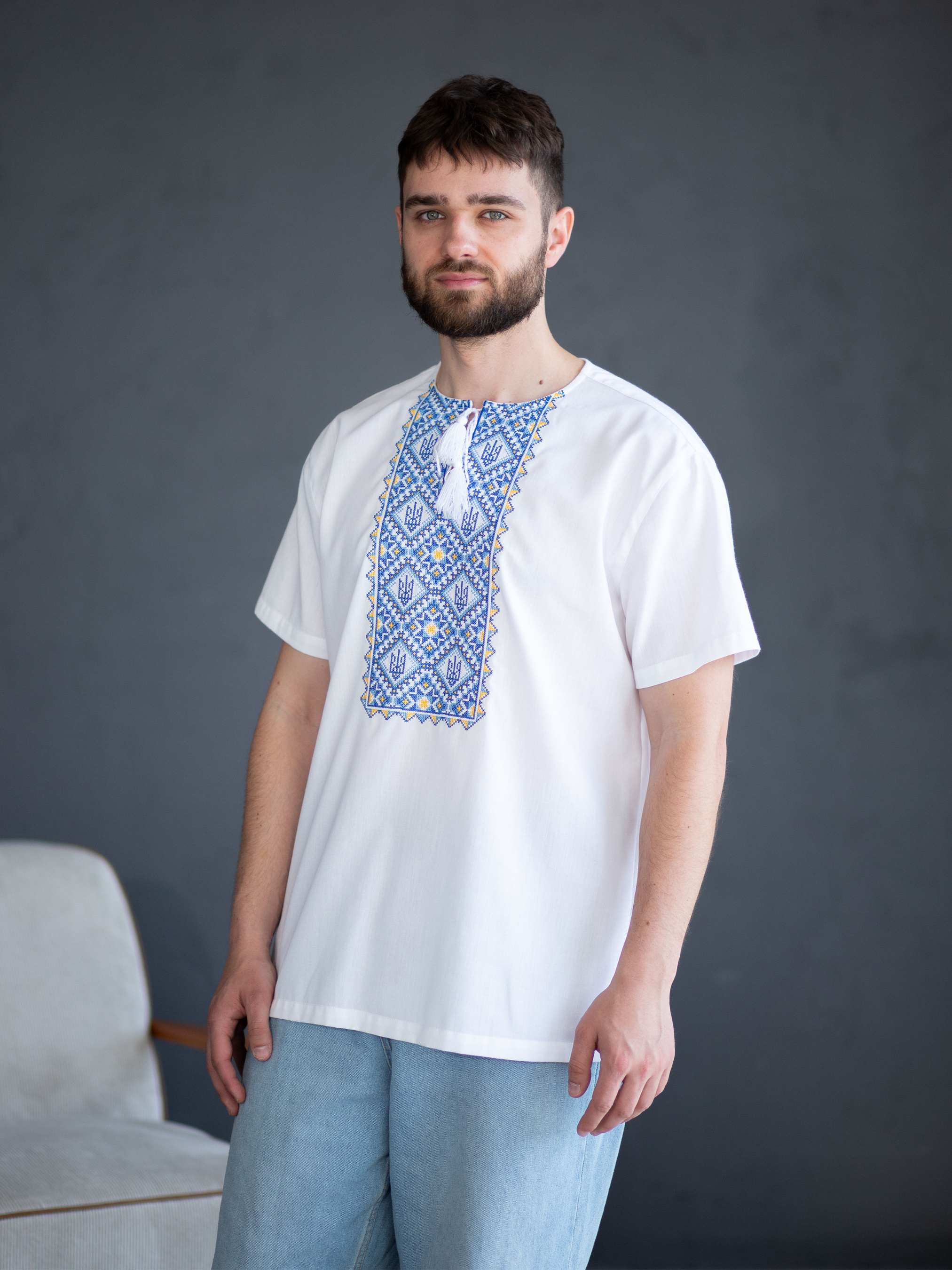 Ця чоловіча сорочка з коротким рукавом — сучасна інтерпретація національного стилю, де зручність поєднується з глибокою символікою. Виготовлена з поліестеру та бавовни, вона більш зносостійка, ніж сорочки з натуральної тканини, і довше зберігає охайний вигляд. Біла основа контрастує з вишивкою у насичених синьо-жовтих відтінках, які нагадують кольори українського прапора. Стилізовані тризуби вписані в ритмічний орнамент з ромбів, що символізують захист, гармонію та зв’язок поколінь. Прямий крій створює більш вільний силует, ніж класичні сорочки, а відсутність коміра додає сучасності. Така модель стане кращим вибором для тих, хто шукає баланс між традиційністю й актуальністю.