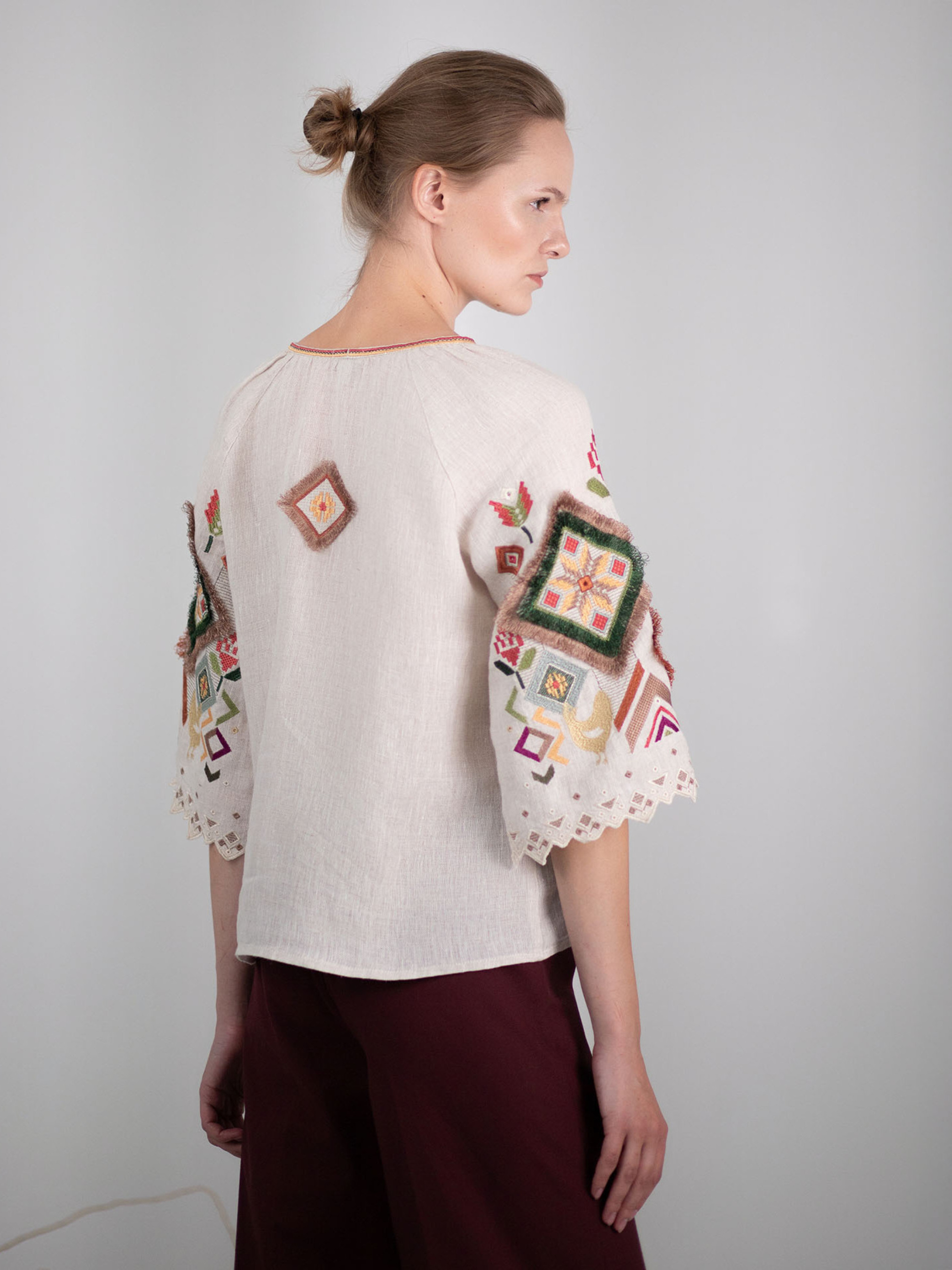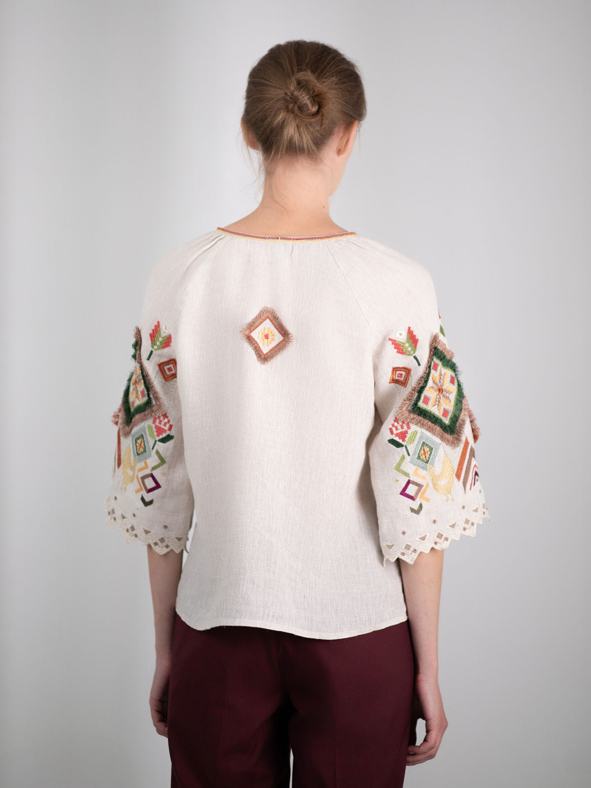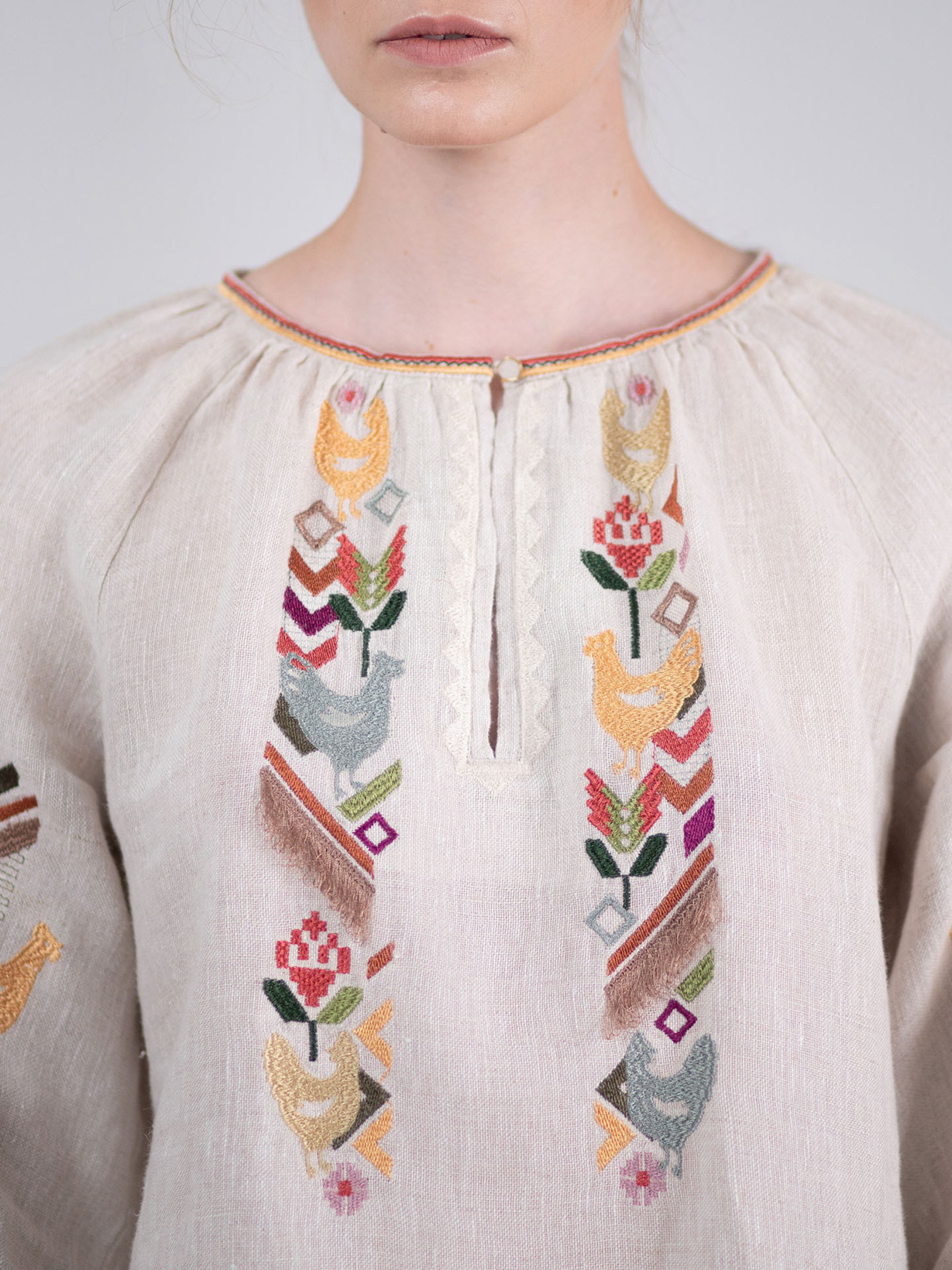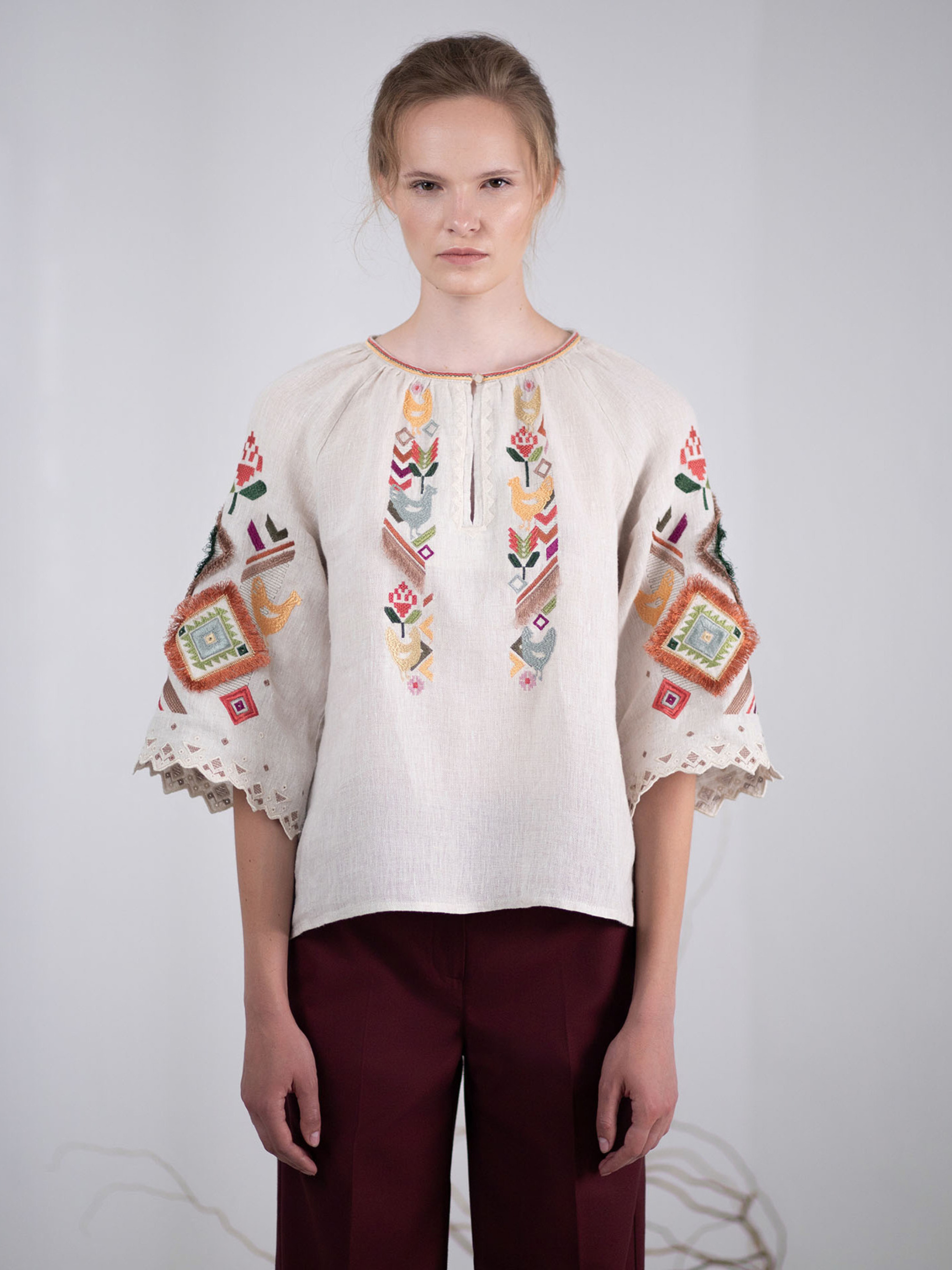 Ця жіноча вишиванка — ніжне втілення української естетики, натхненної природою, символами родючості та домашнього тепла. Виготовлена зі 100% льону, вона має приємну до тіла текстуру, чудово дихає і дарує відчуття легкості навіть у найспекотніші дні. Лляний колір полотна створює враження натуральності й витонченості, а вільний крій додає комфорту та природної грації. Вишивка — справжня поема в кольорі. На грудях — вертикальні ряди птахів, квітів і стилізованих гілочок, виконані в теплих тонах охри, бордо, зелені й теракоти. Символіка візерунків — це благополуччя, продовження роду, життєва сила. Основний акцент зосереджений на рукавах: розкішна геометрична вишивка поєднується з мереживною обробкою, створюючи ефект витонченої ручної роботи, що водночас виглядає сучасно. Ця вишиванка чудово пасуватиме як до класичних лляних спідниць, так і до джинсів, легко доповнюючи як святкові, так і буденні образи.